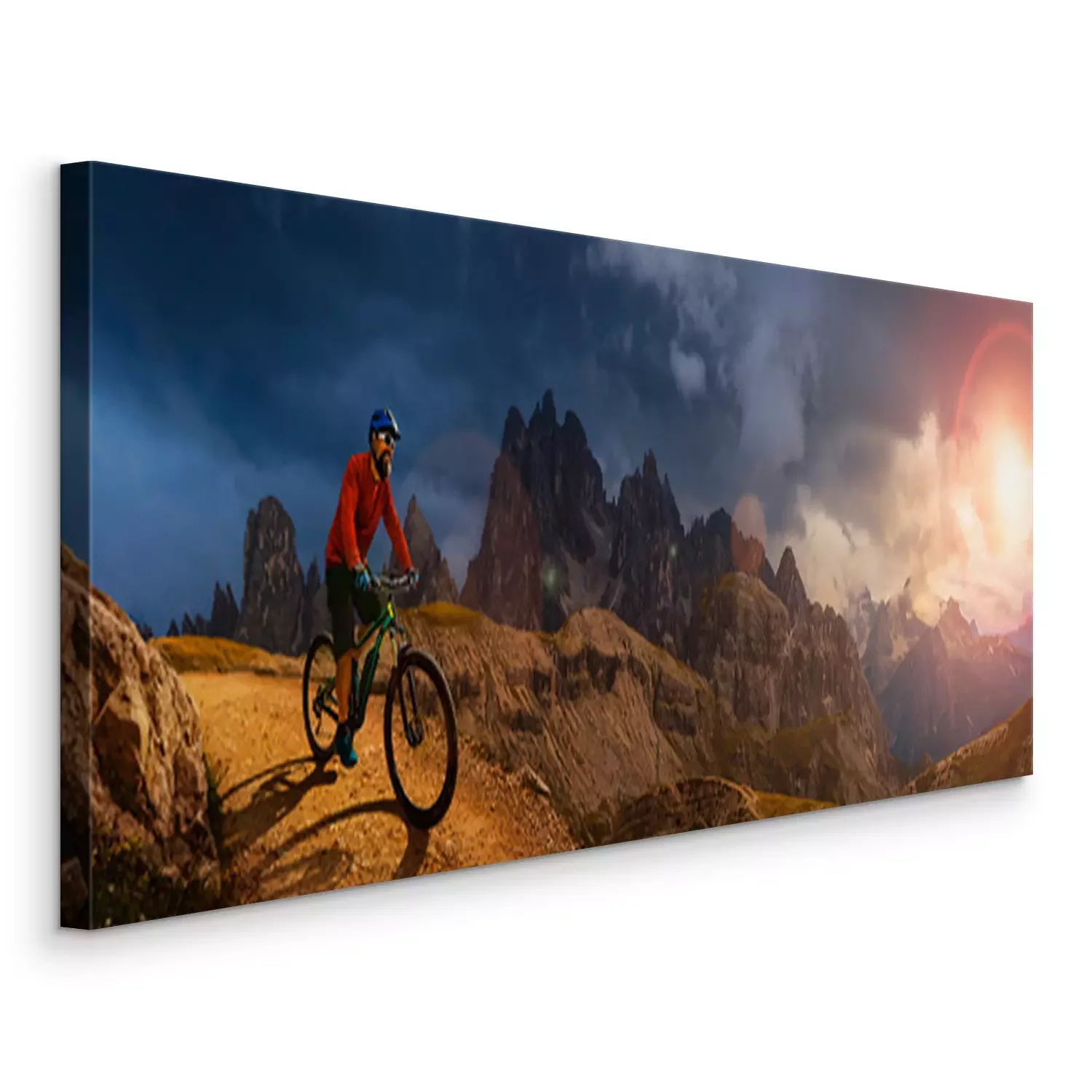 Tableau  Man cycling on electric bike, rides mountain trail. Man riding on bike in Dolomites mountains landscape. Cycling e-mtb enduro trail track. Outdoor sport activity.