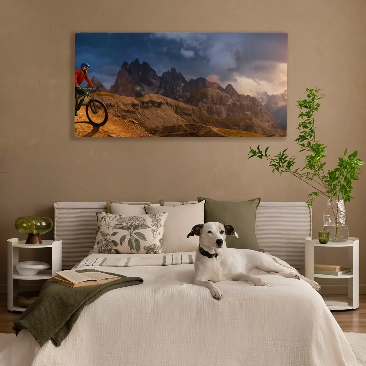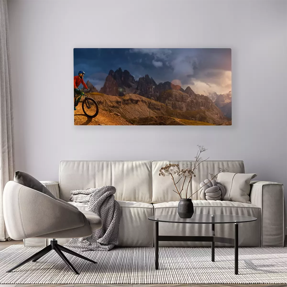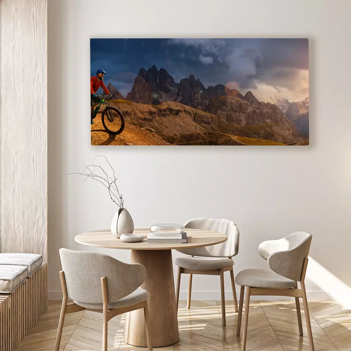 Tableau : Man cycling on electric bike, rides mountain trail. Man riding on bike in Dolomites mountains landscape. Cycling e-mtb enduro trail track. Outdoor sport activity.