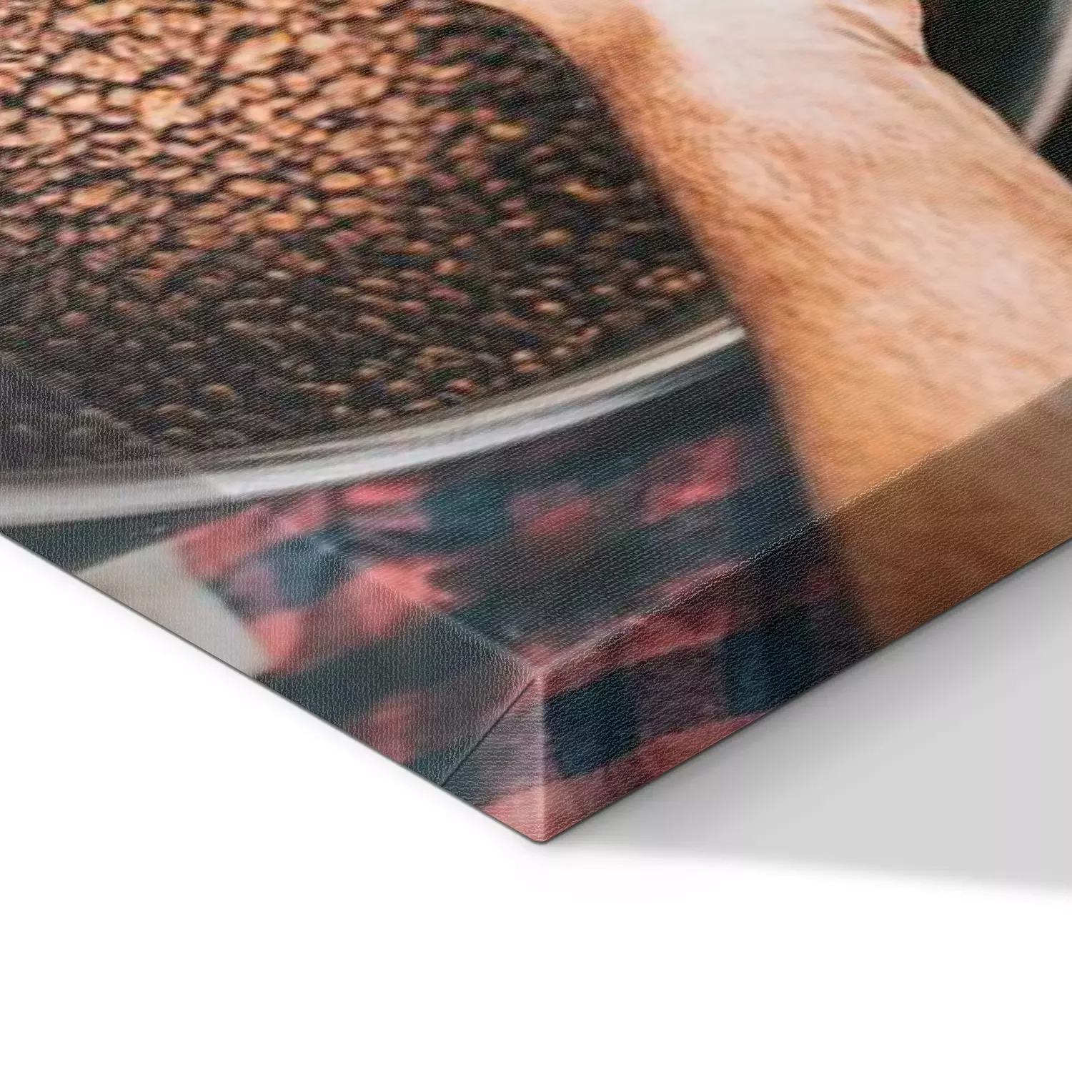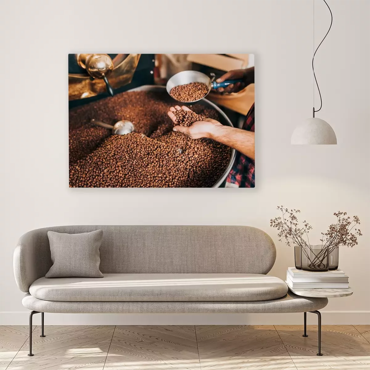 Tableau  Man's hands holding freshly roasted aromatic coffee beans over a modern coffee roasting machine.