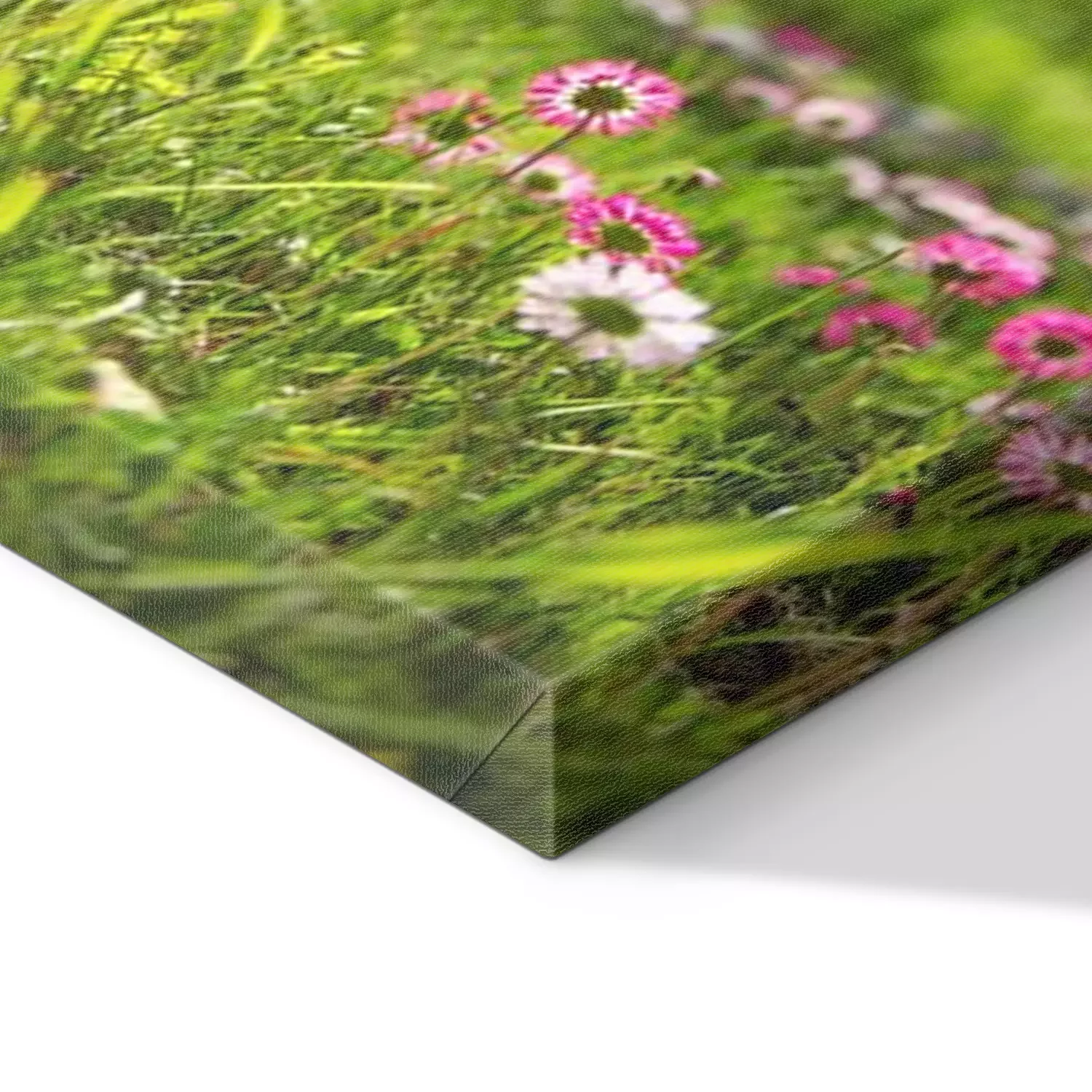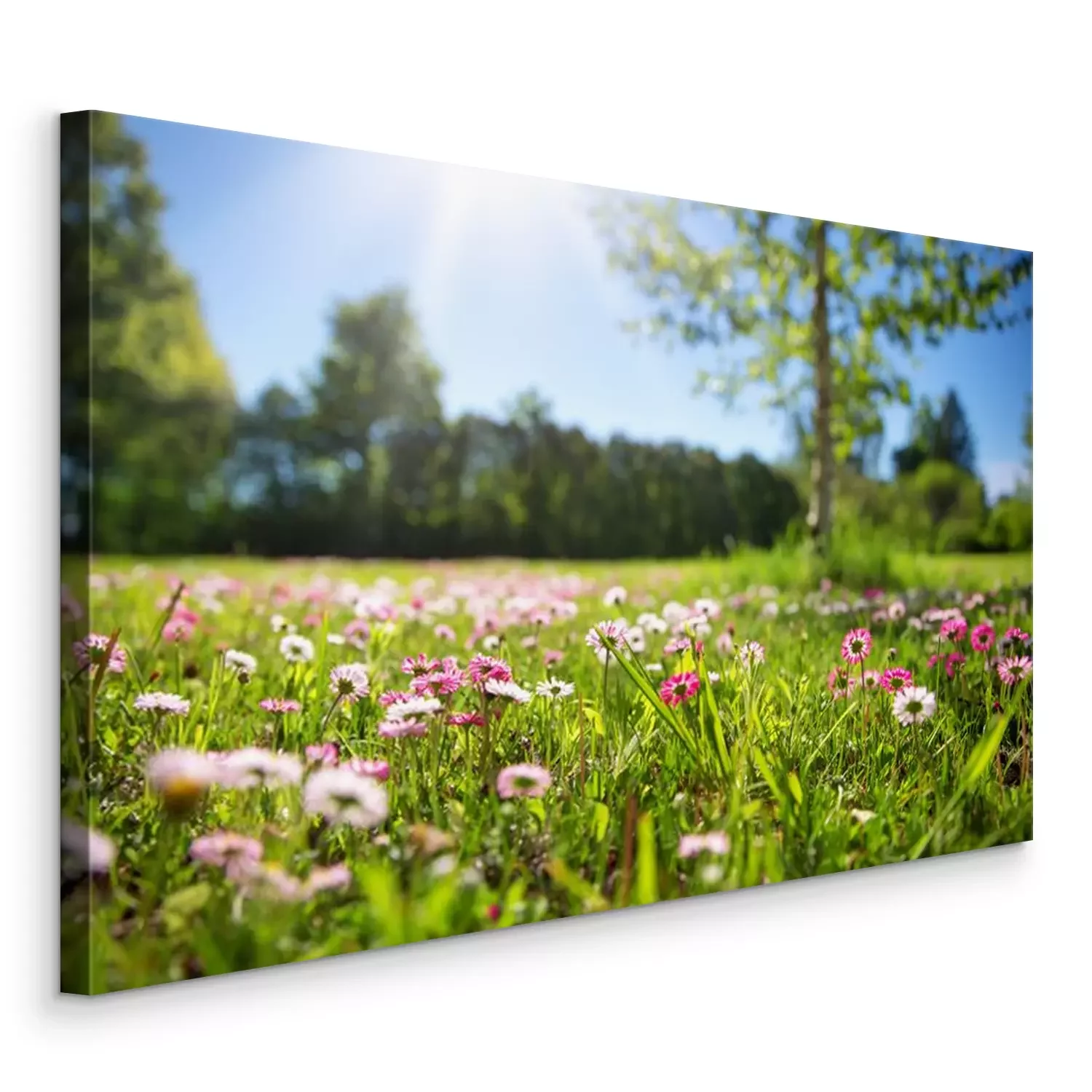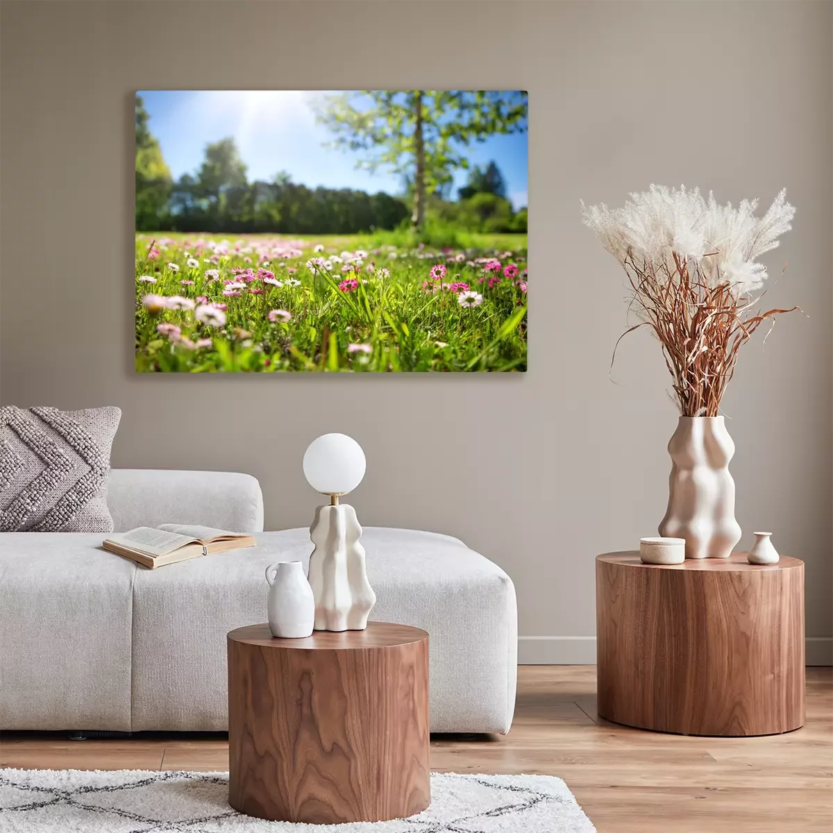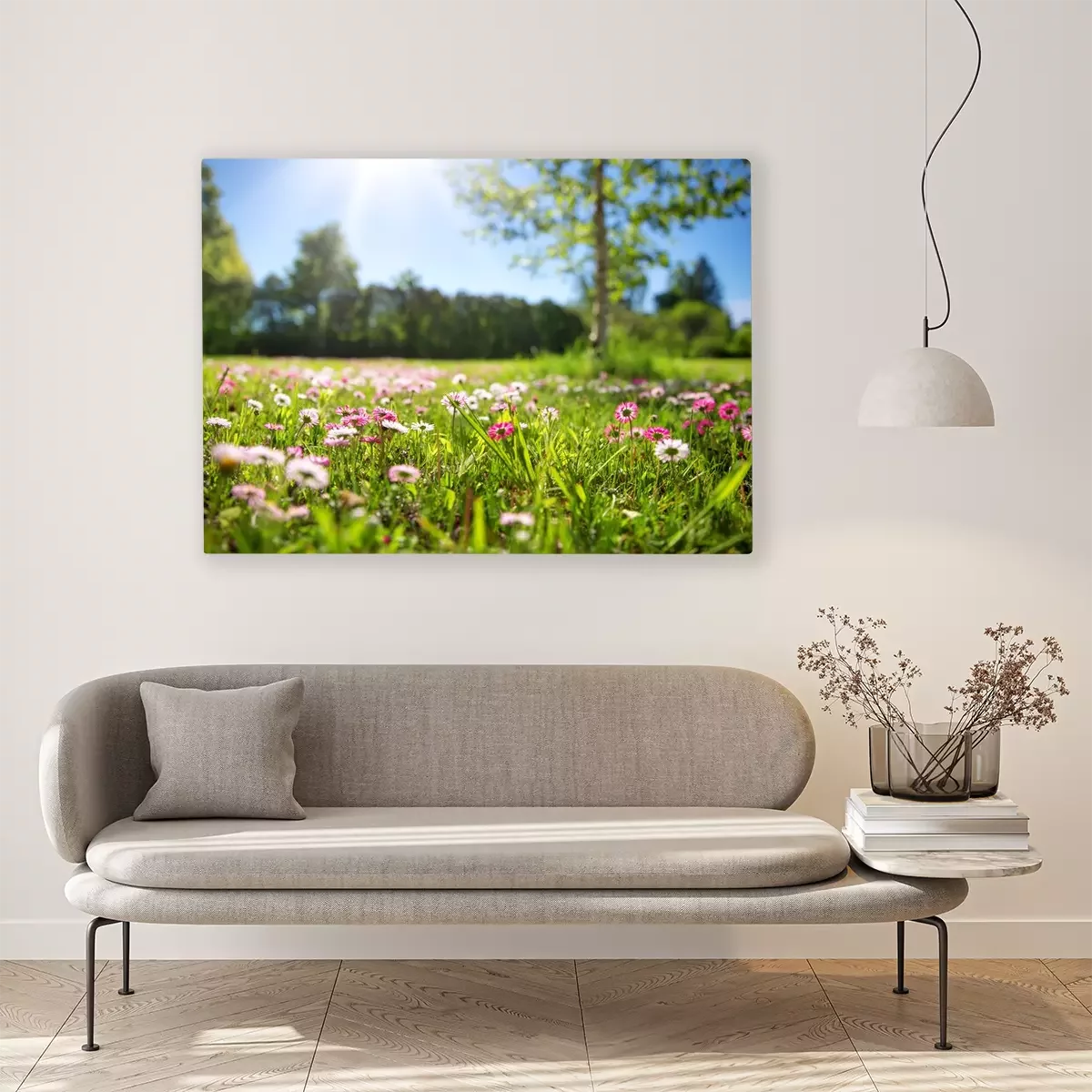 Tableau  Meadow with lots of white and pink spring daisy flowers in sunny day. Nature landscape in estonia in early summer