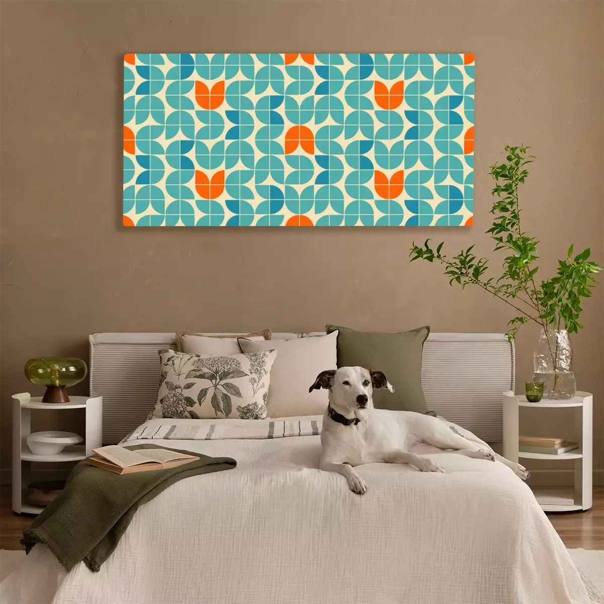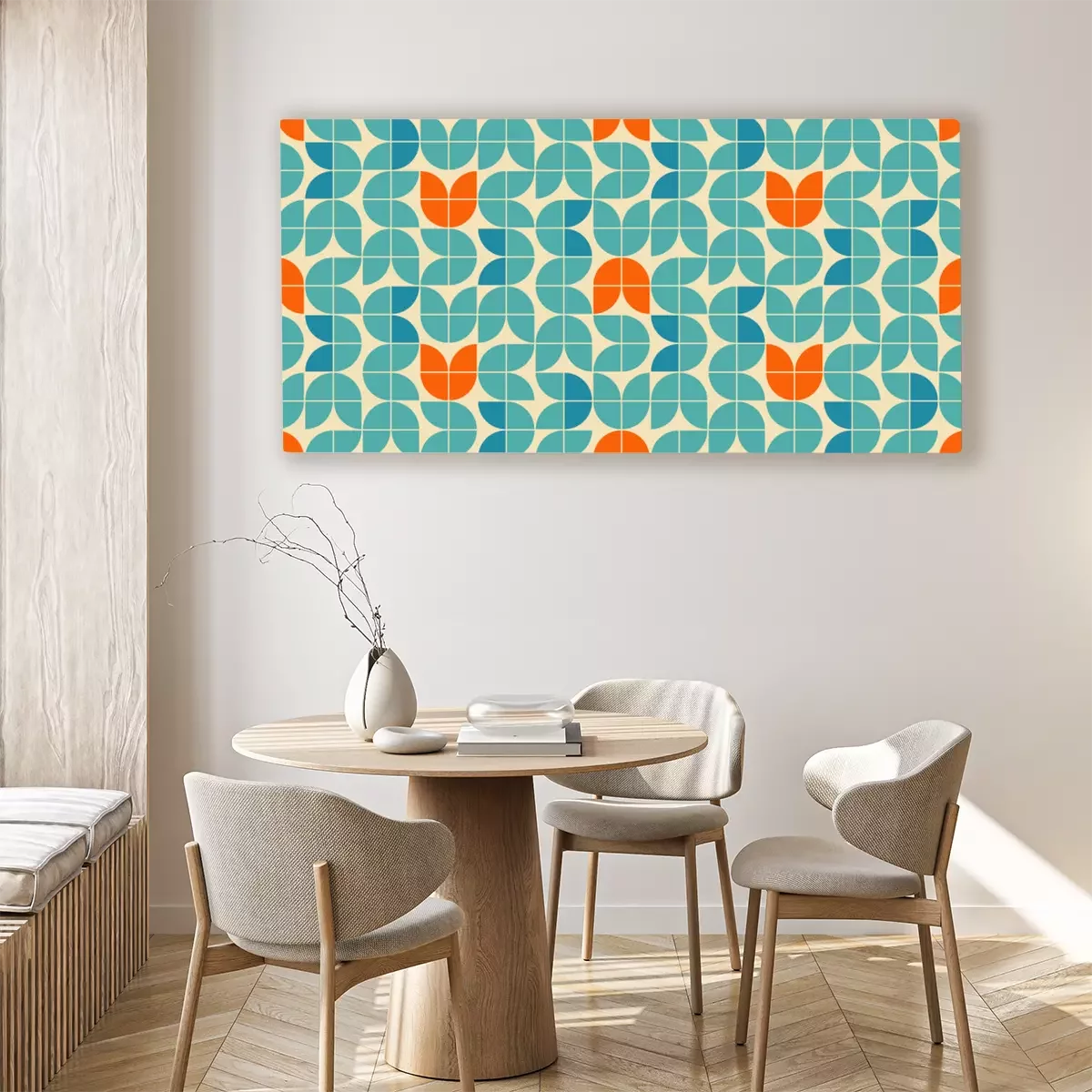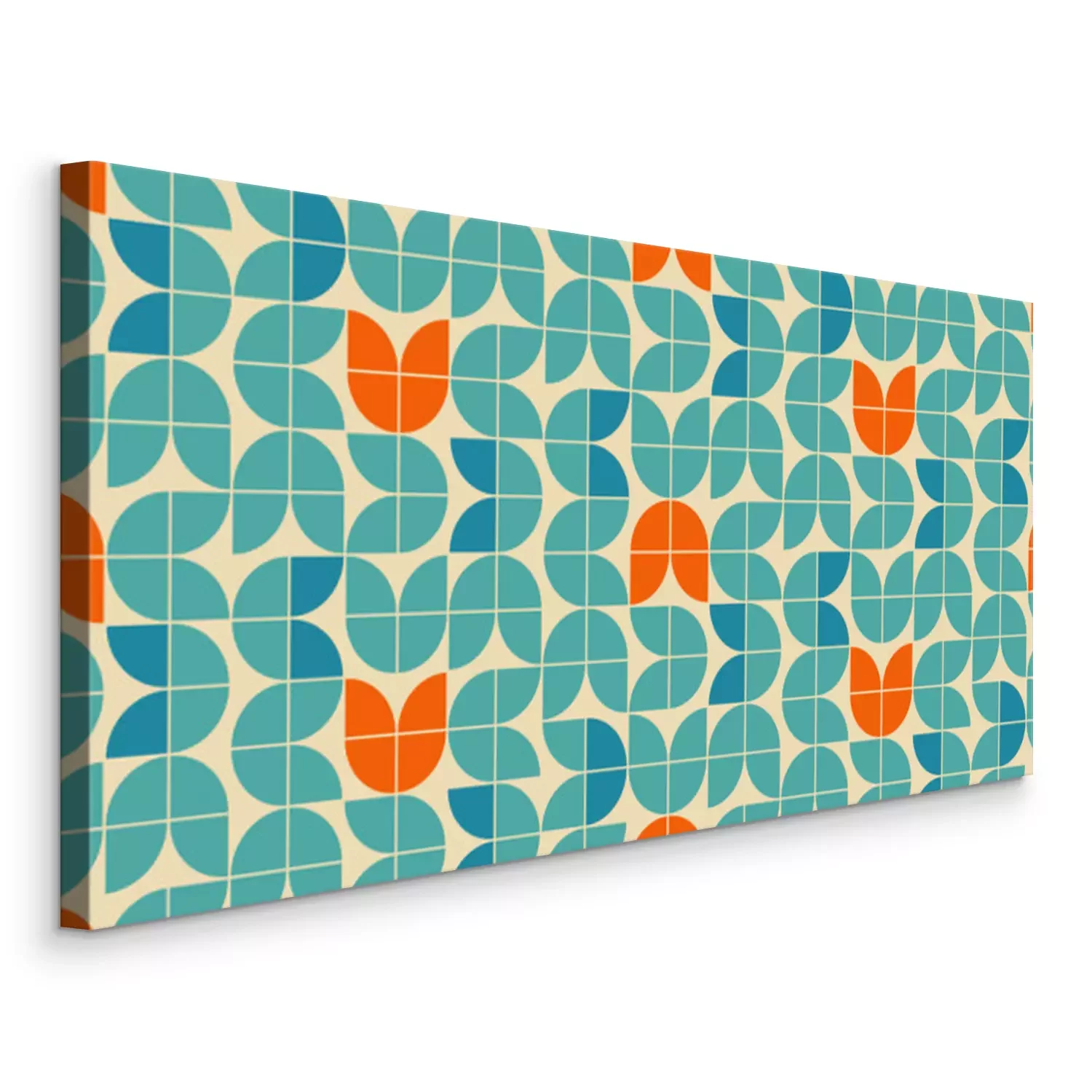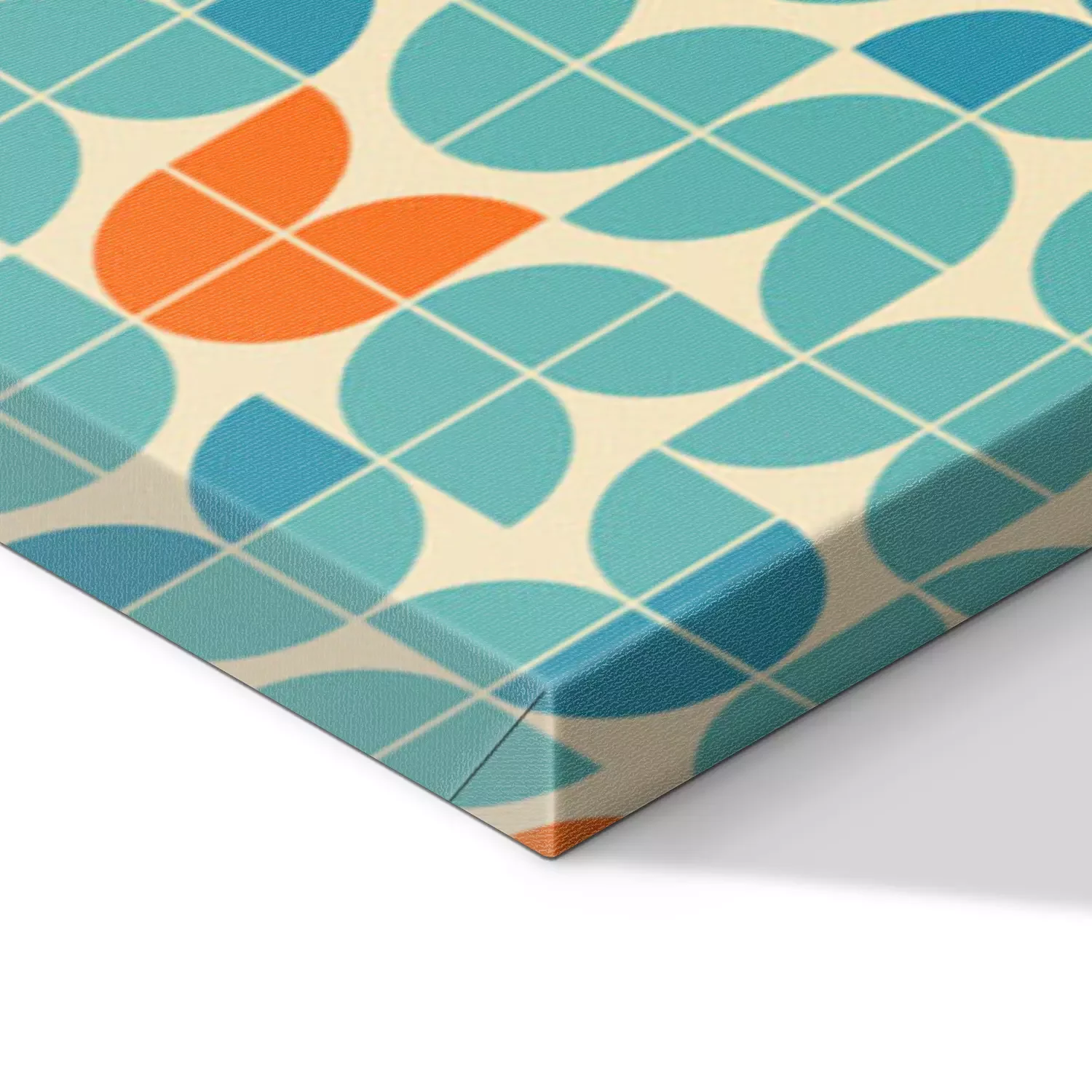 Tableau : Mid century modern style seamless vector pattern with geometric floral shapes colored in orange, green turquoise and aqua blue. Retro geometrical pattern sixties style.