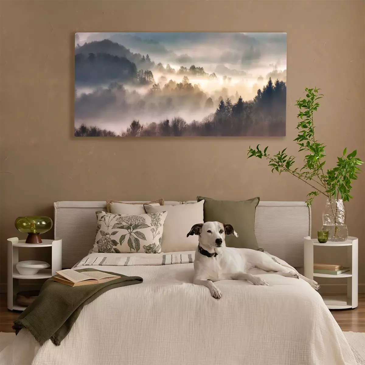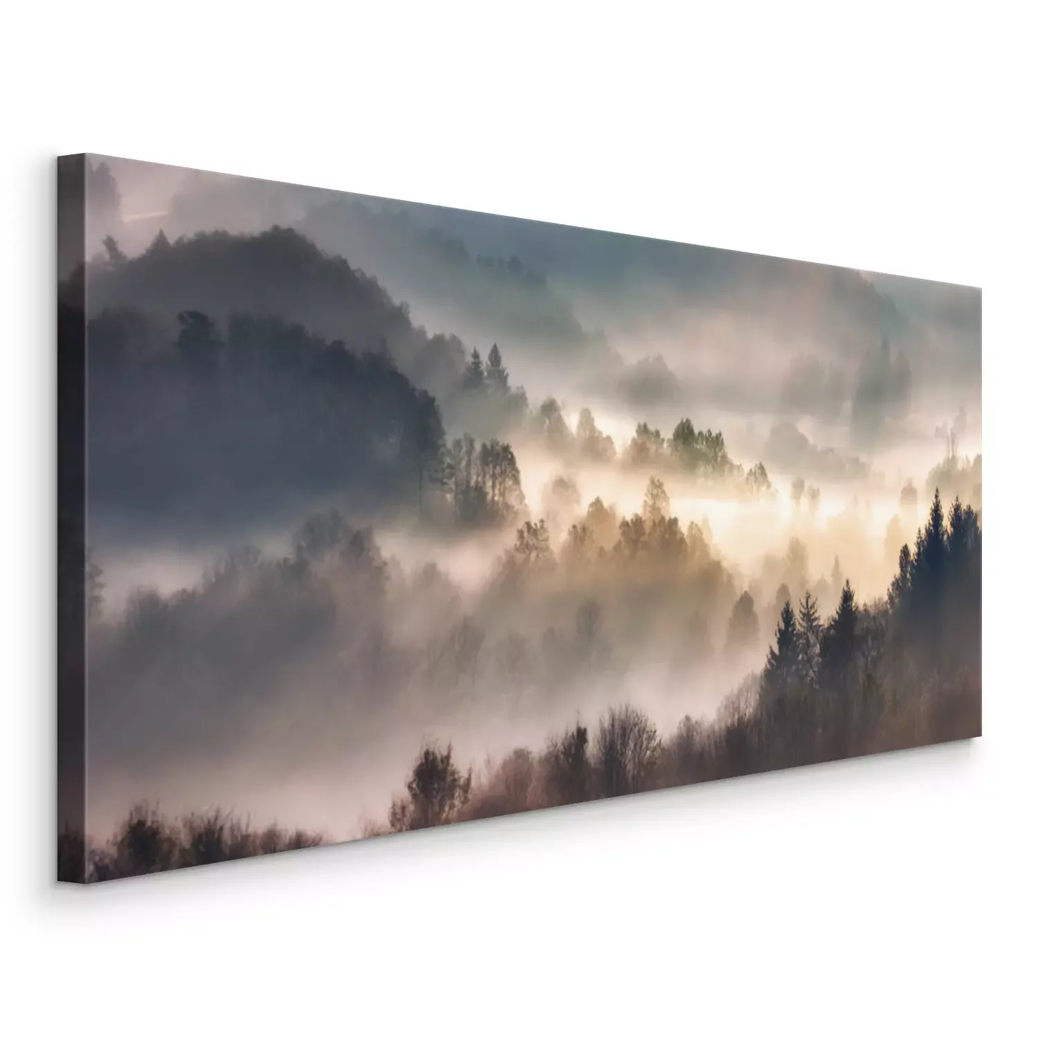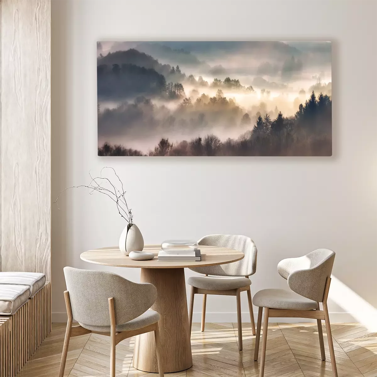 Tableau  Mist in forest with sunbeam rays, Woods landscape