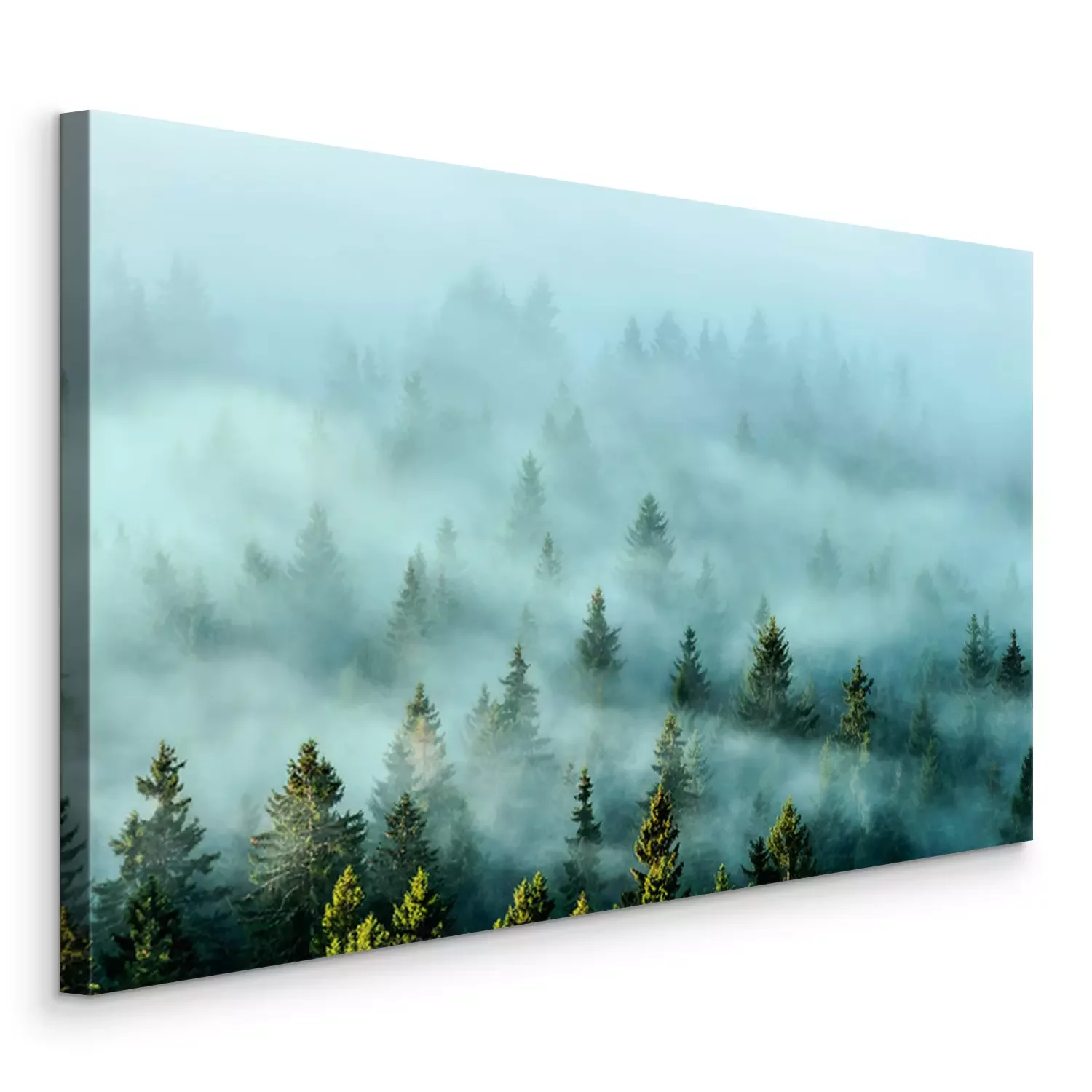 Tableau  Misty mountains with fir forest in fog. Foggy trees in morning light.
