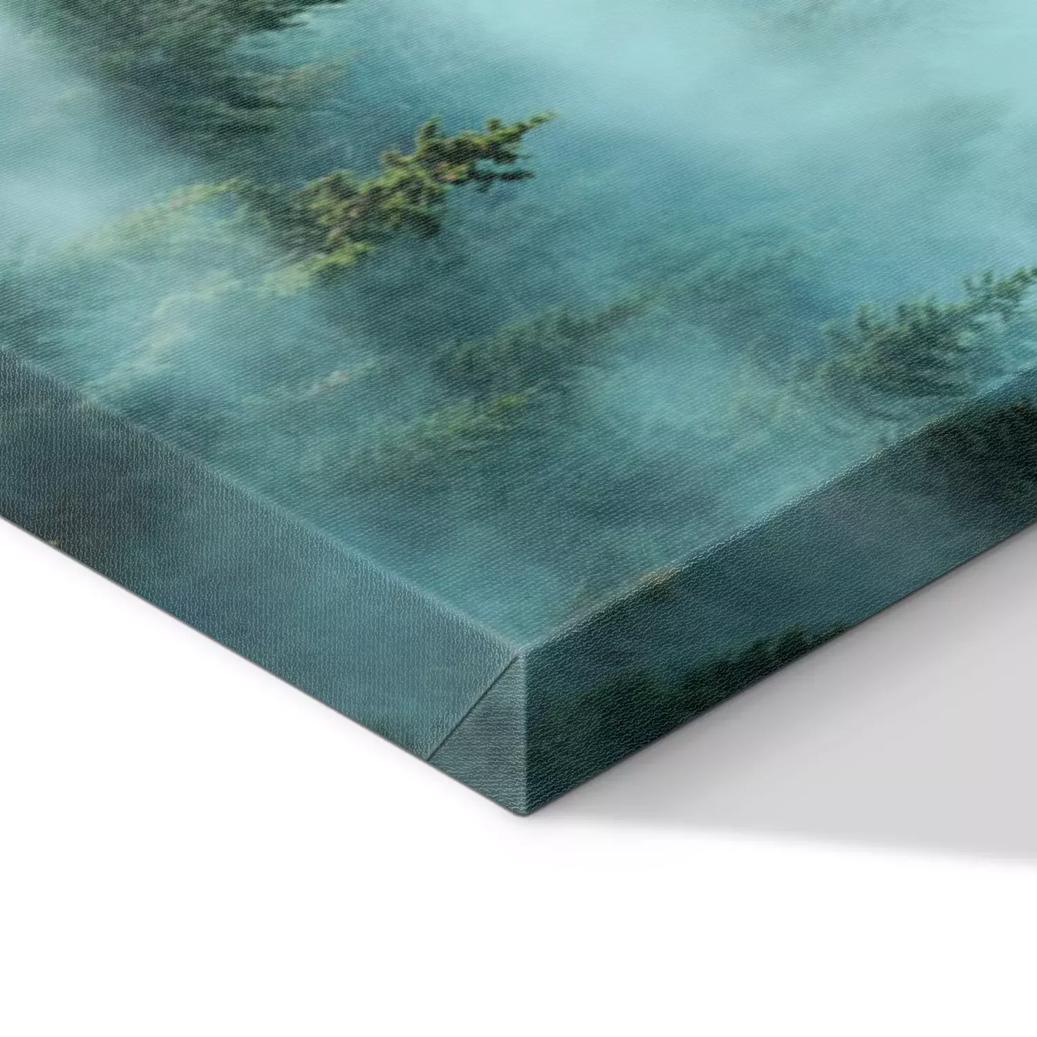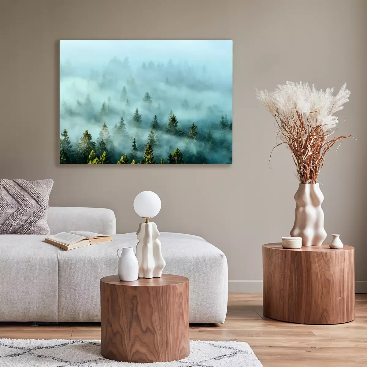 Tableau : Misty mountains with fir forest in fog. Foggy trees in morning light.
