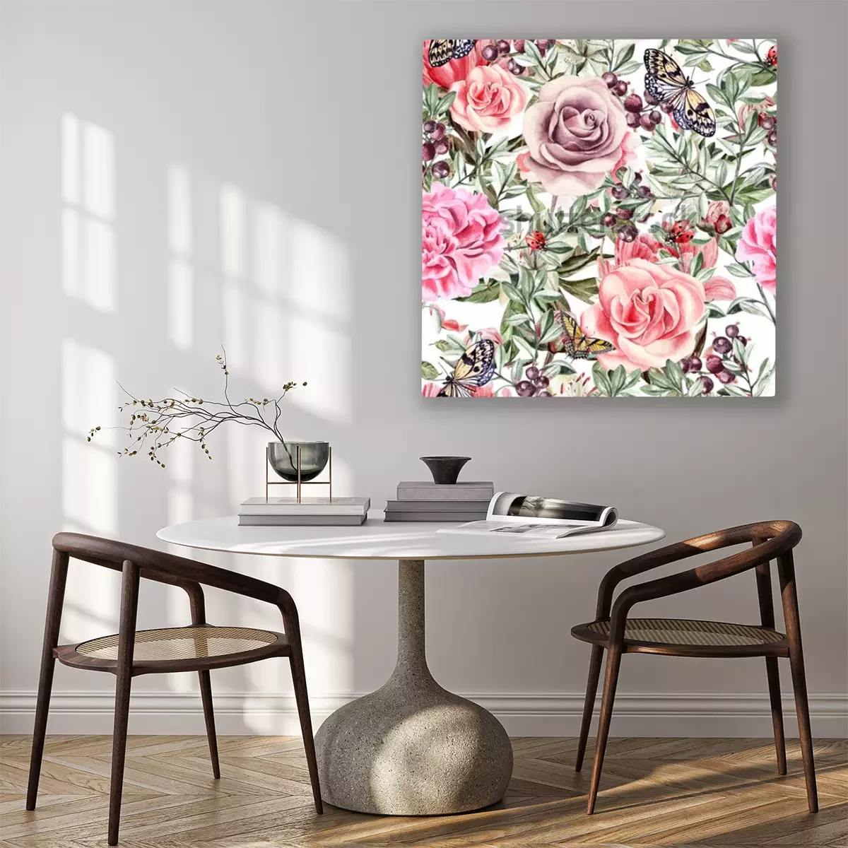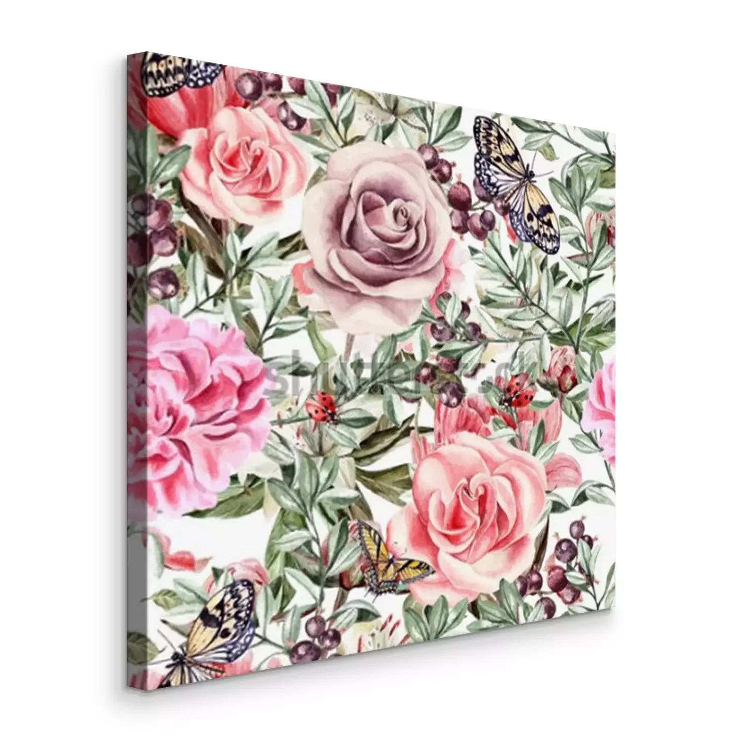 Tableau  Modèle avec aquarelle réaliste rose, pivoines, papillons et plantes. Illustration.