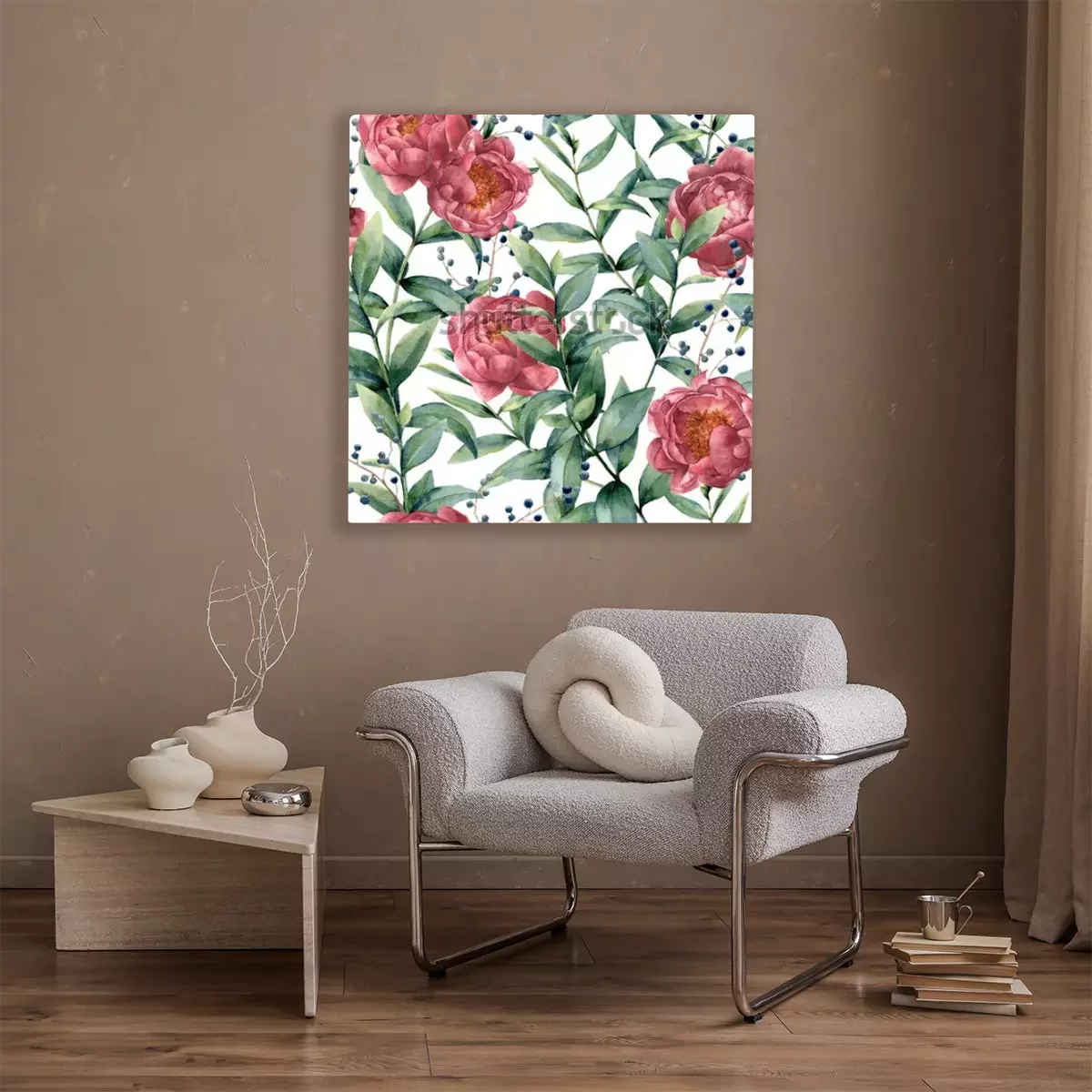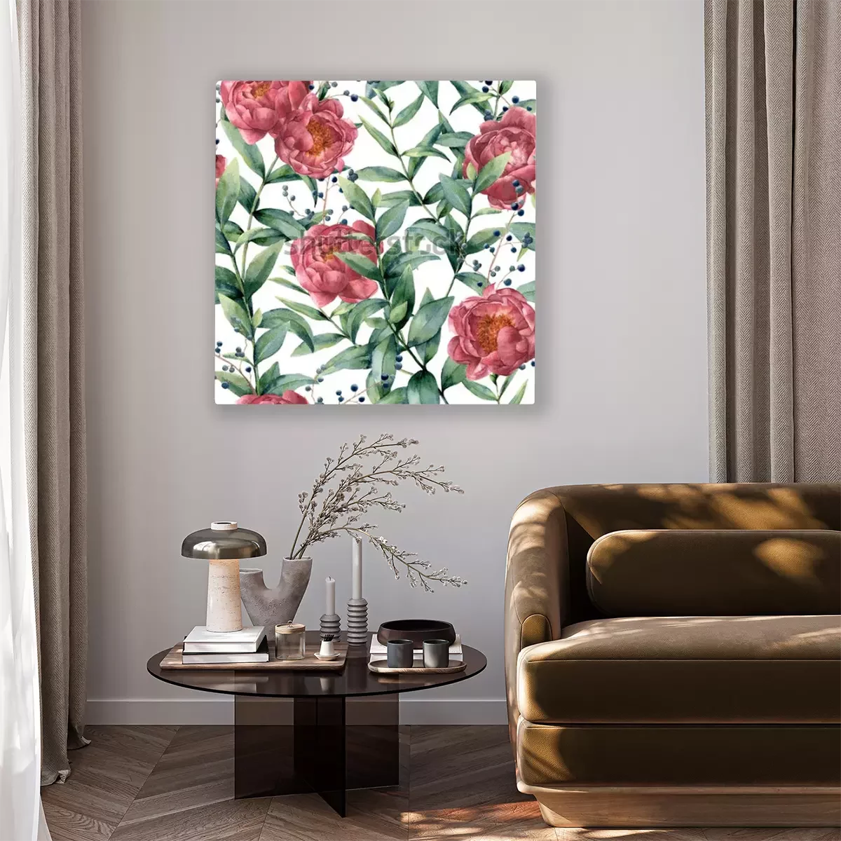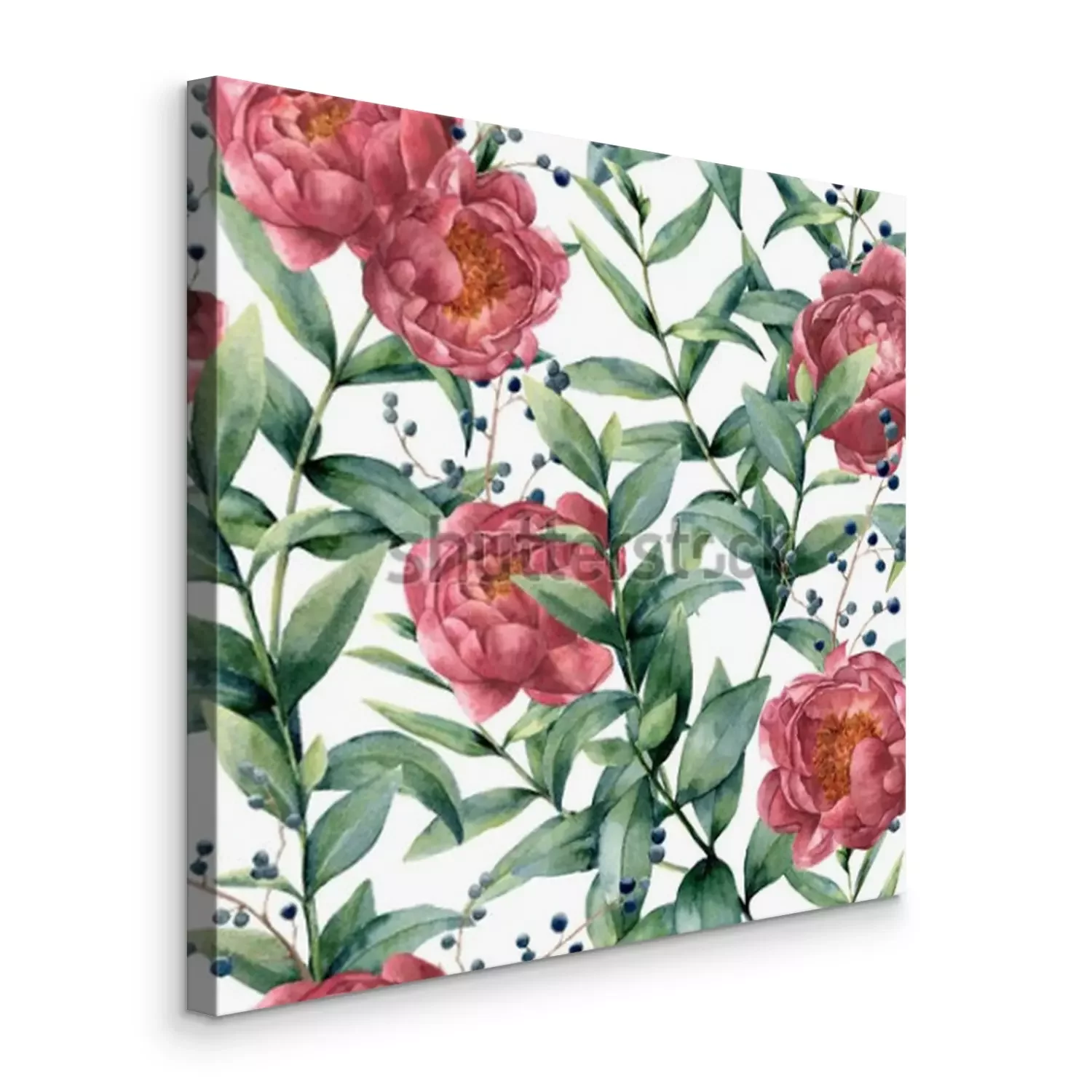 Tableau  Modèle d'aquarelle avec eucalyptus, pivoine et baies. Peint à la main des branches florales avec des feuilles, des fleurs isolées sur fond blanc. Illustration botanique de la nature pour la concep