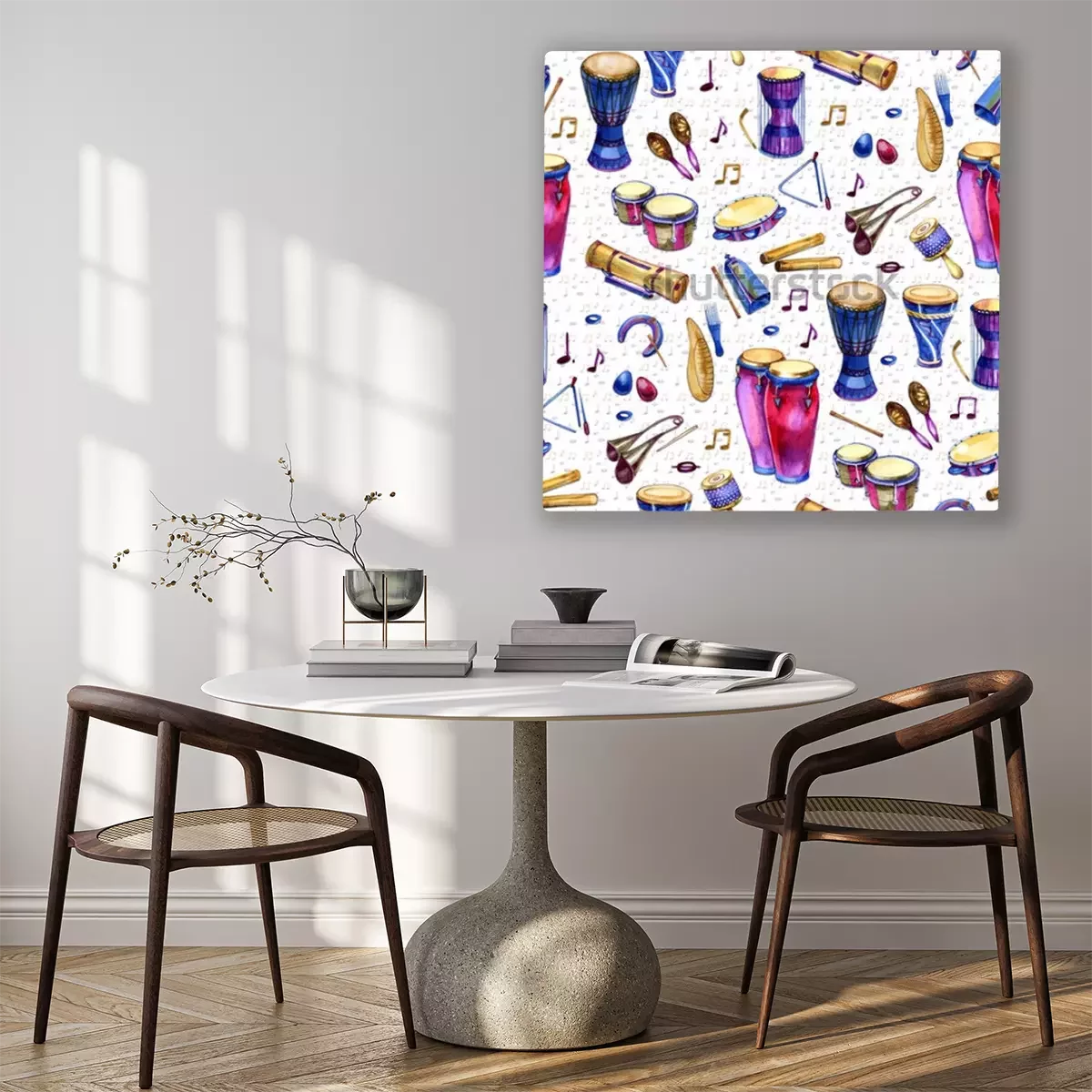 Tableau  Modèle sans couture avec batterie dans un style Aquarelle sur fond blanc. Instruments de musique à percussion. Design coloré pour une fête rétro dans le style de memphis. illustration