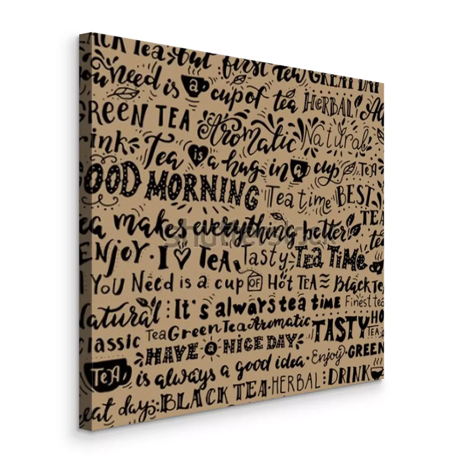 Tableau  Modèle sans couture de mots sur le thé. Citations inspirantes. Illustration dessinée à la main avec le lettrage à la main. Idéal pour les cafés, bars, petites annonces de thé, papier peint, papier d’e