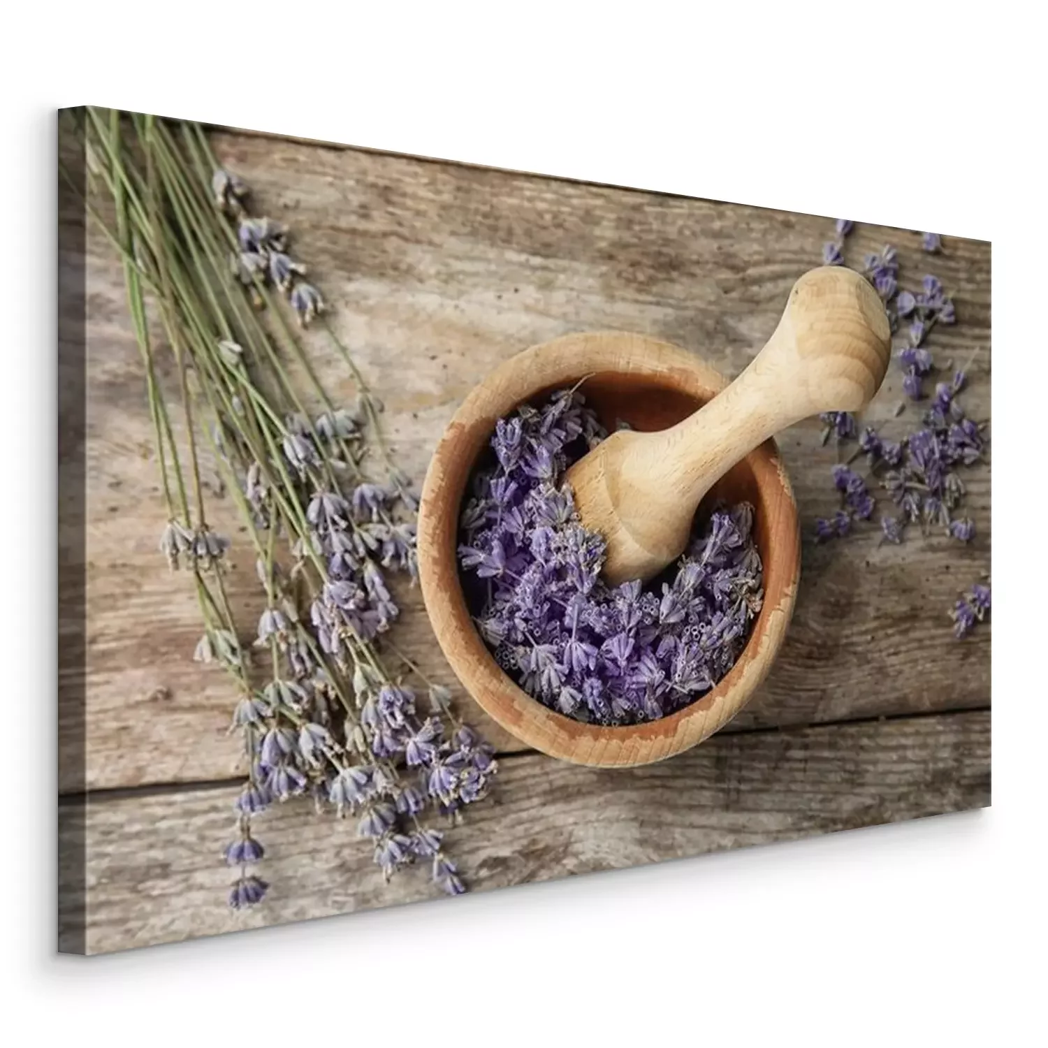 Tableau  Mortar with lavender flowers on table, top view. Ingredient for natural cosmetic