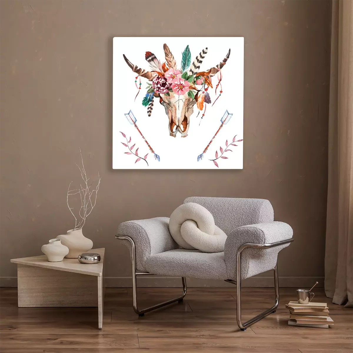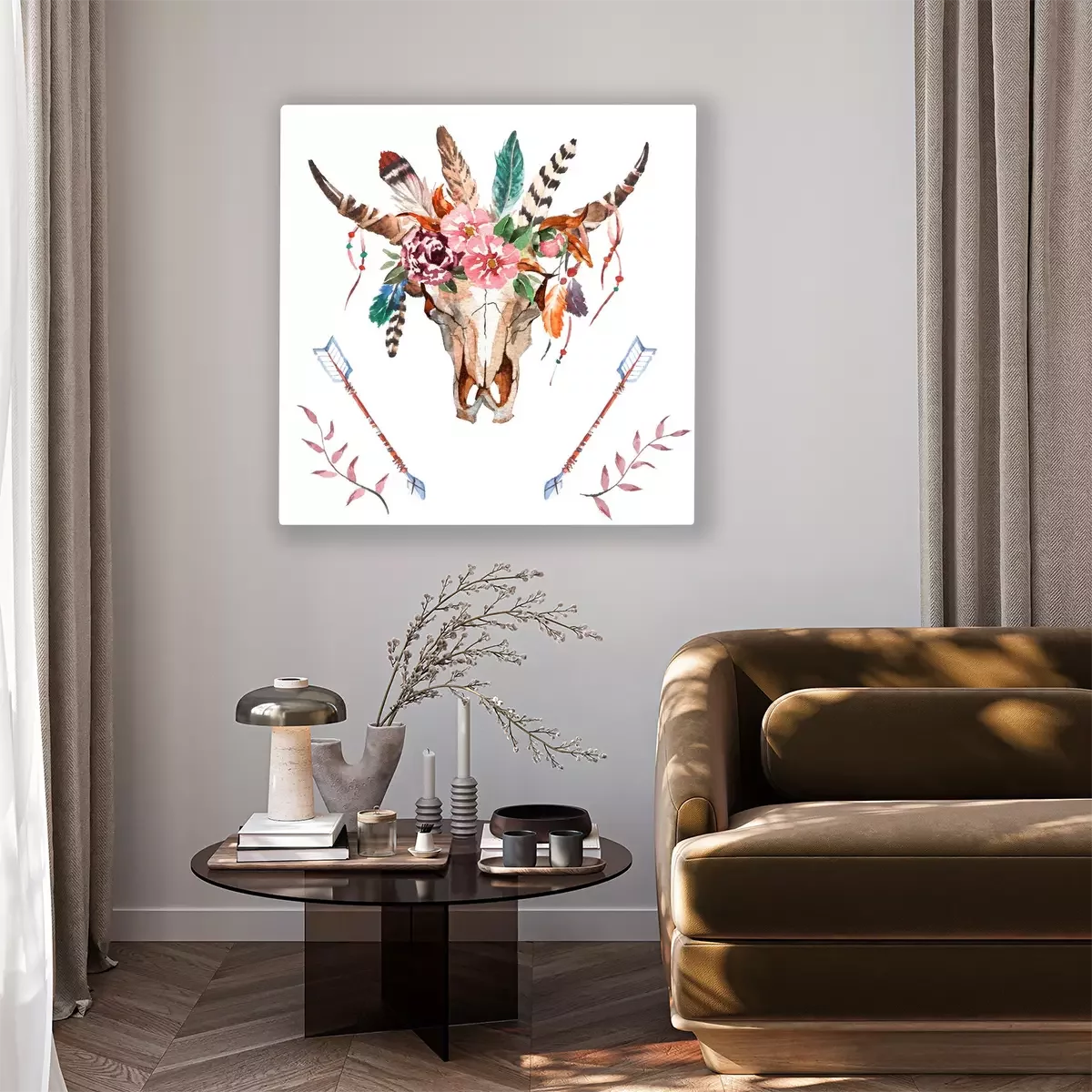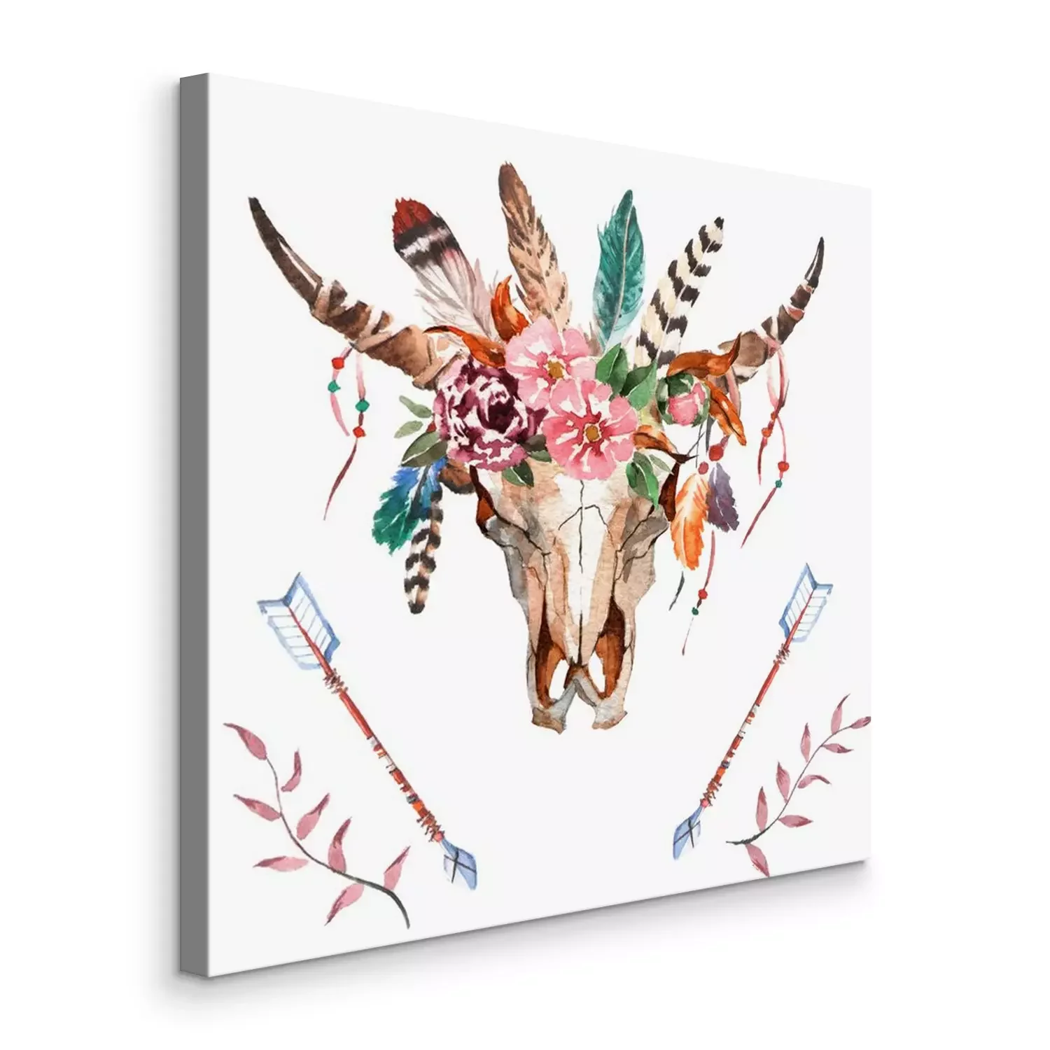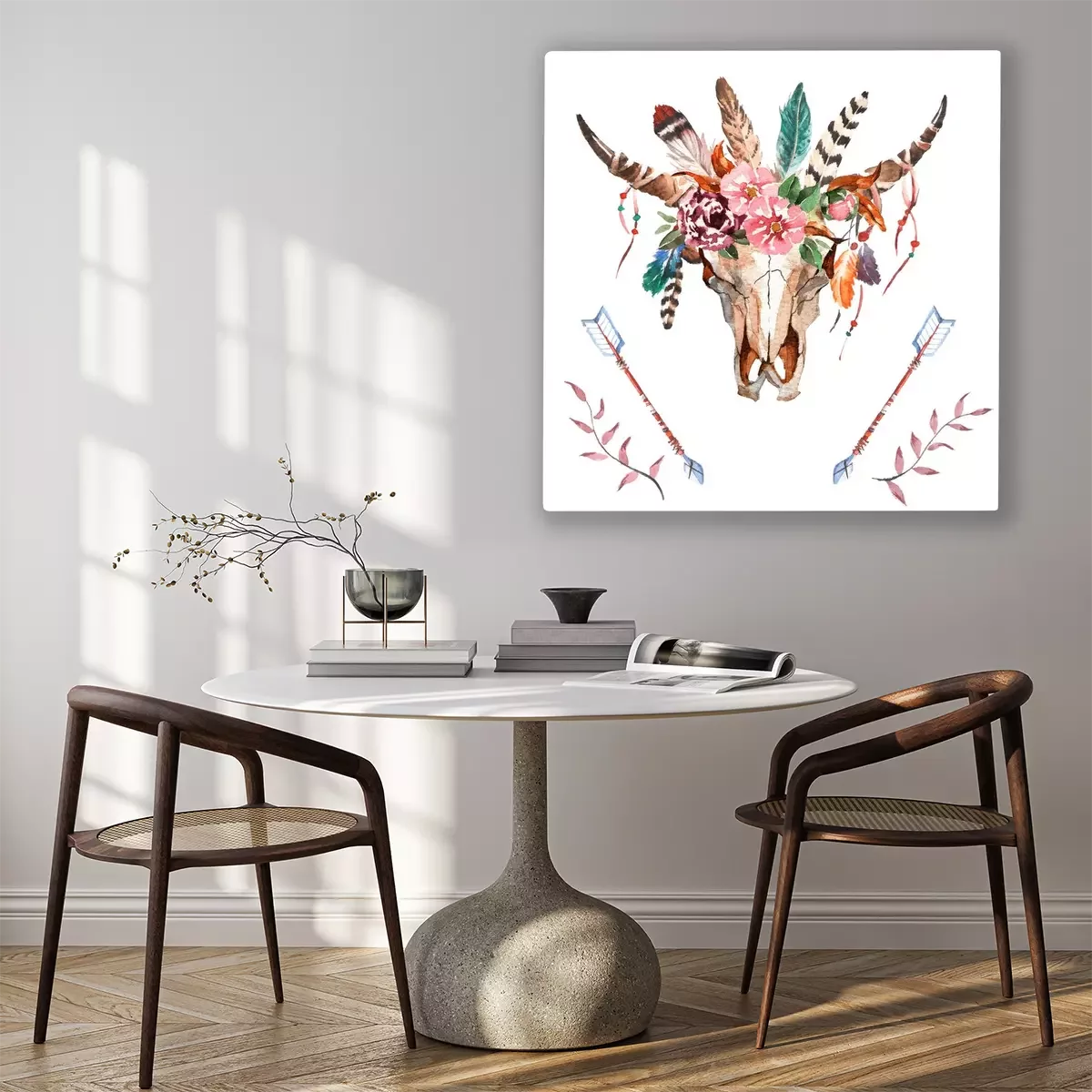 Tableau : Motif classique boho avec un crâne et des plumes