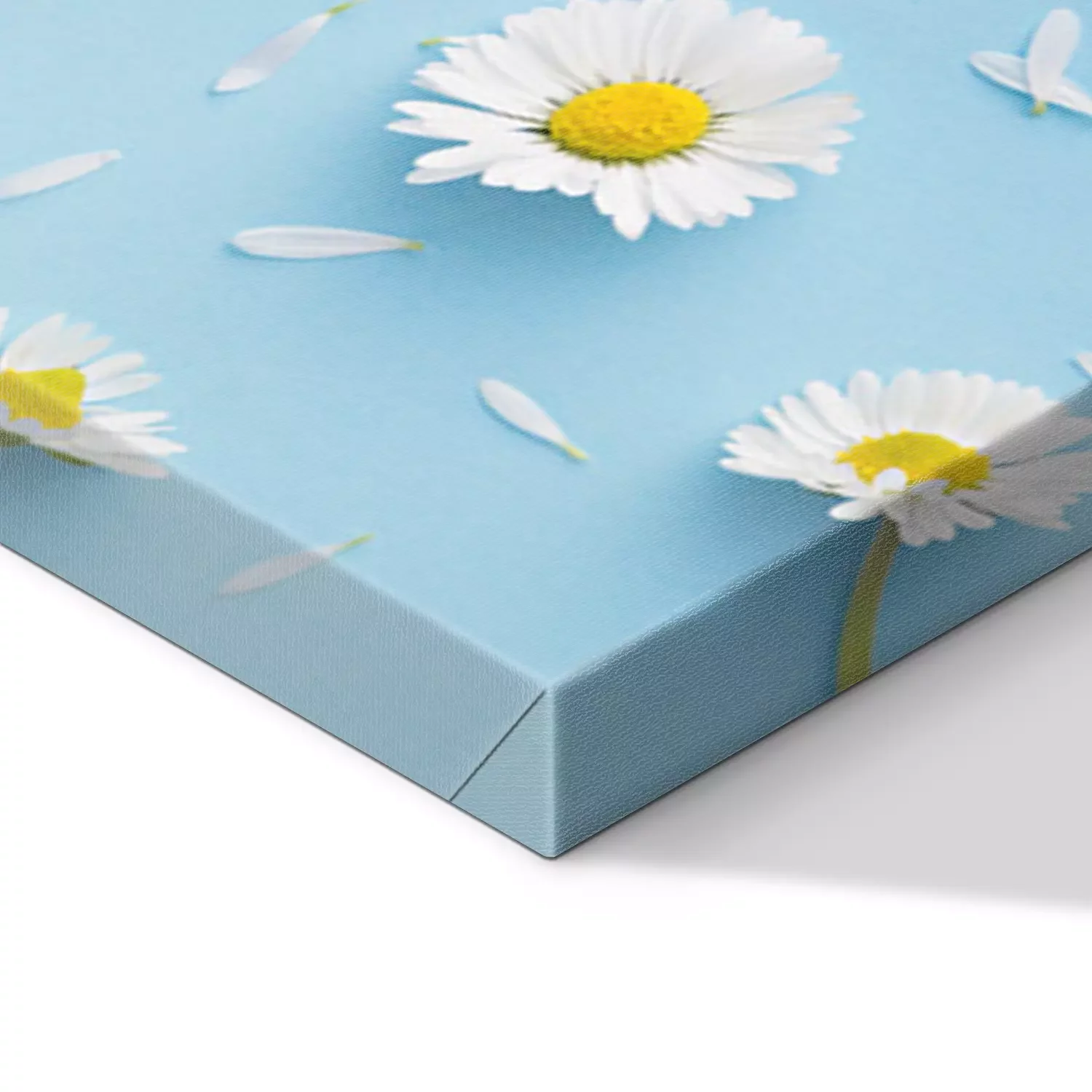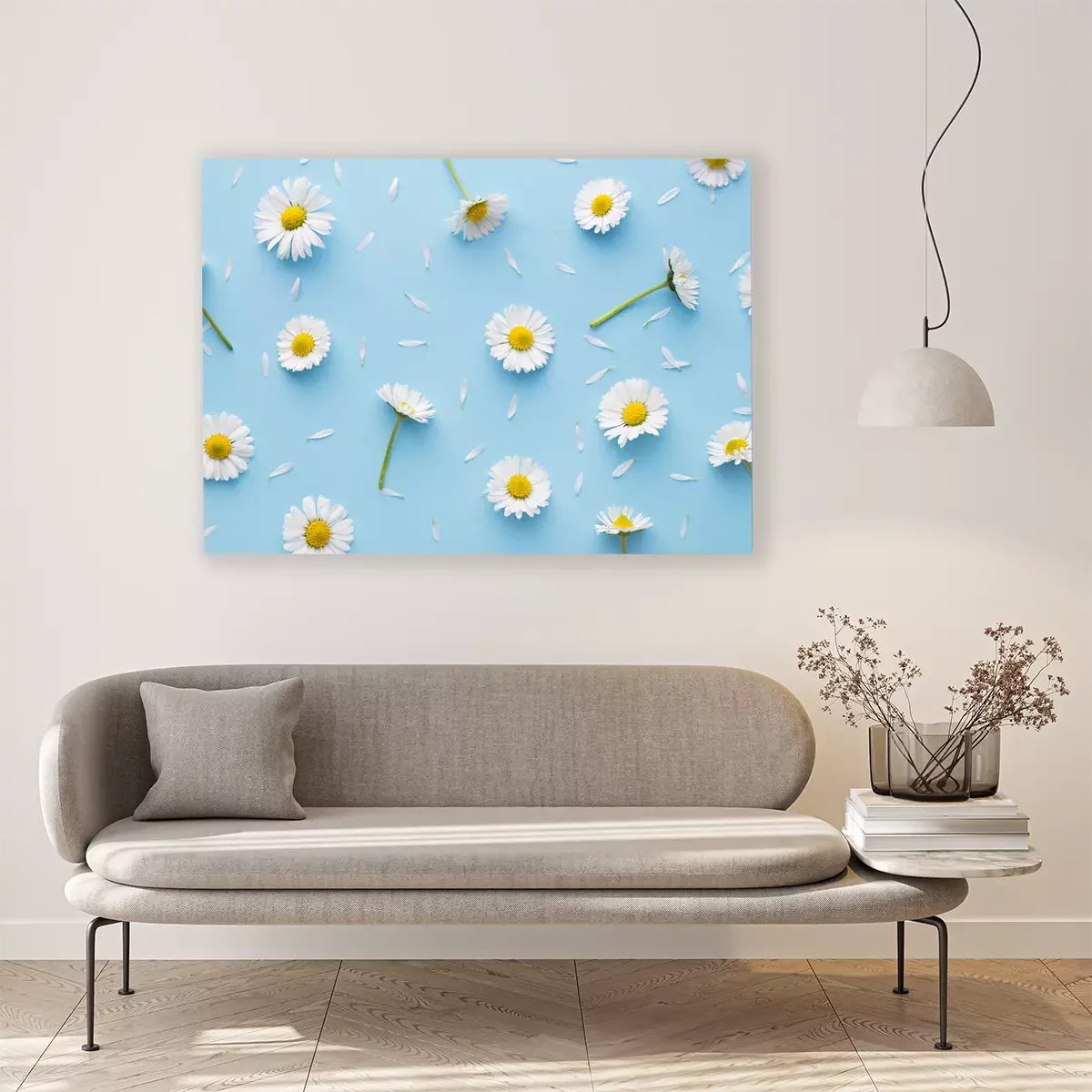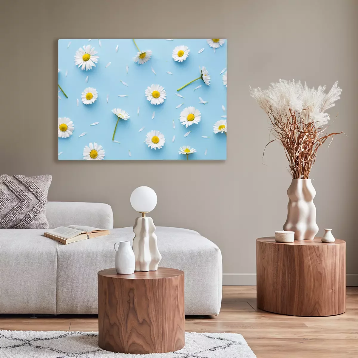Tableau  Motif de Marguerite. Plat poser printemps et fleurs de camomille d'été sur un fond bleu. Concept de répétition. Vue de dessus