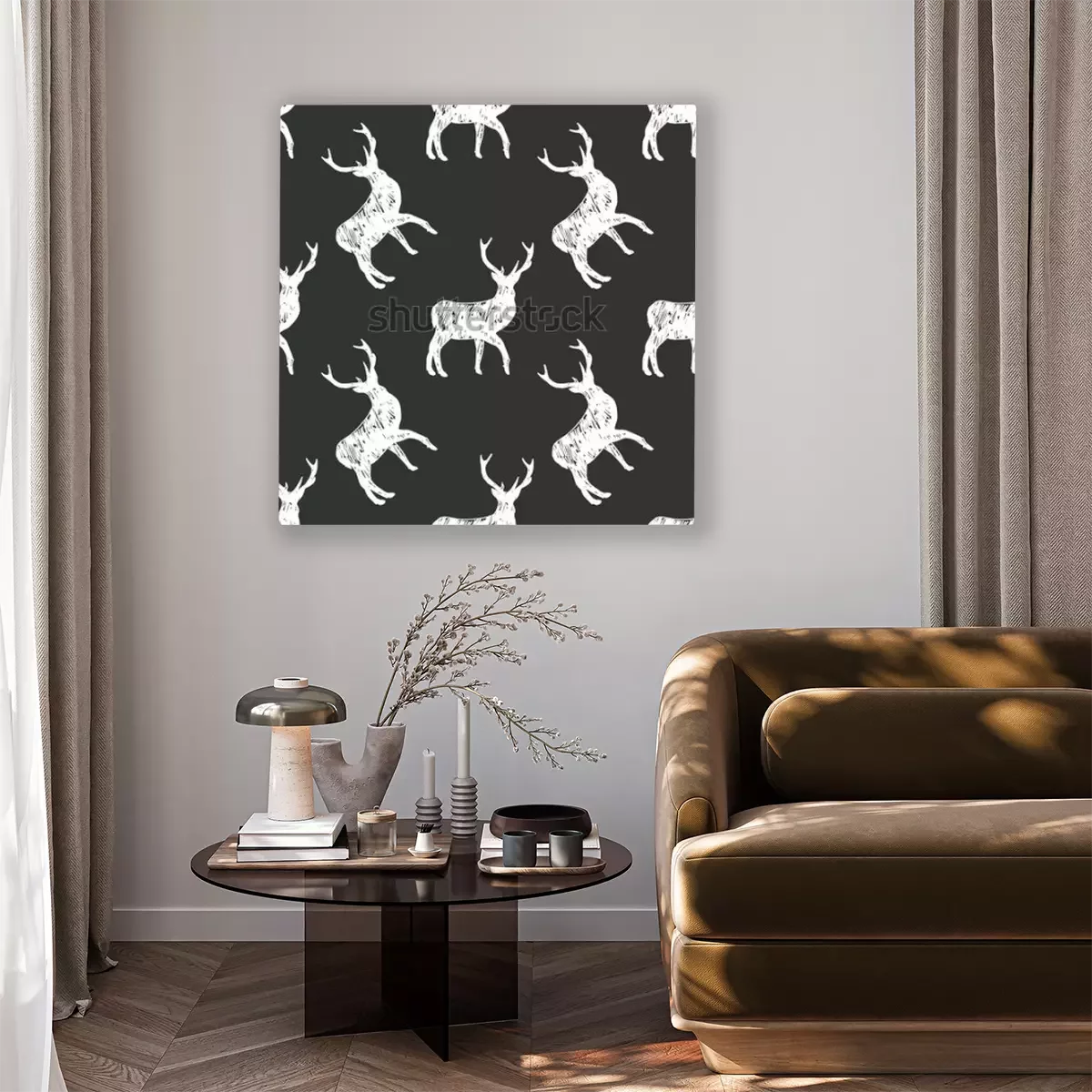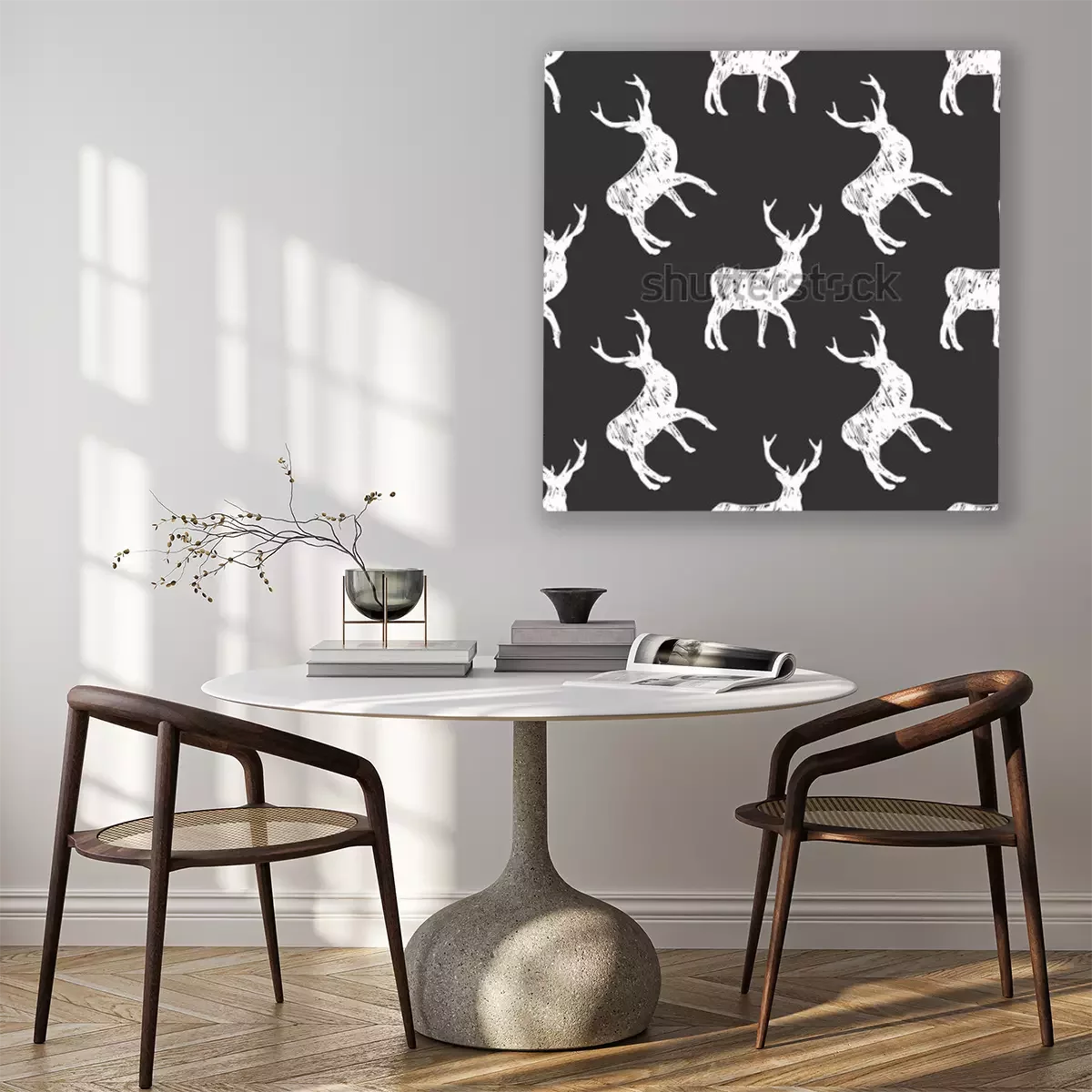 Tableau : Motif noir et blanc avec des cerfs