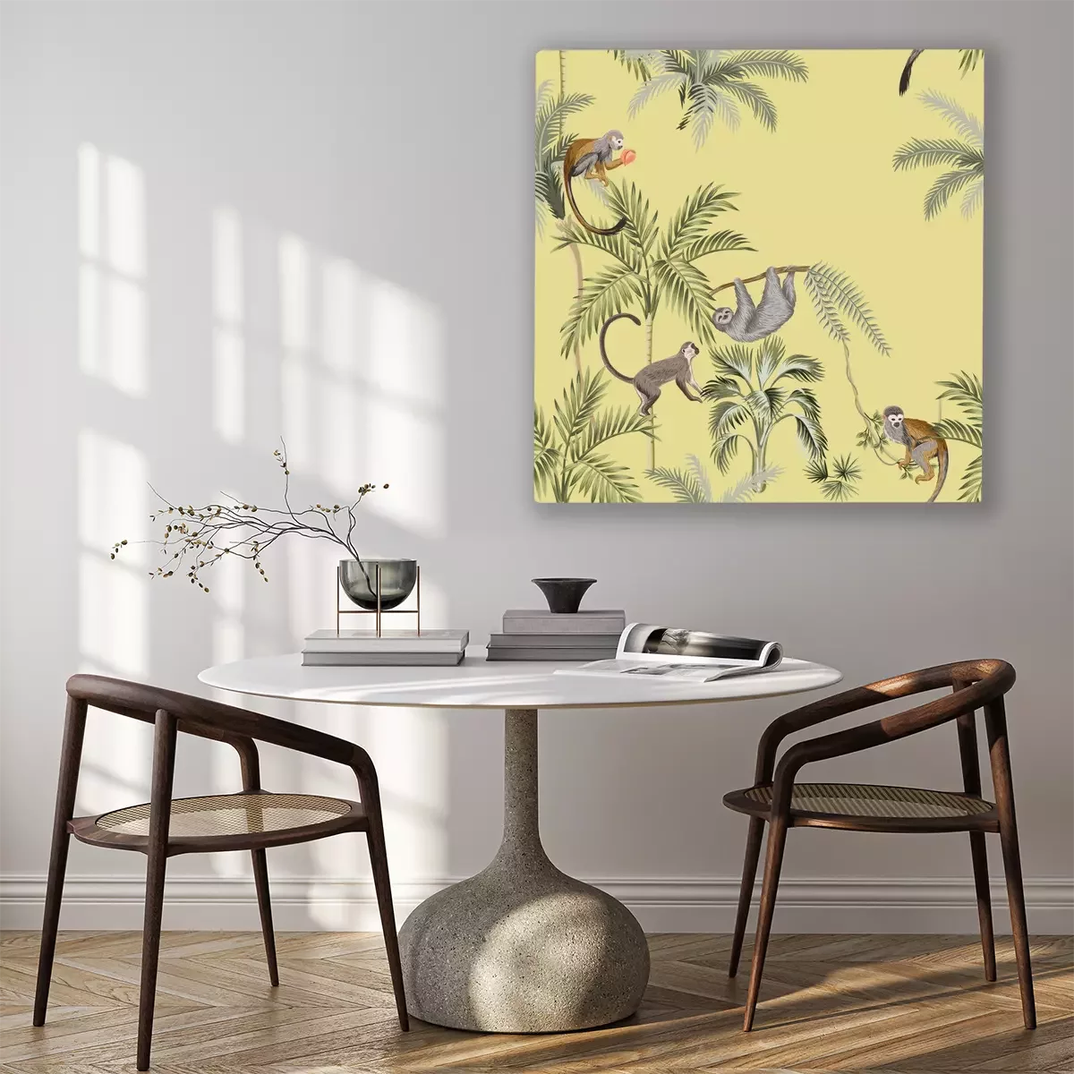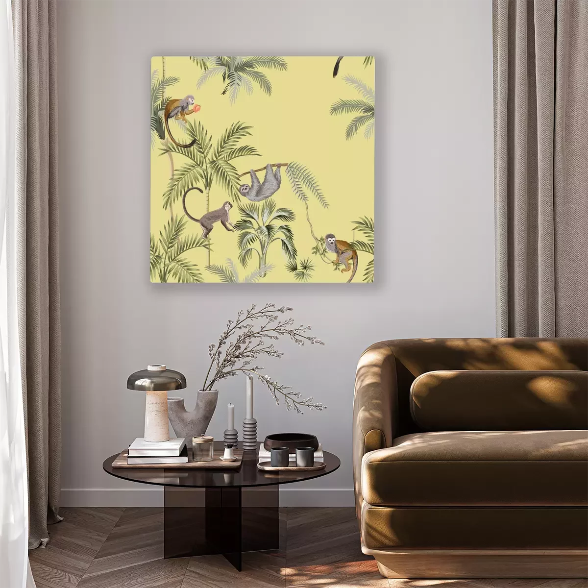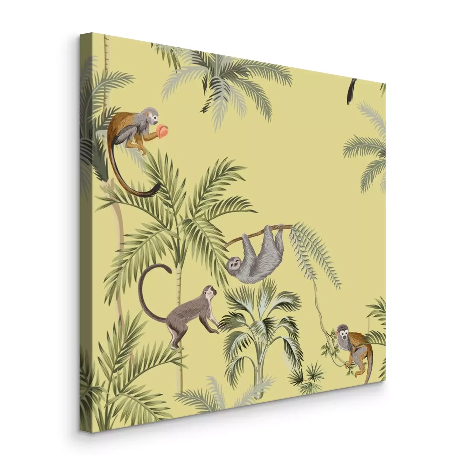 Tableau : Motif tropical avec des singes sur des palmiers