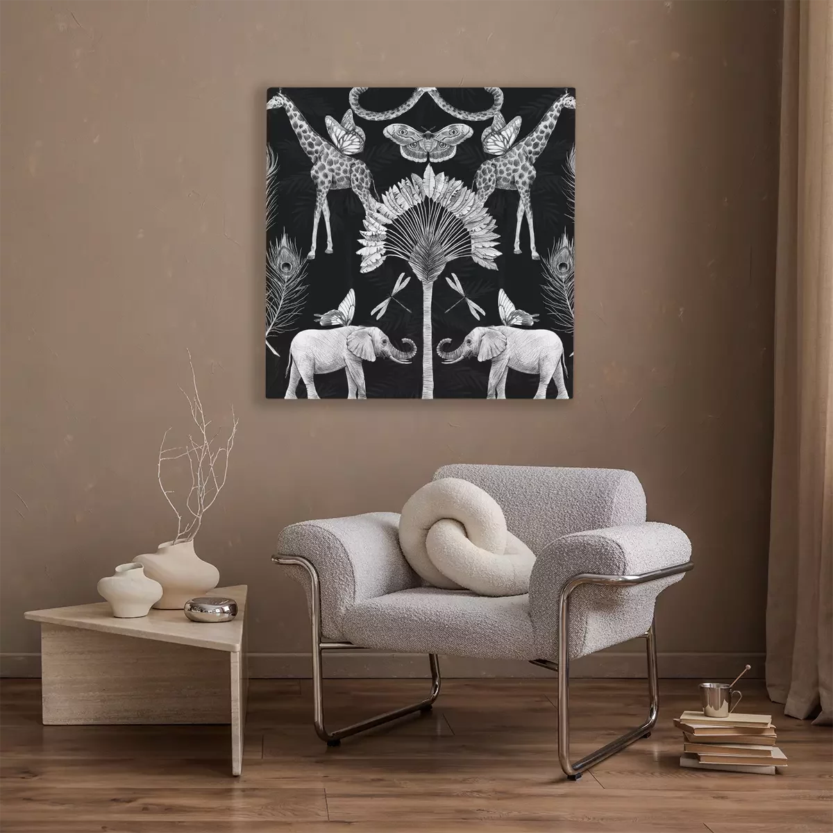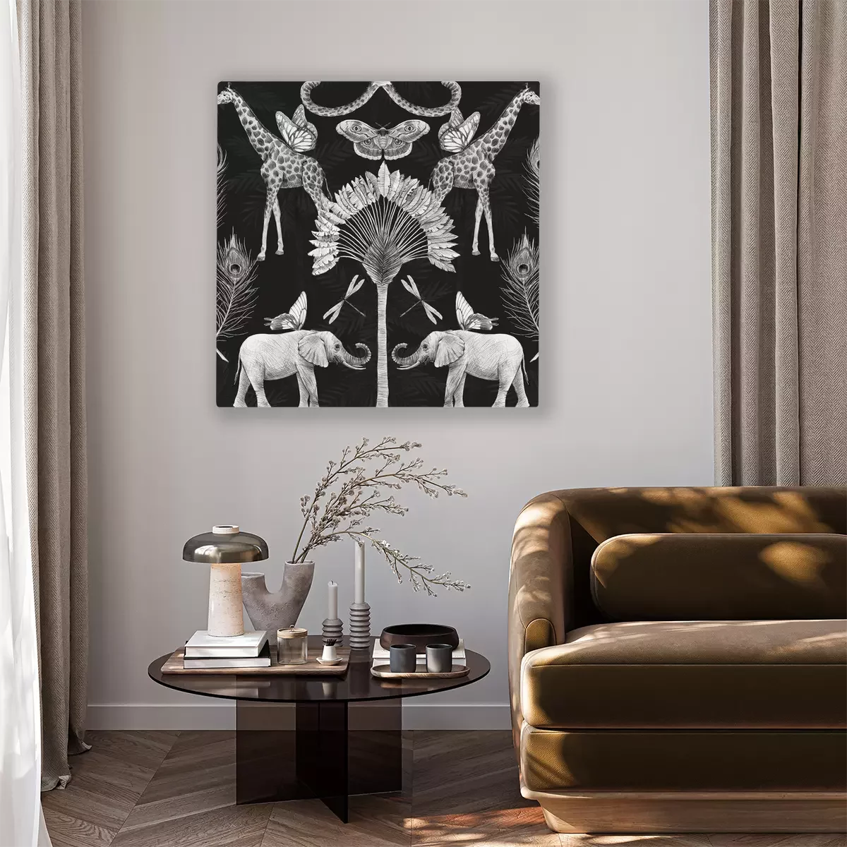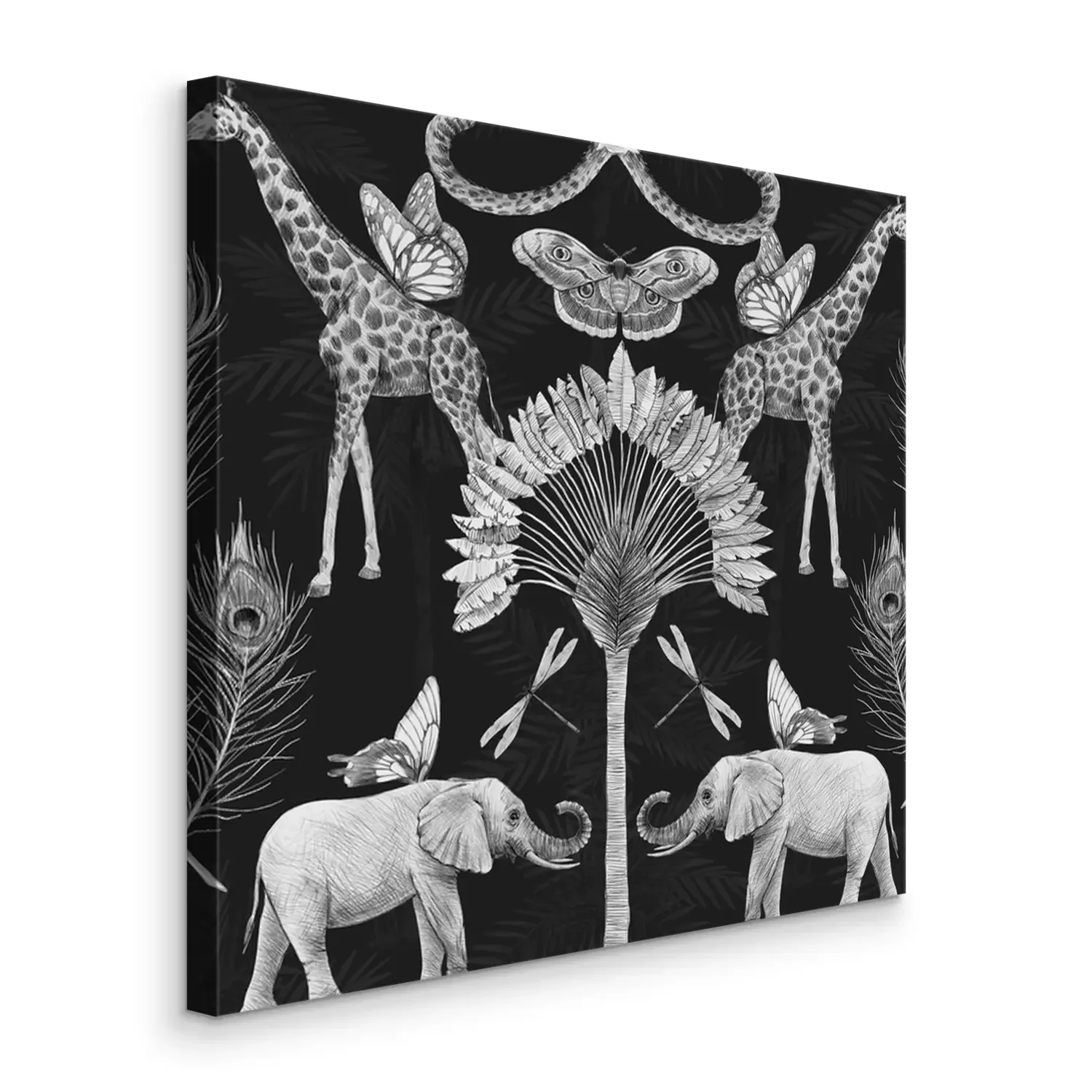 Éléphant et girafe sur fond de palmiers