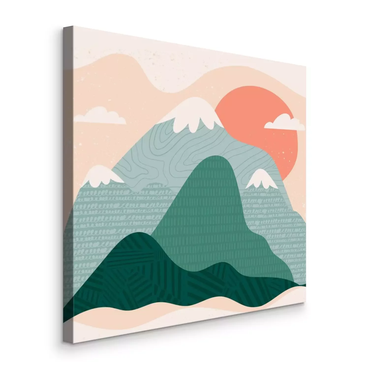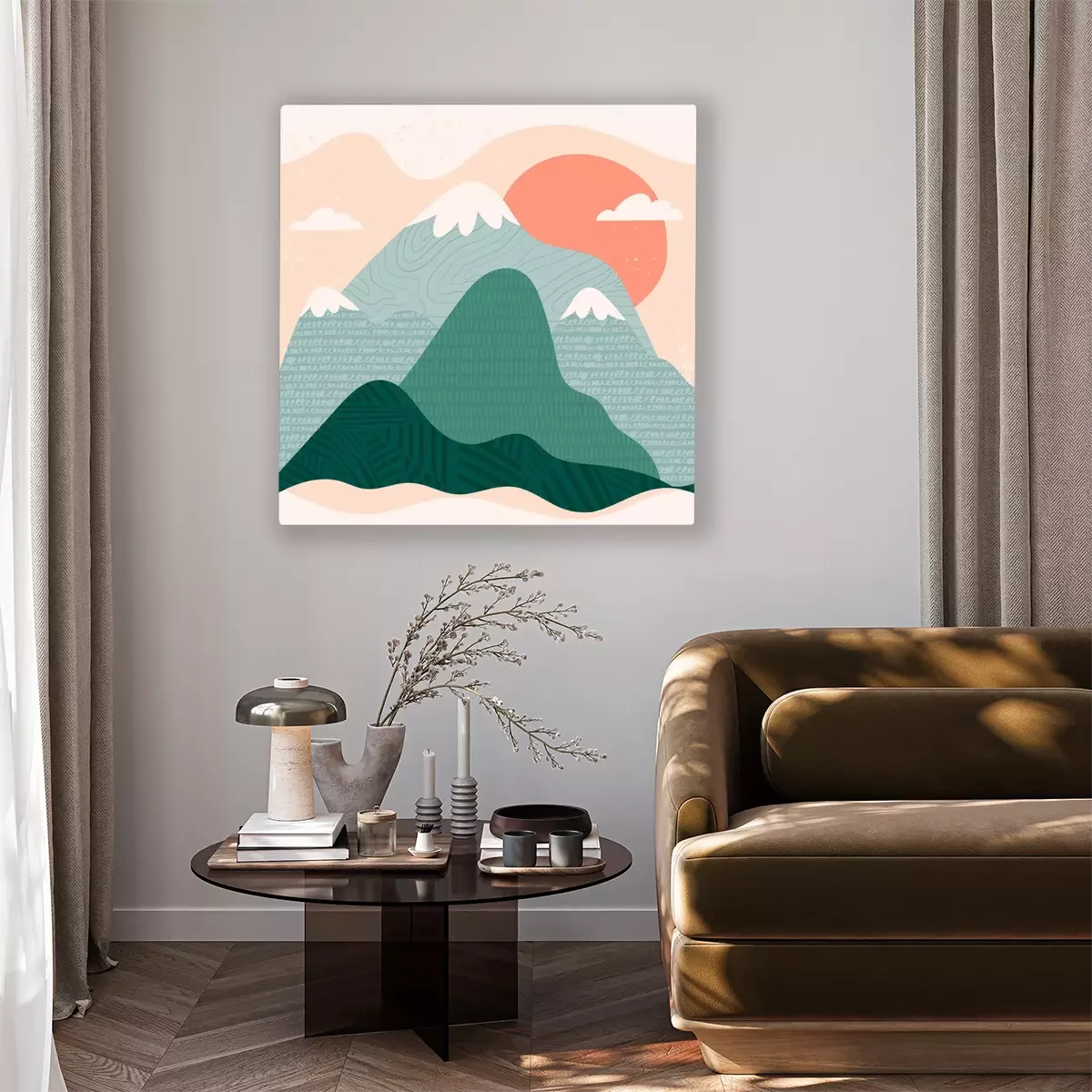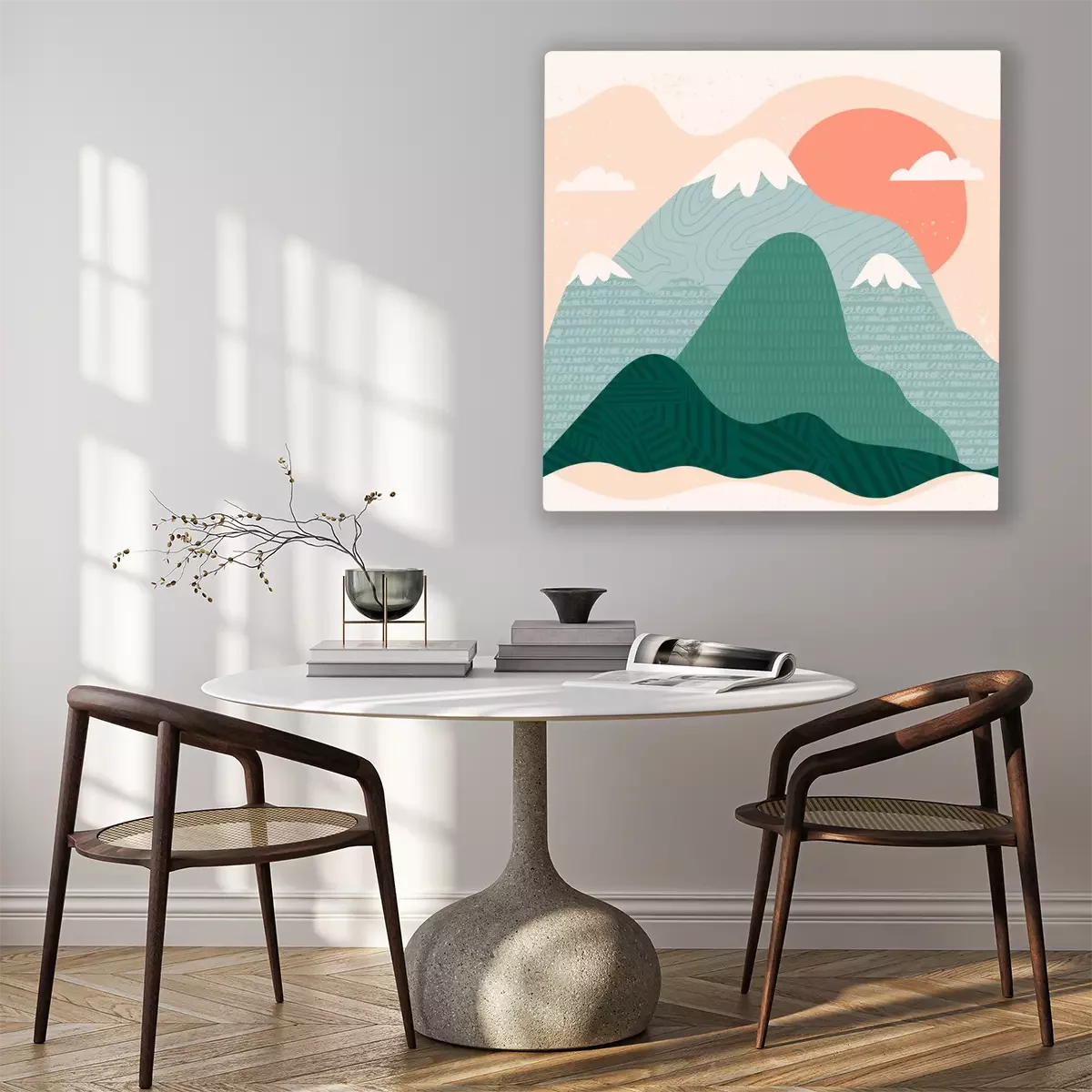 Tableau  Mountain view. Mountains, hills, clouds, sun. Paper cut style. Flat abstract design. Scandinavian style illustration. Stamp texture. Hand drawn trendy vector seamless pattern