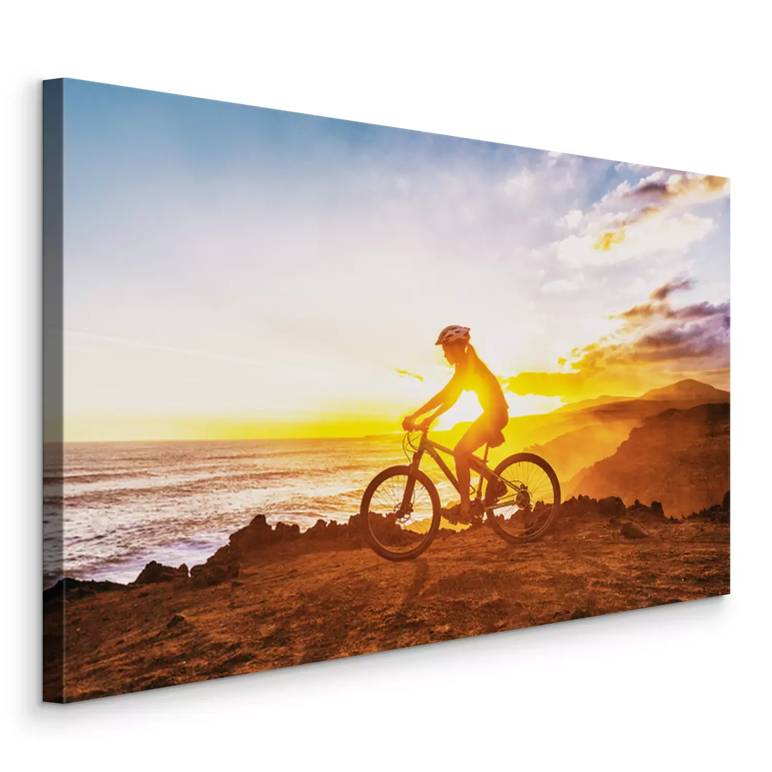 Tableau  MTB mountain biking cyclist woman rider riding bike on summer coastal trail sunset landscape. Girl silhouette of athlete doing cycle sports outdoor. Healthy and Active lifestyle.