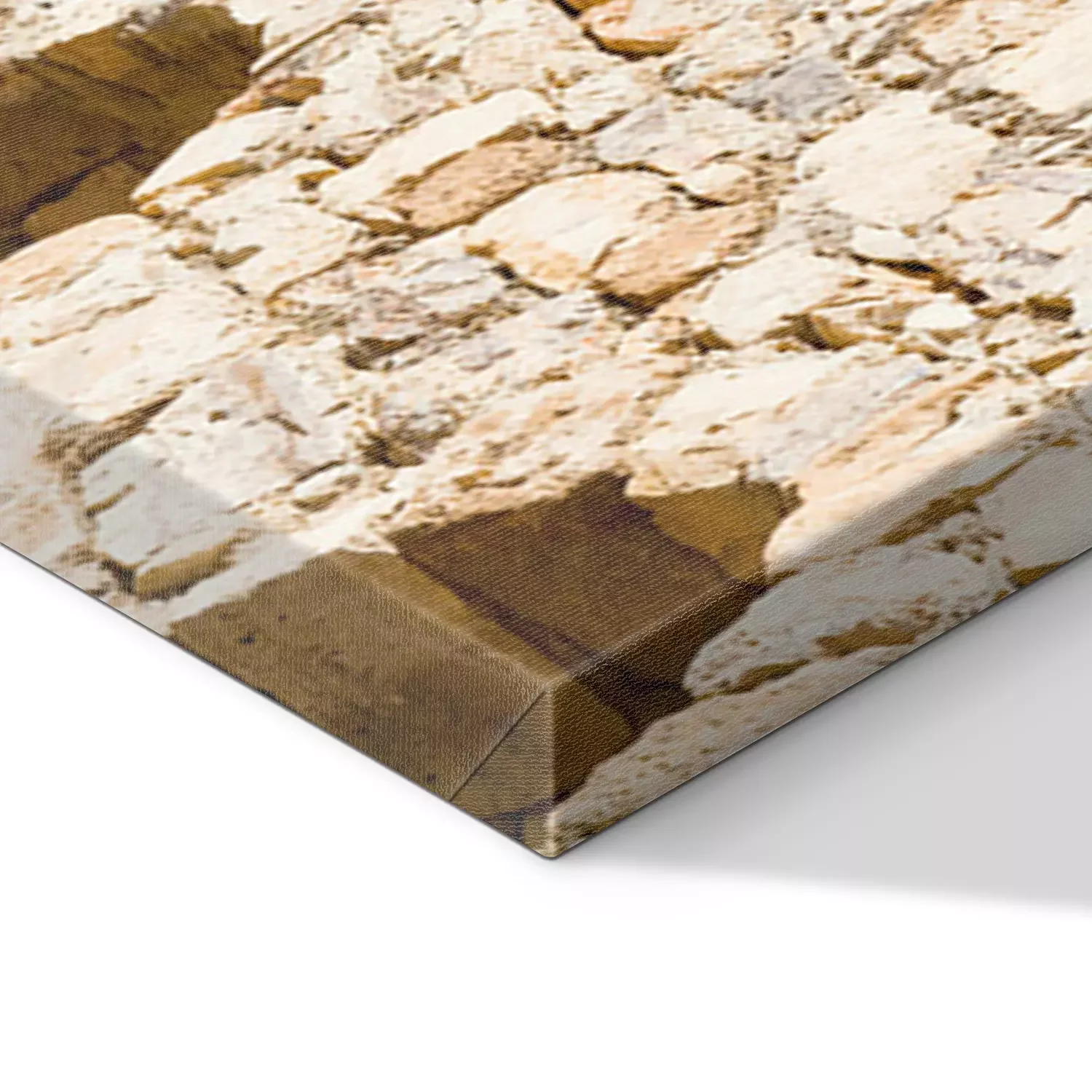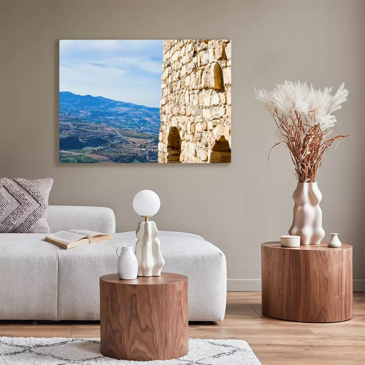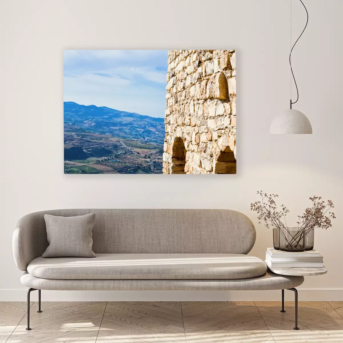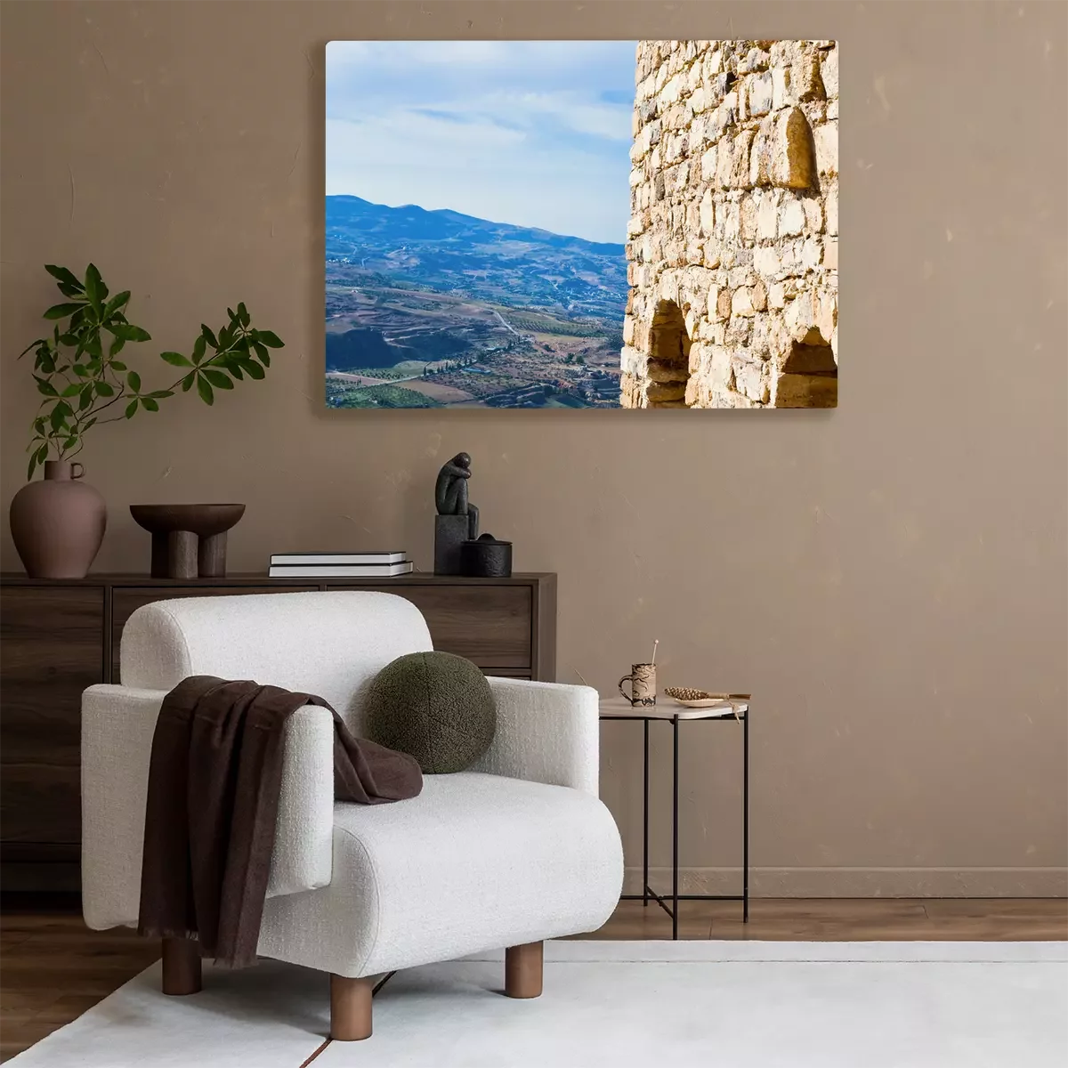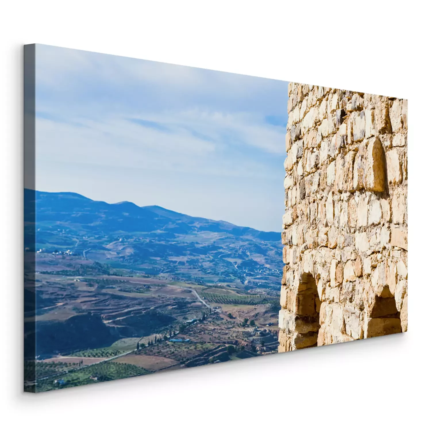 Tableau  mur de pierre du château de Kerak et vue sur la vallée de montagne