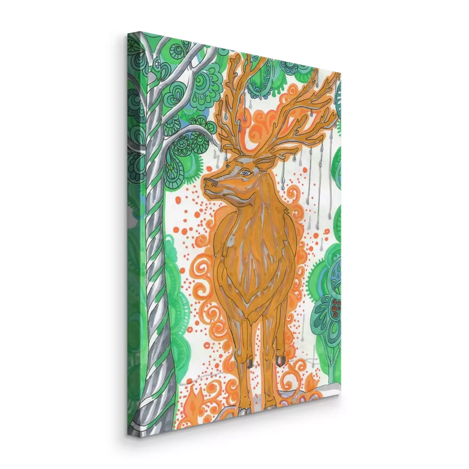 Tableau : Mythical Scandinavian deer "Eykturmir" in yellow with drops of water on his horns in the green forest