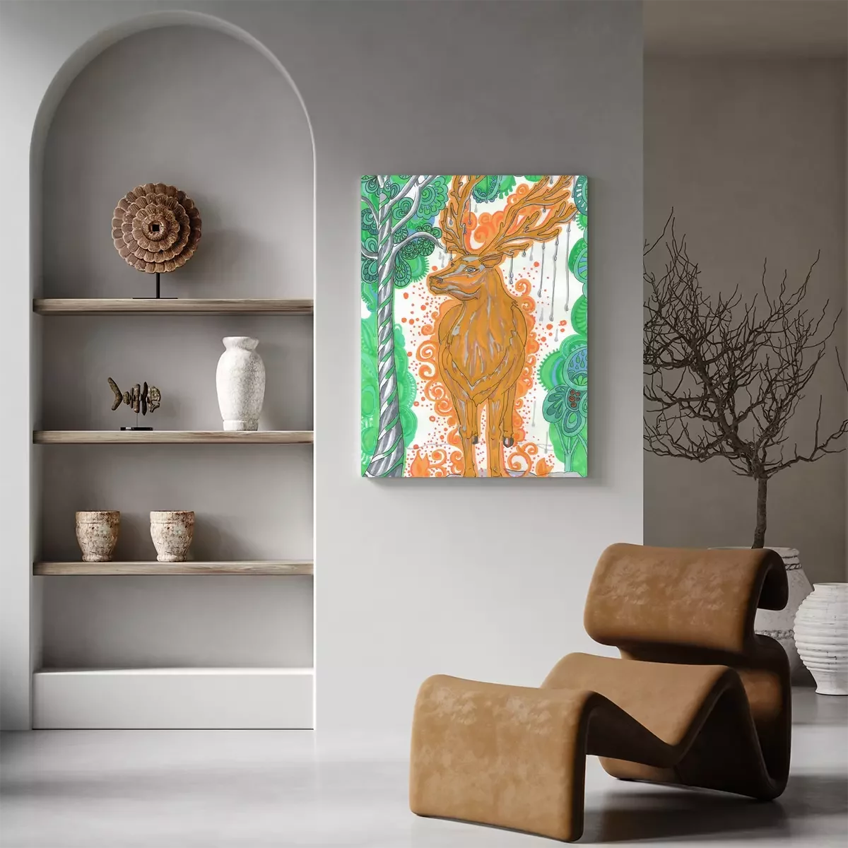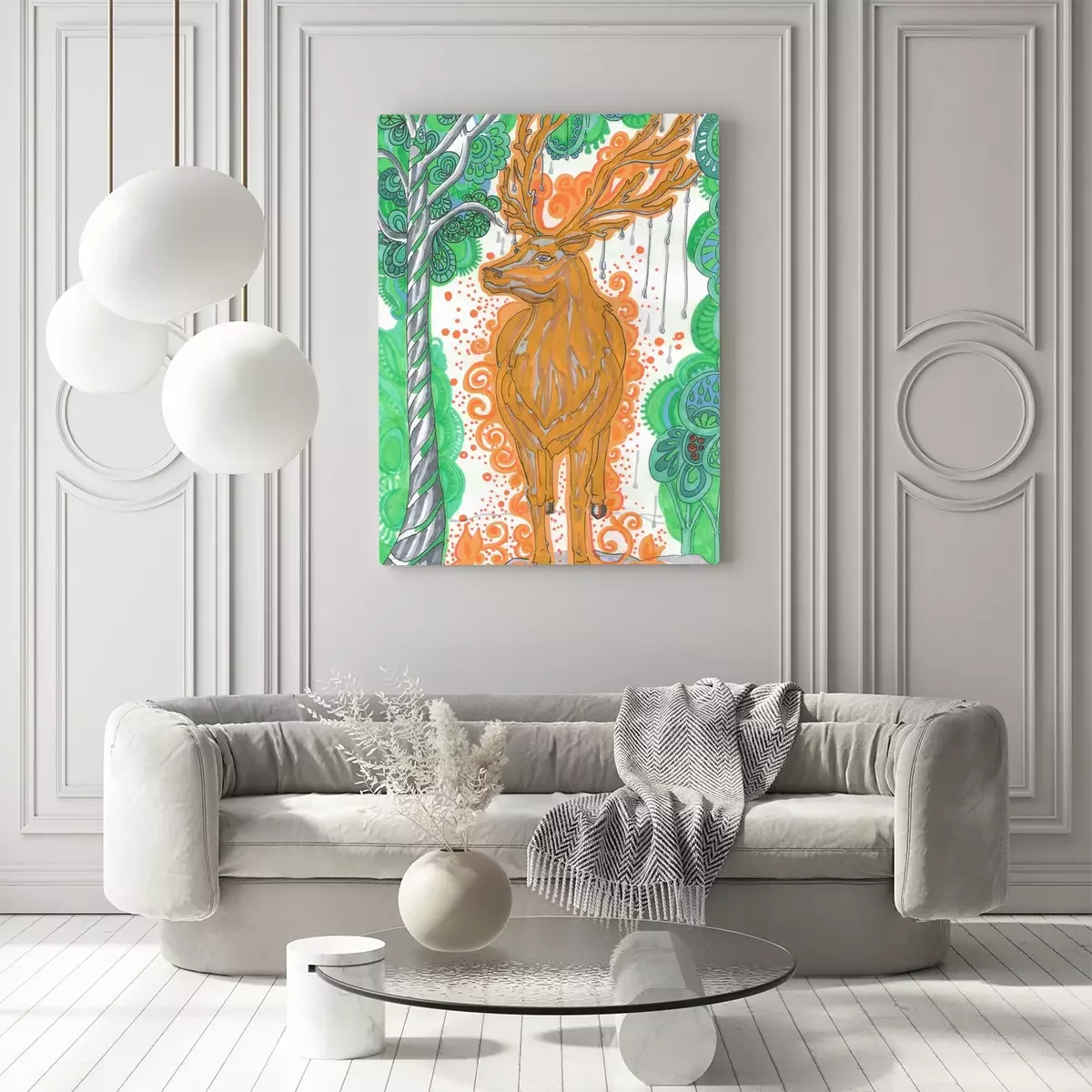 Tableau  Mythical Scandinavian deer "Eykturmir" in yellow with drops of water on his horns in the green forest