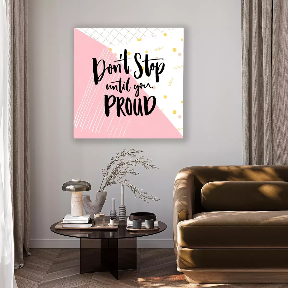 Tableau  N'arrêtez pas jusqu'à ce que vous êtes fier. Citation de motivation sur le fond abstrait de géométrie. Vecteur, motivation, dire, pour, affiches