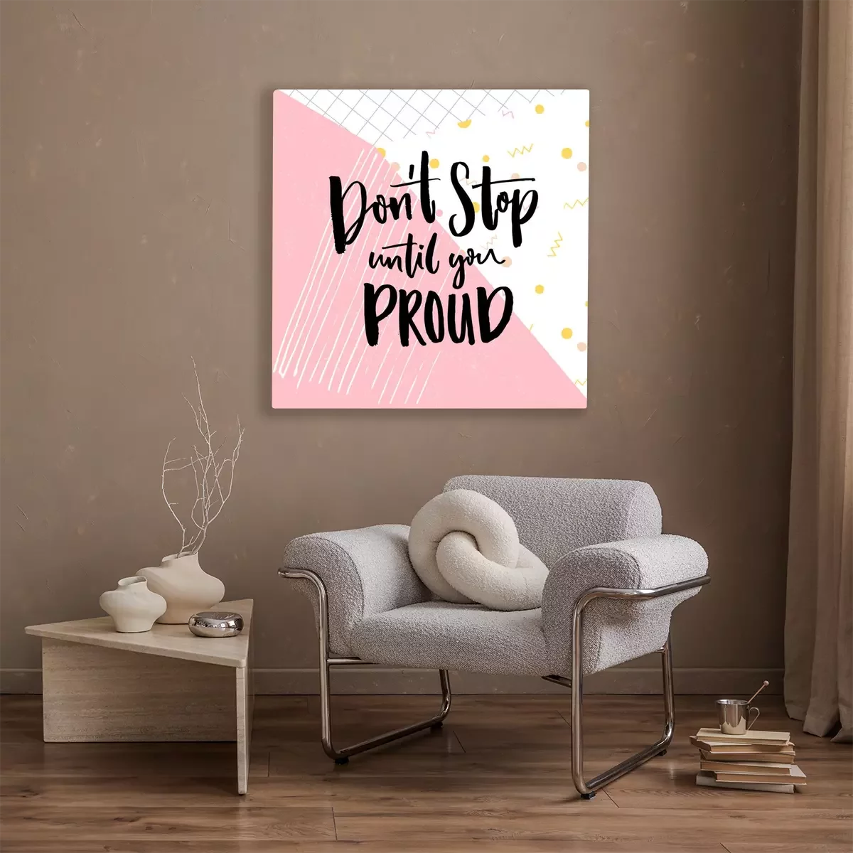 Tableau : N'arrêtez pas jusqu'à ce que vous êtes fier. Citation de motivation sur le fond abstrait de géométrie. Vecteur, motivation, dire, pour, affiches