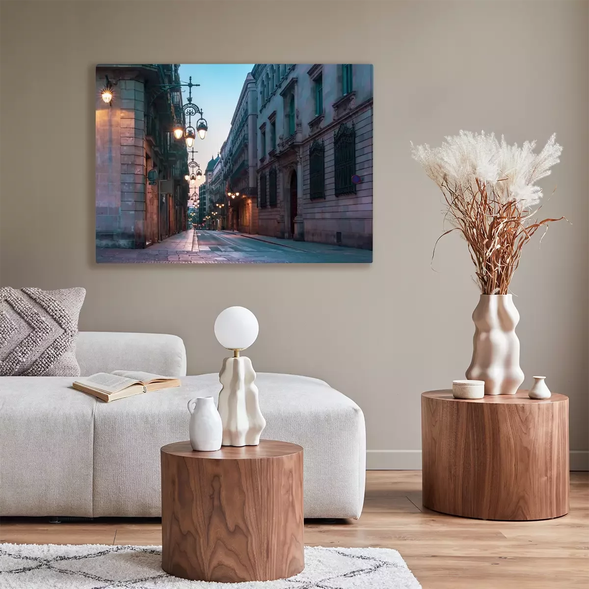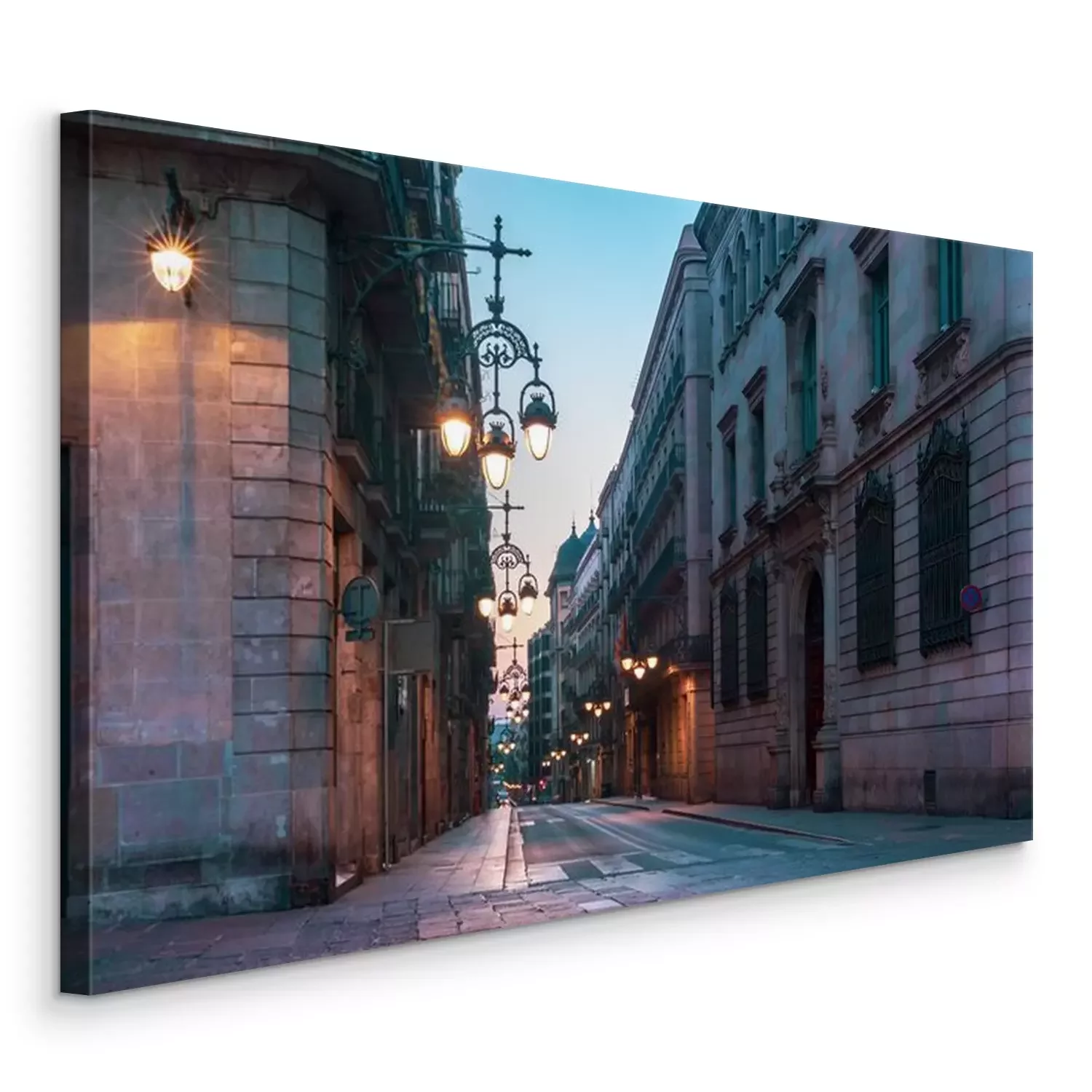 Tableau  Narrow cobbled medieval empty street with beautiful street lights in Barri Gothic Quarter in the morning, Barcelona, Catalonia, Spain