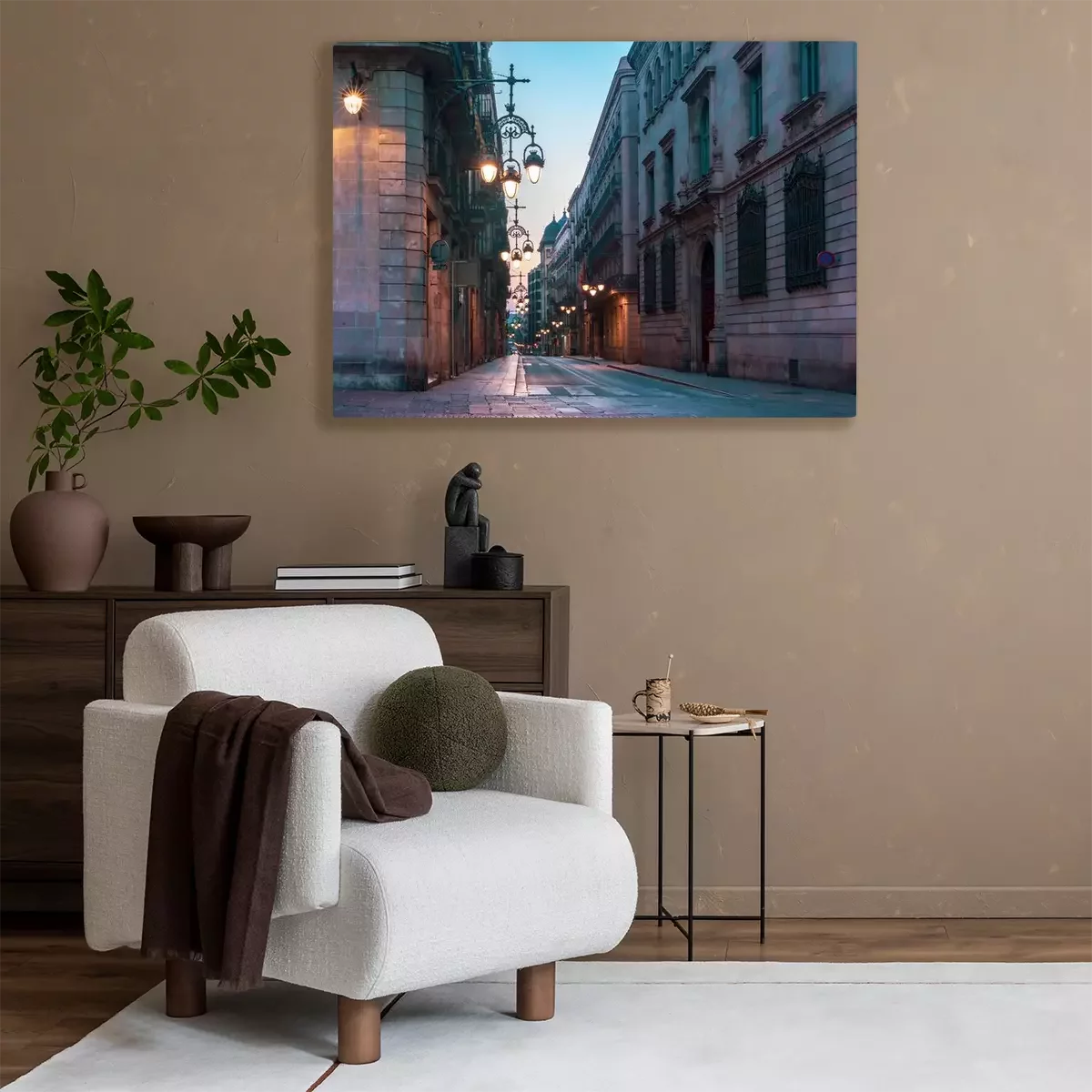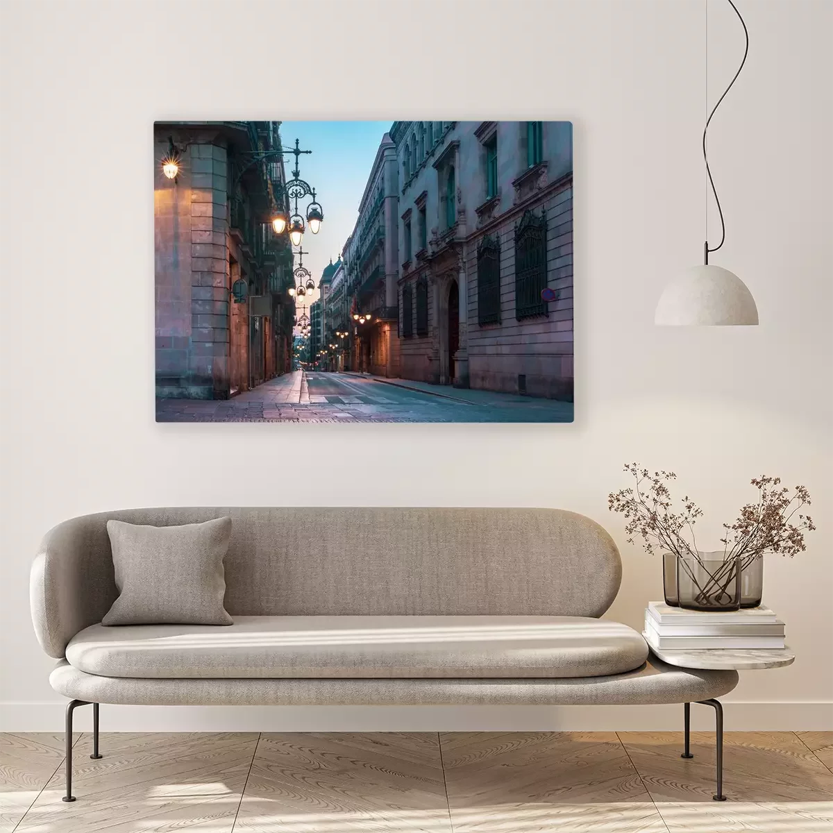 Tableau : Narrow cobbled medieval empty street with beautiful street lights in Barri Gothic Quarter in the morning, Barcelona, Catalonia, Spain