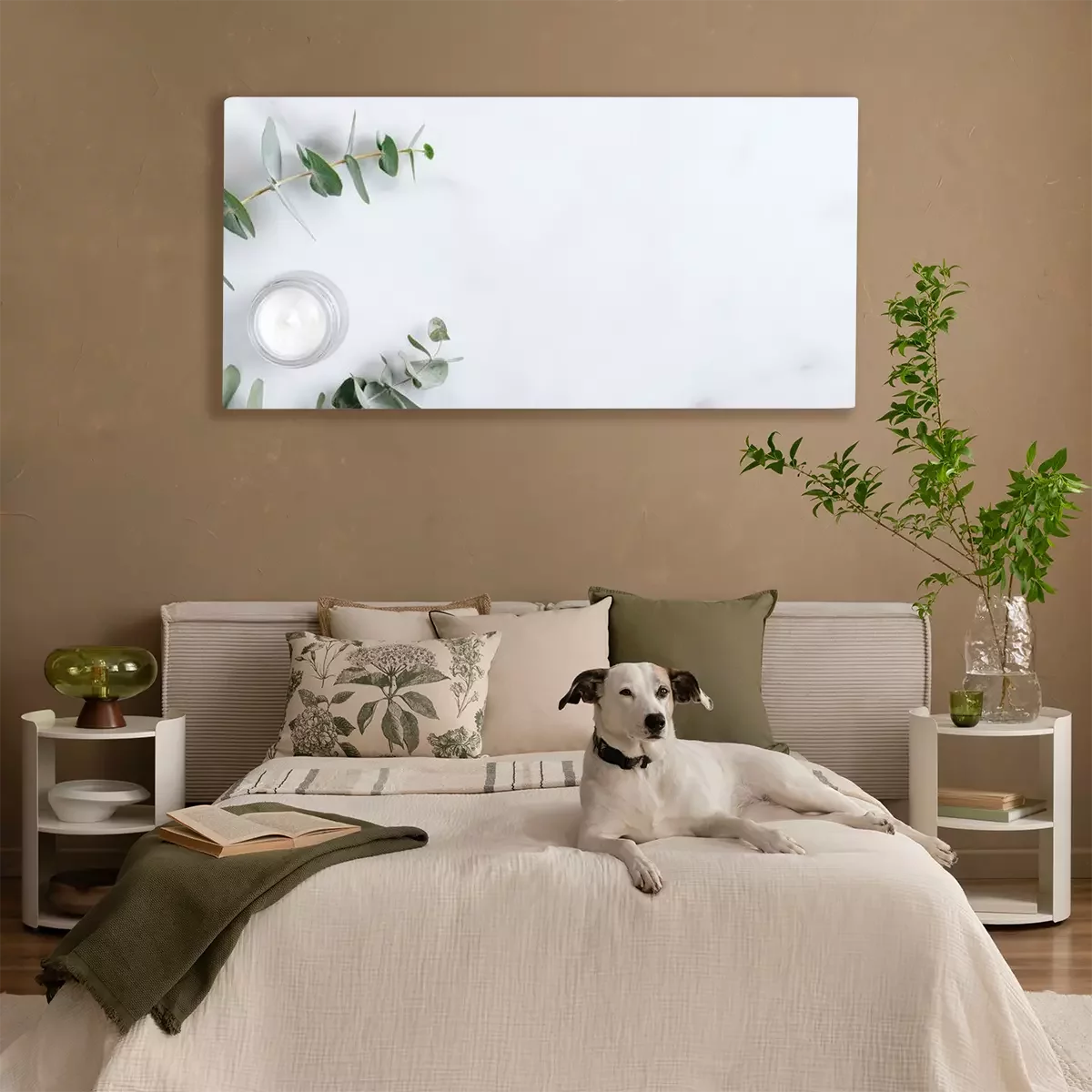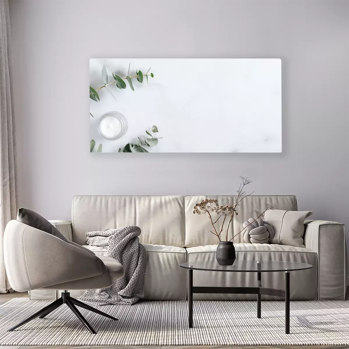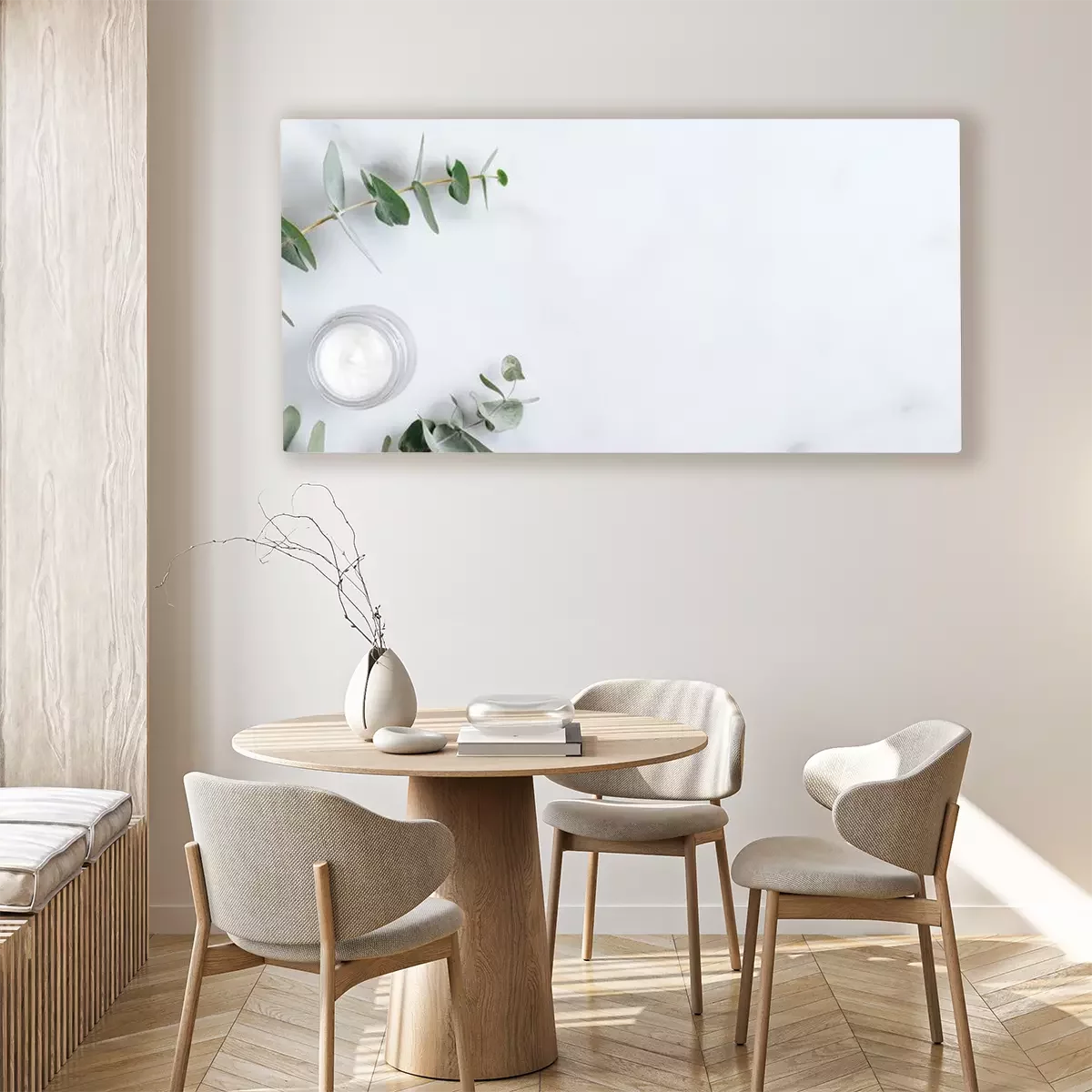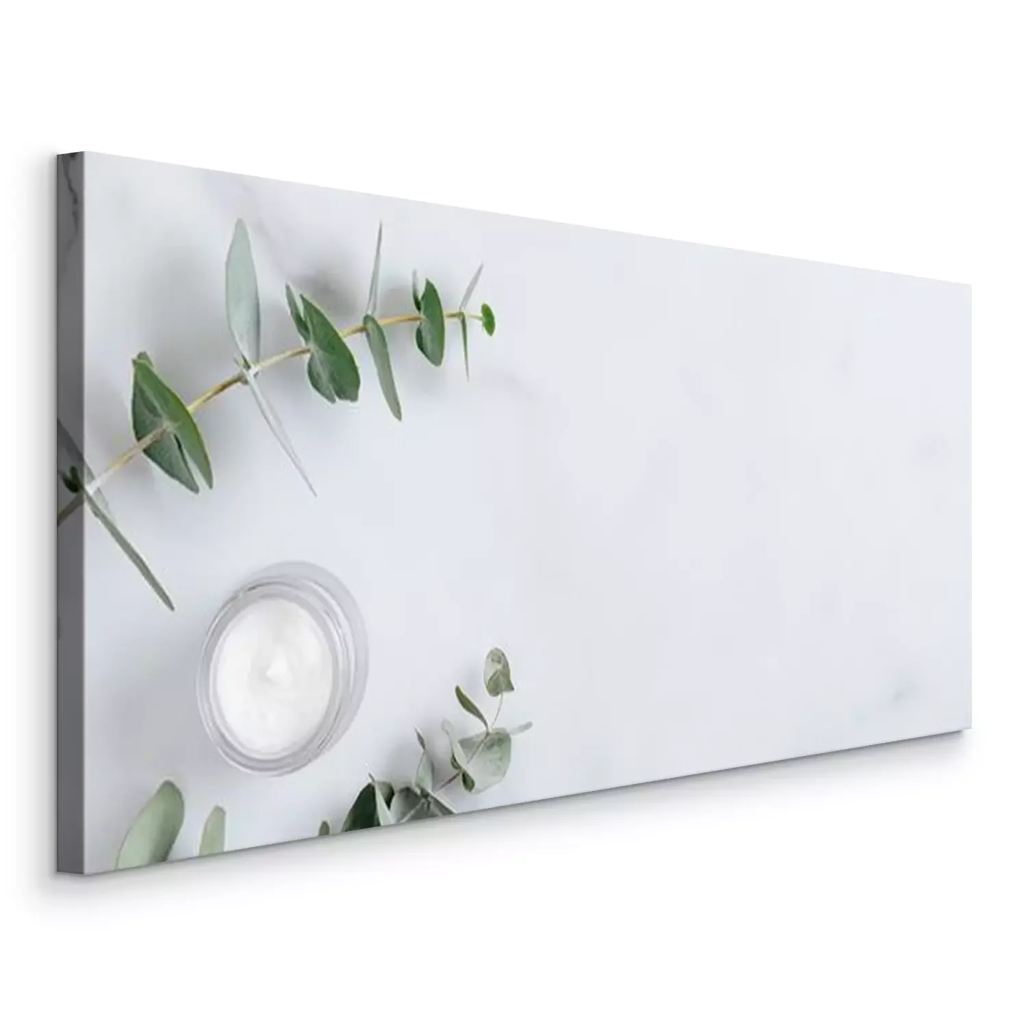 Tableau  Natural organic cream jar with eucalyptus leaves on marble background. Flat lay, top view, copy space. Natural organic product, beauty and spa concept