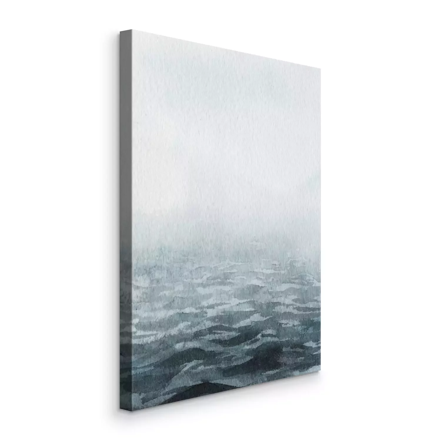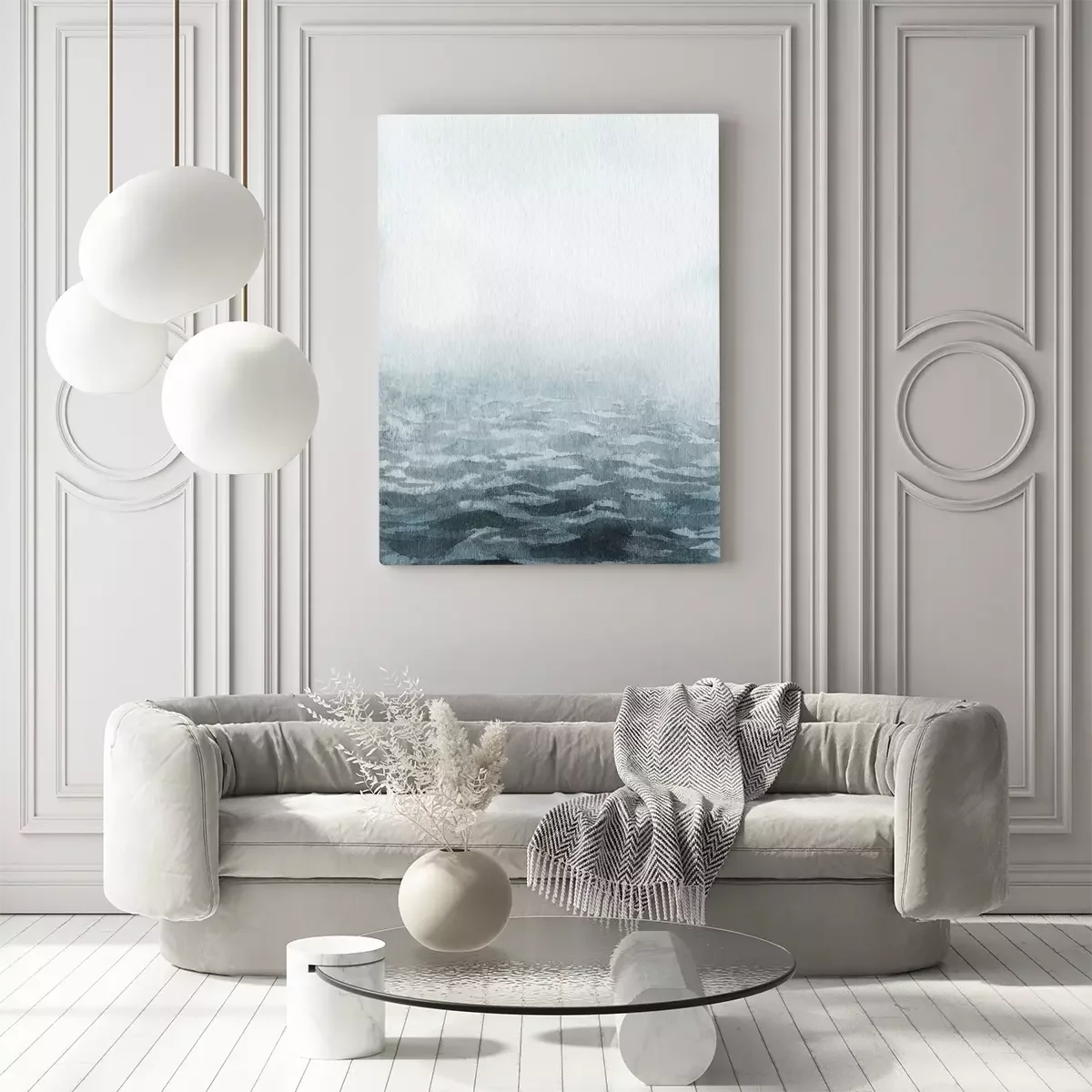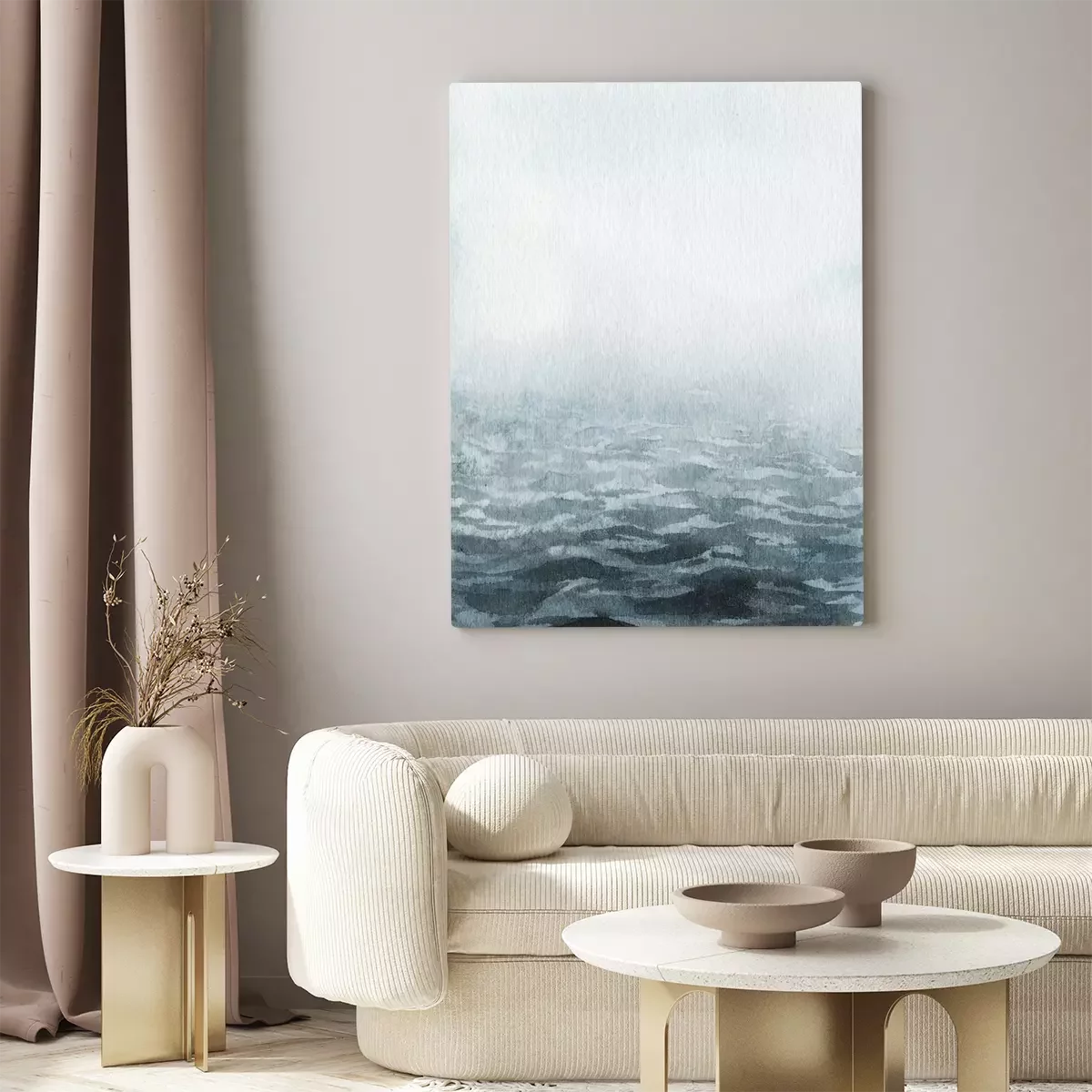 Tableau  Neo-noir landscape. Blue river / lake / sea / ocean in fog - hand drawn watercolor painting in minimalist style. Pre-made scene, background.