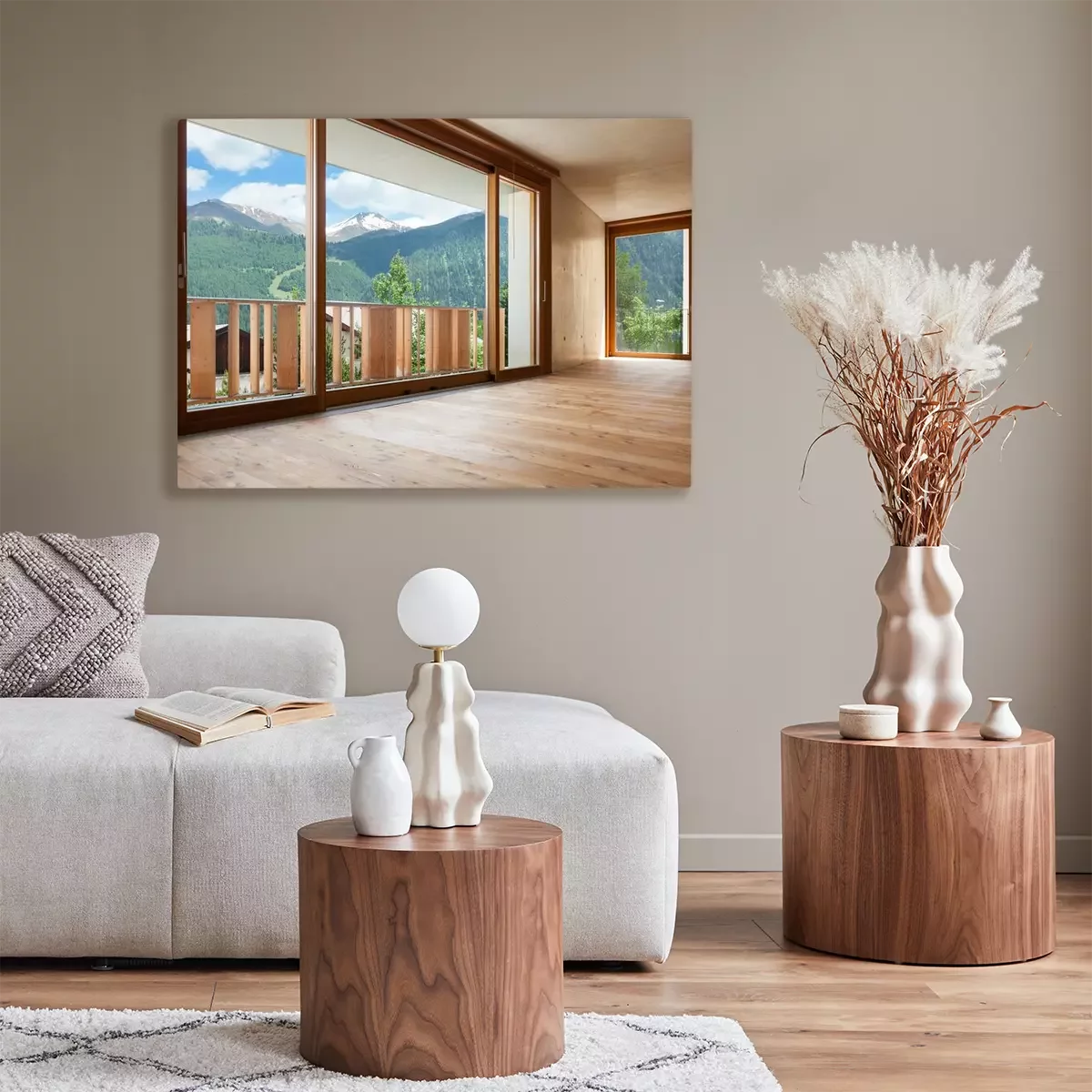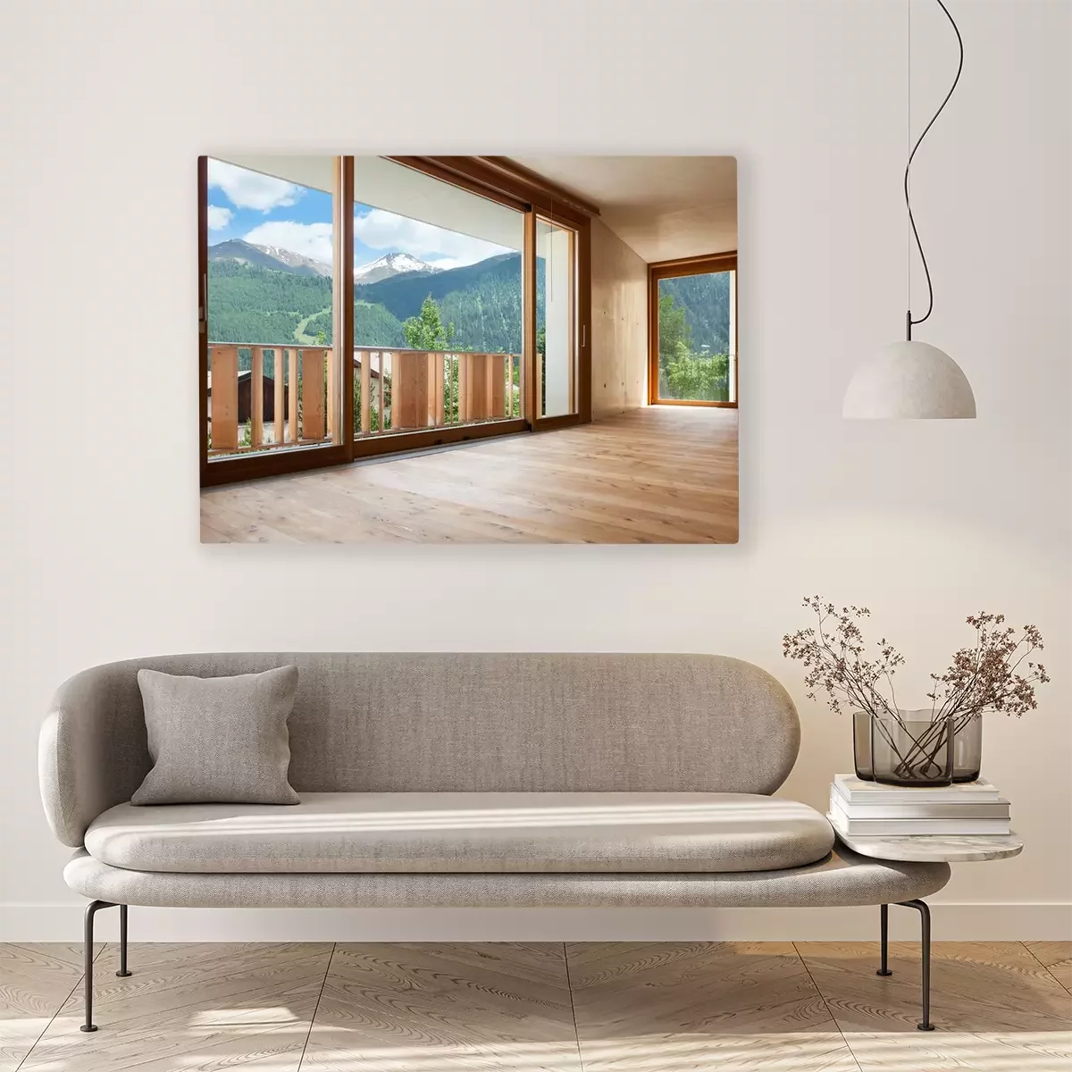 Tableau  nouvel appartement, chambre avec des murs en béton, grande fenêtre