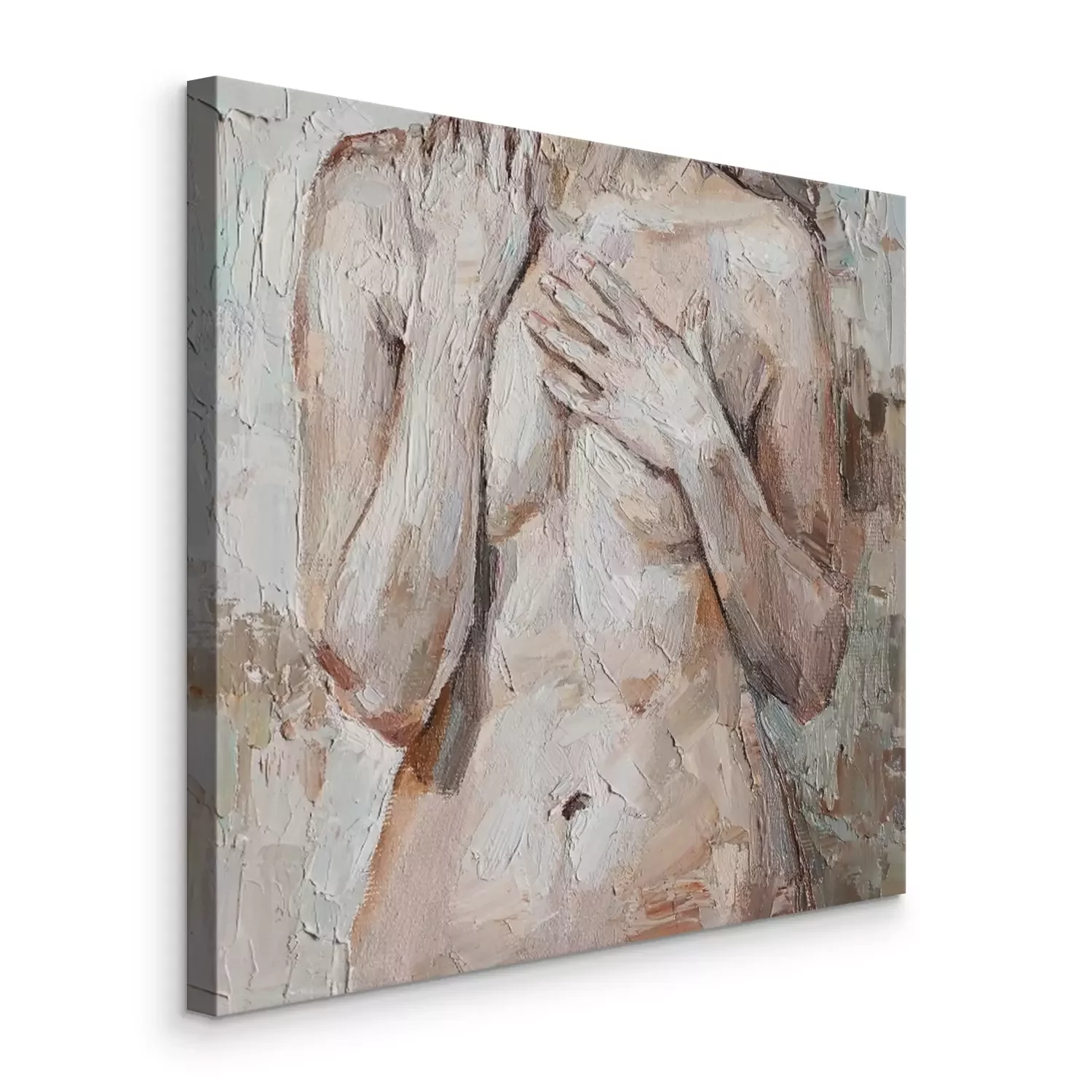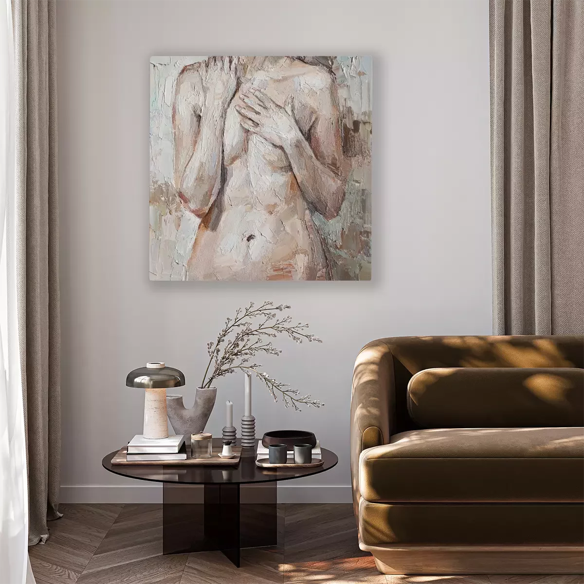 Tableau  Nude attractive young woman, created in details and color nuances. Colors: white, gray, brown. Oil painting on canvas.