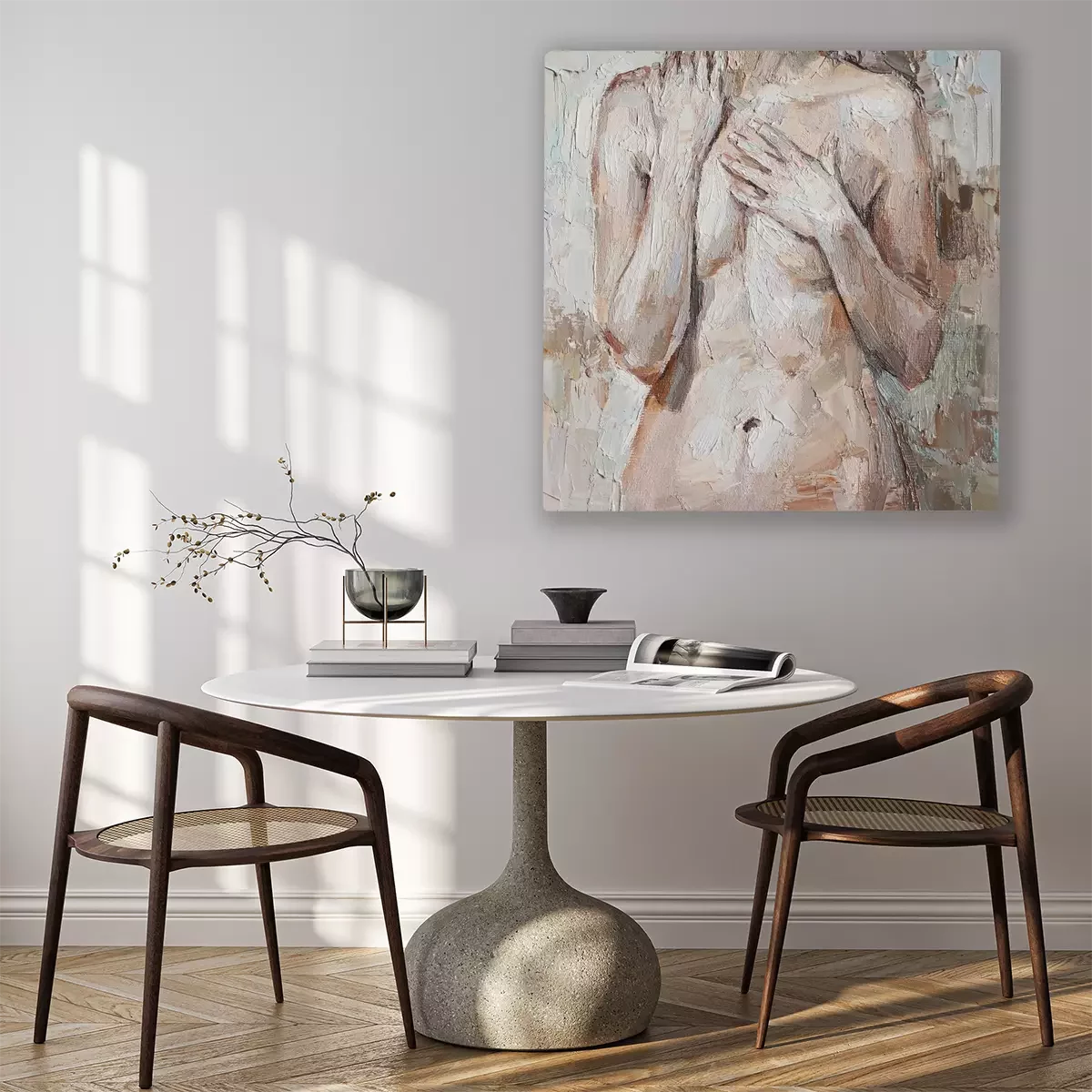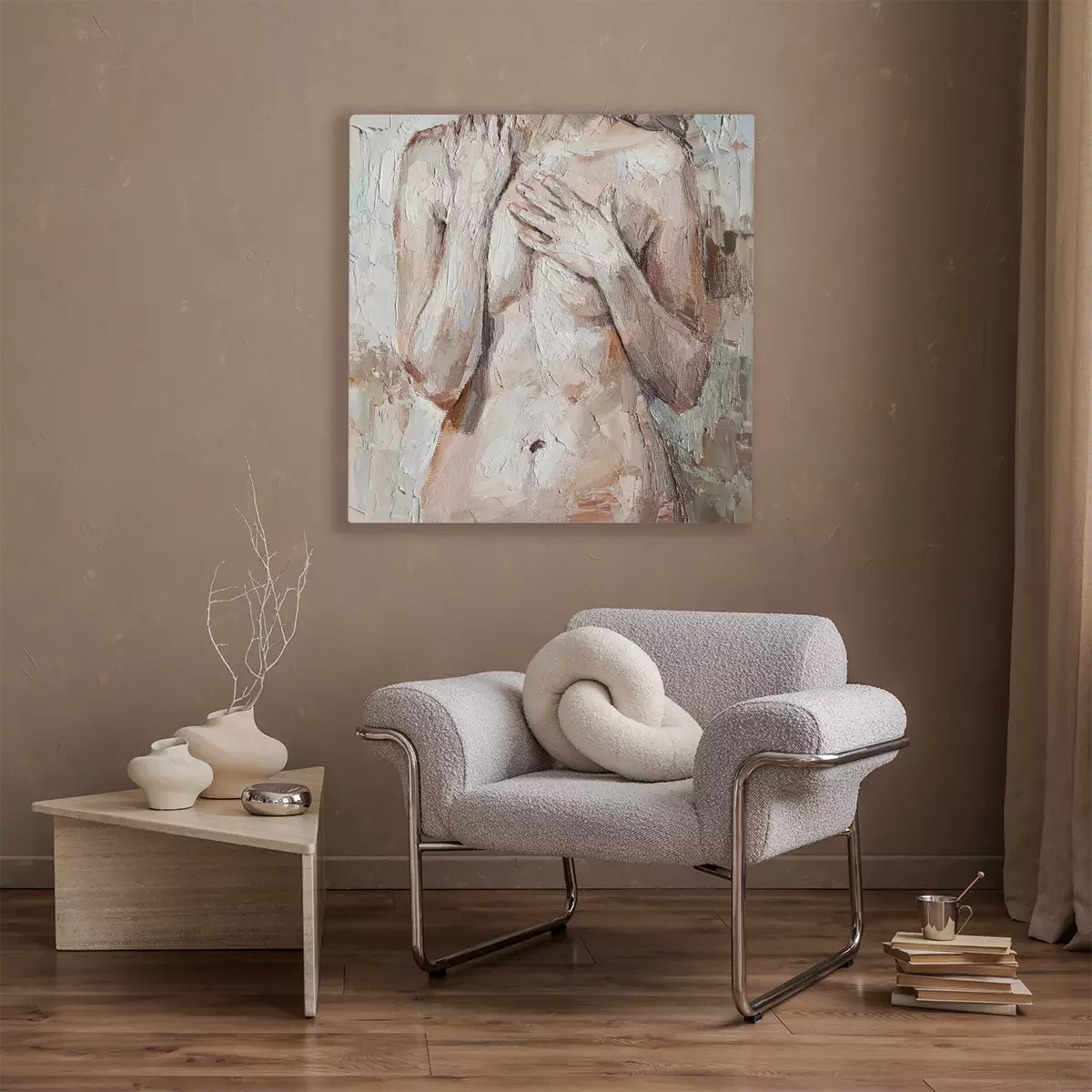 Tableau : Nude attractive young woman, created in details and color nuances. Colors: white, gray, brown. Oil painting on canvas.