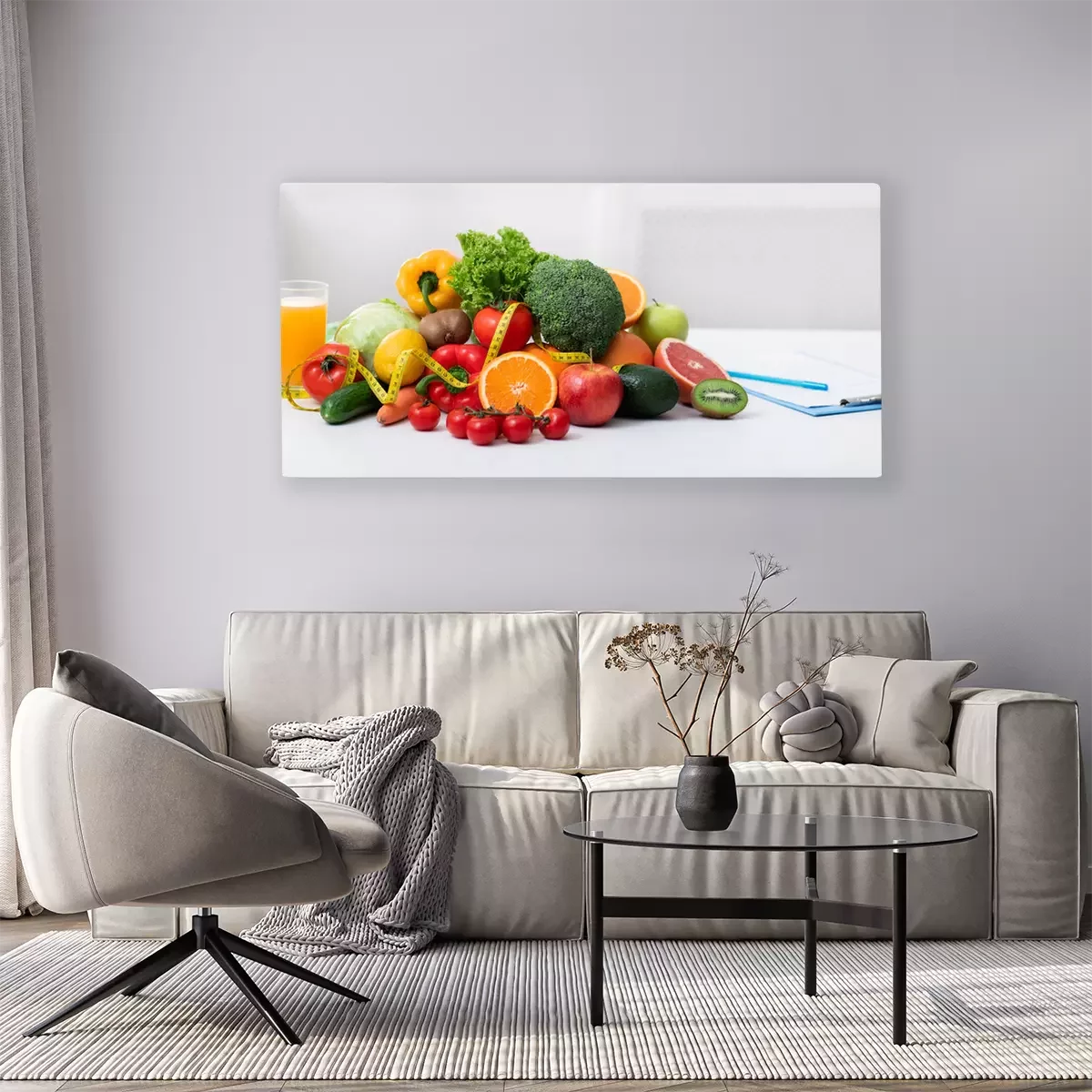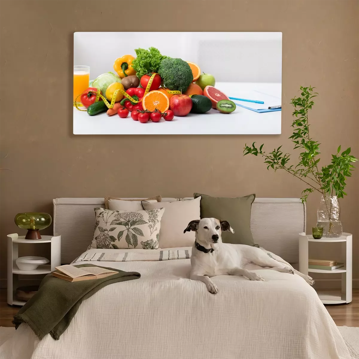Tableau : Nutritionist's workplace with fruits, vegetables, measuring tape on table