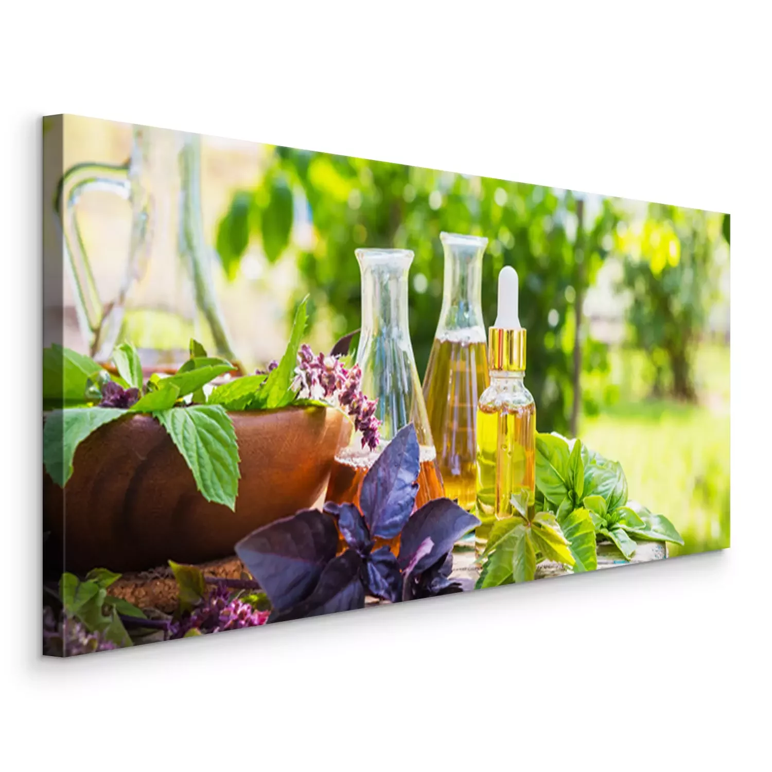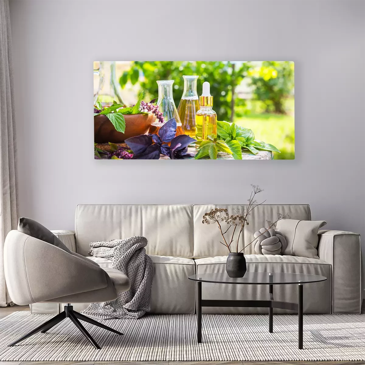 Tableau : Oil for skin care, massage from natural ingredients, herbs, mint in glass jars and test tubes on a green background in the garden on the nature, natural cosmetics