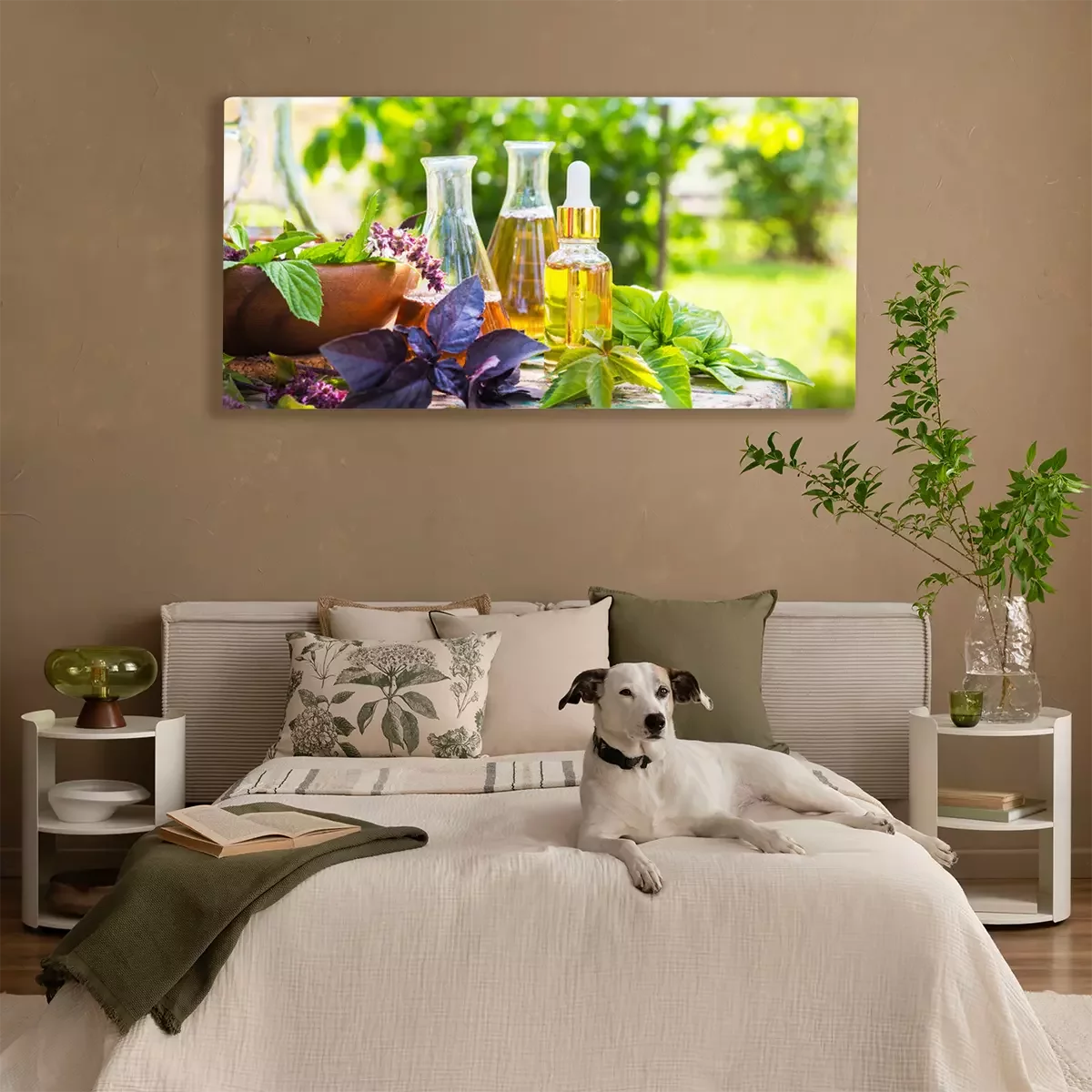 Tableau  Oil for skin care, massage from natural ingredients, herbs, mint in glass jars and test tubes on a green background in the garden on the nature, natural cosmetics