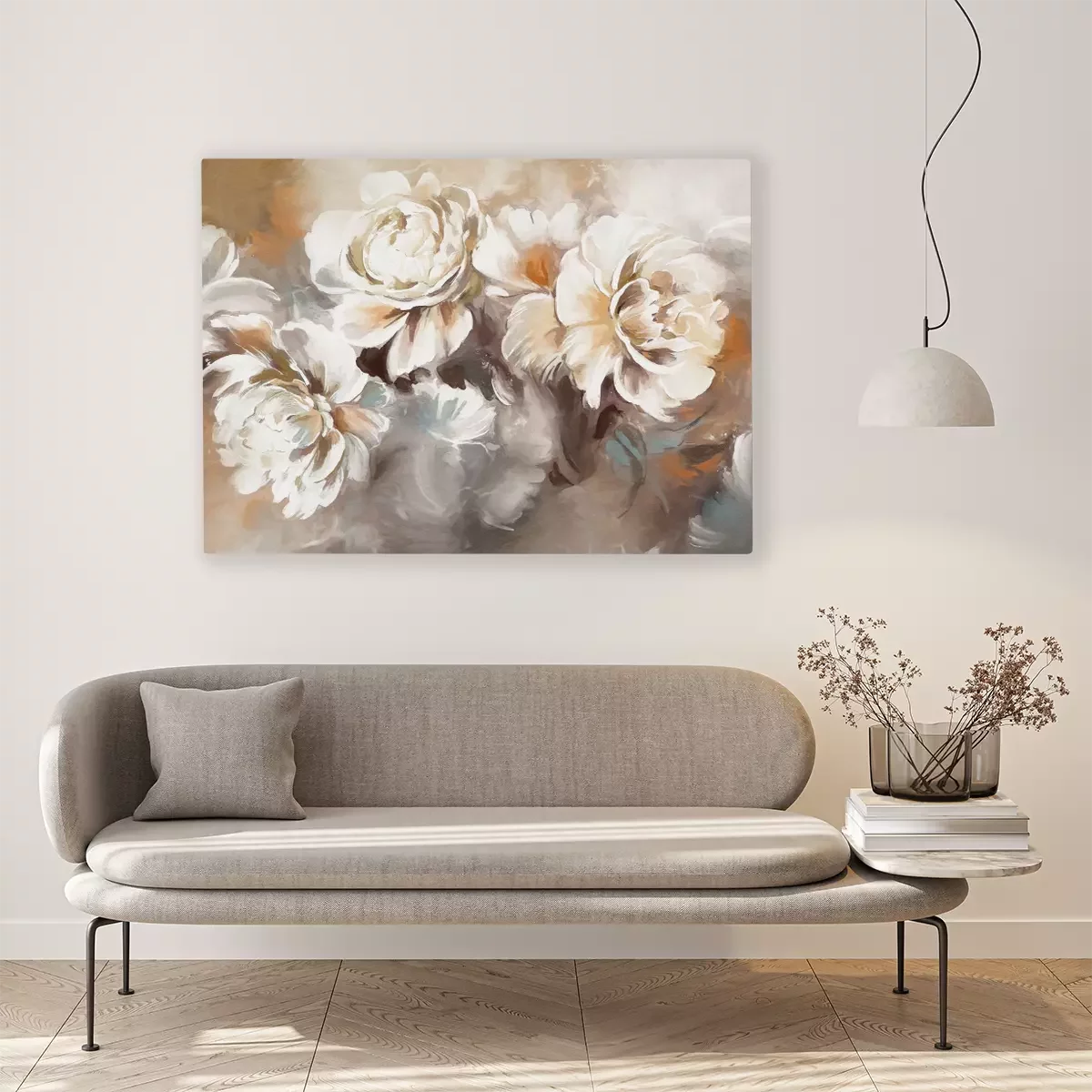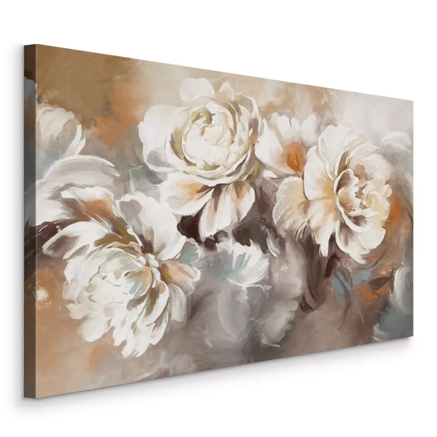 Tableau  Oil painting with flower rose, peonies, gold leaves. Botanic print background on canvas -  floral triptych In Interior, art.