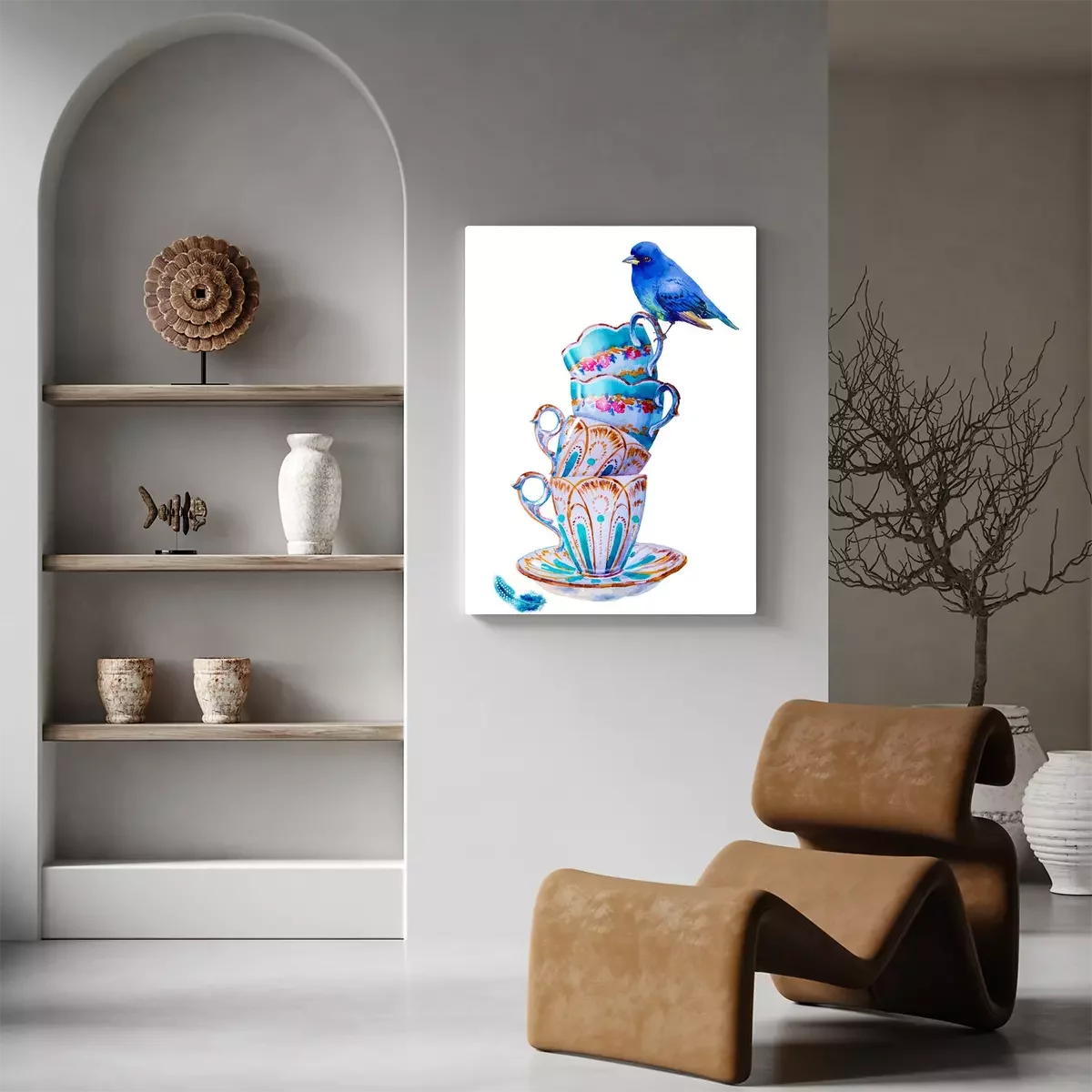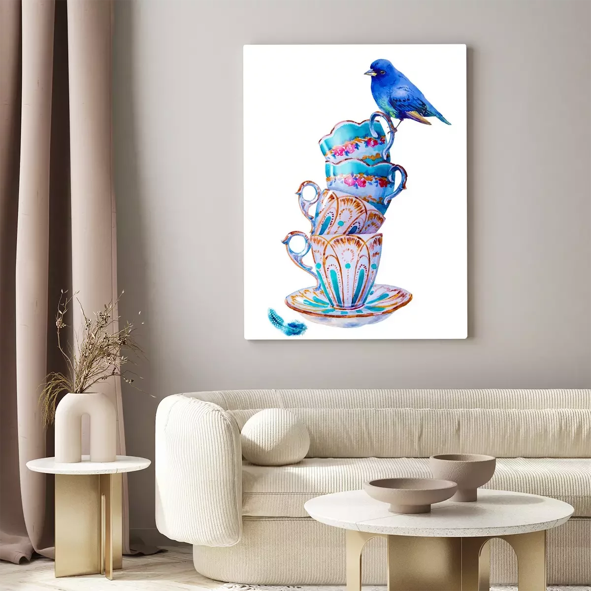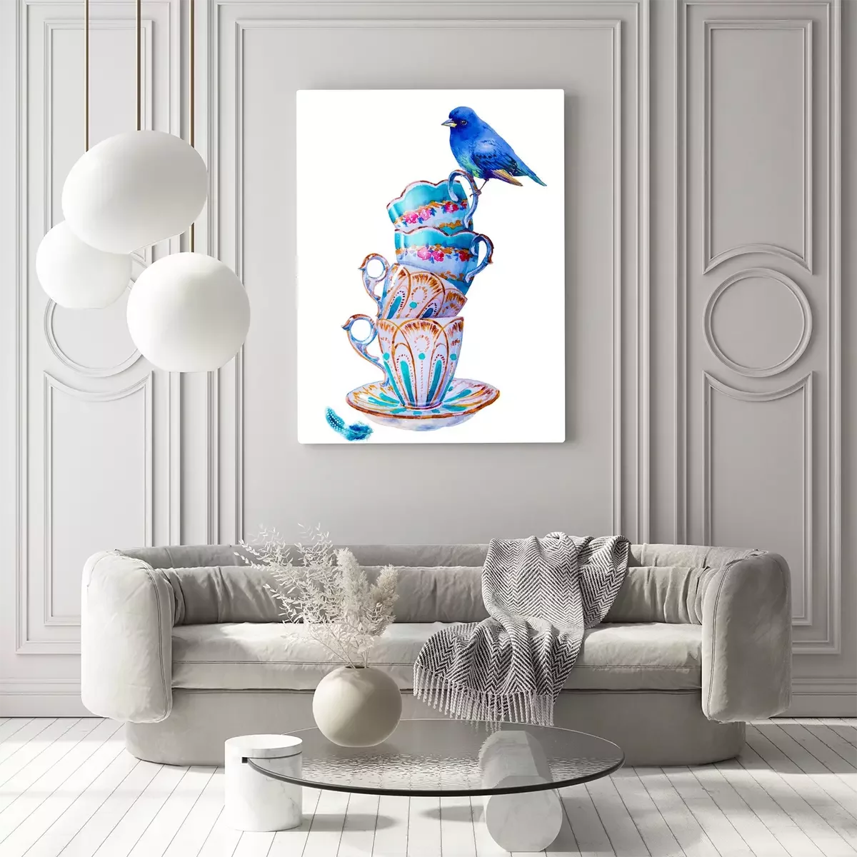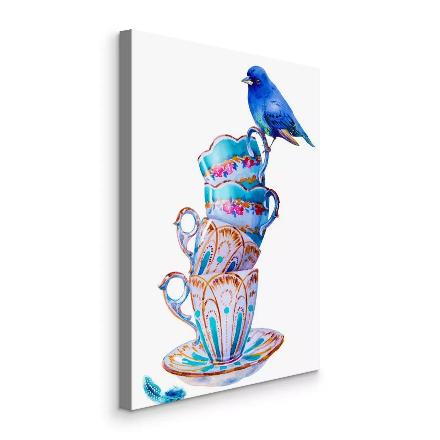 Tableau : Oiseau bleu et tasses shabby chic