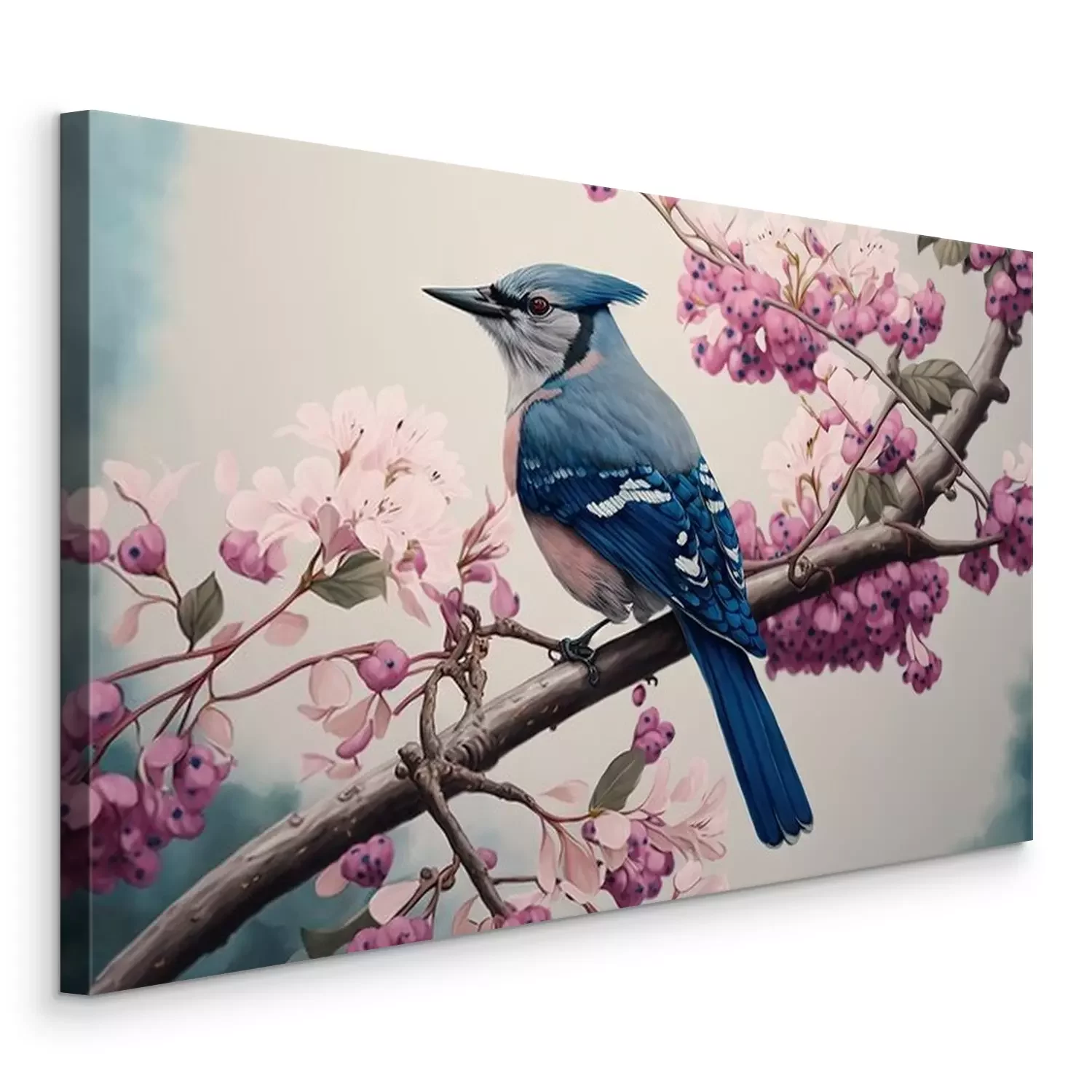 Tableau : Oiseau bleu sur une branche d'arbre de printemps