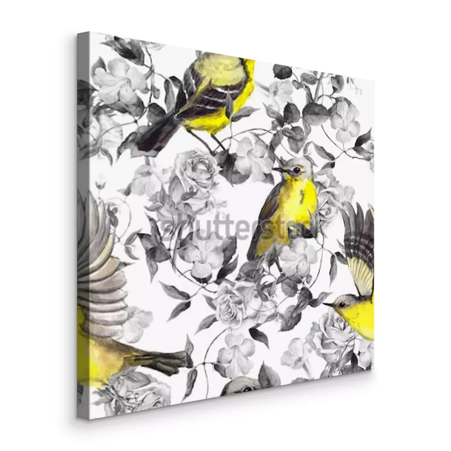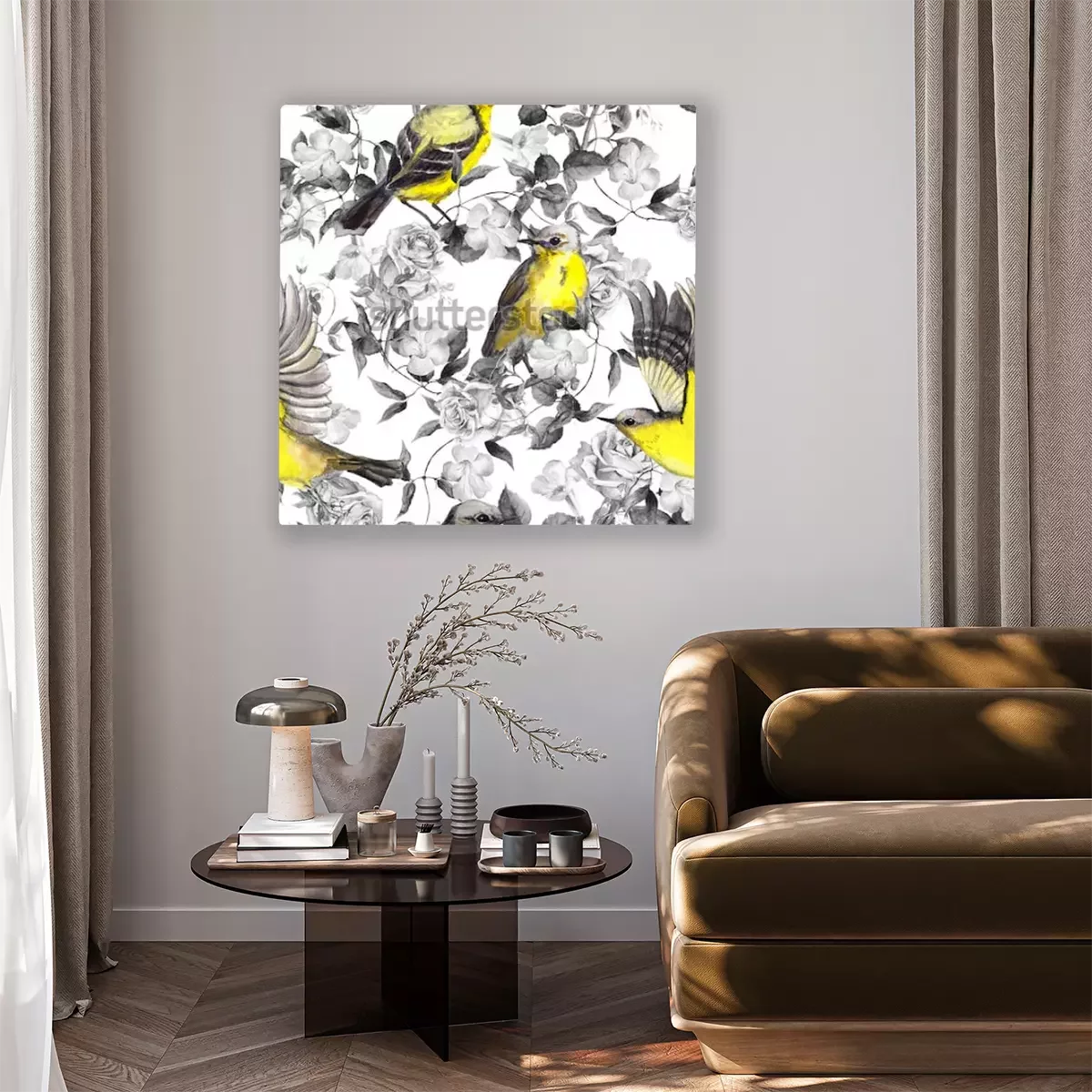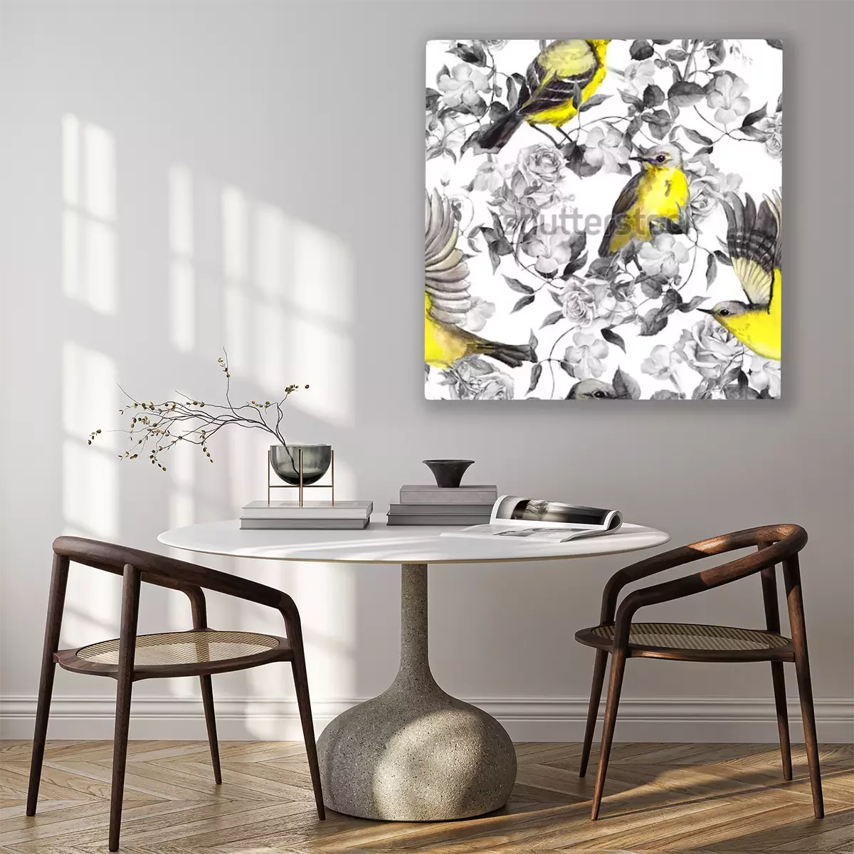 Tableau  Oiseau jaune et fleurs noires et blanches