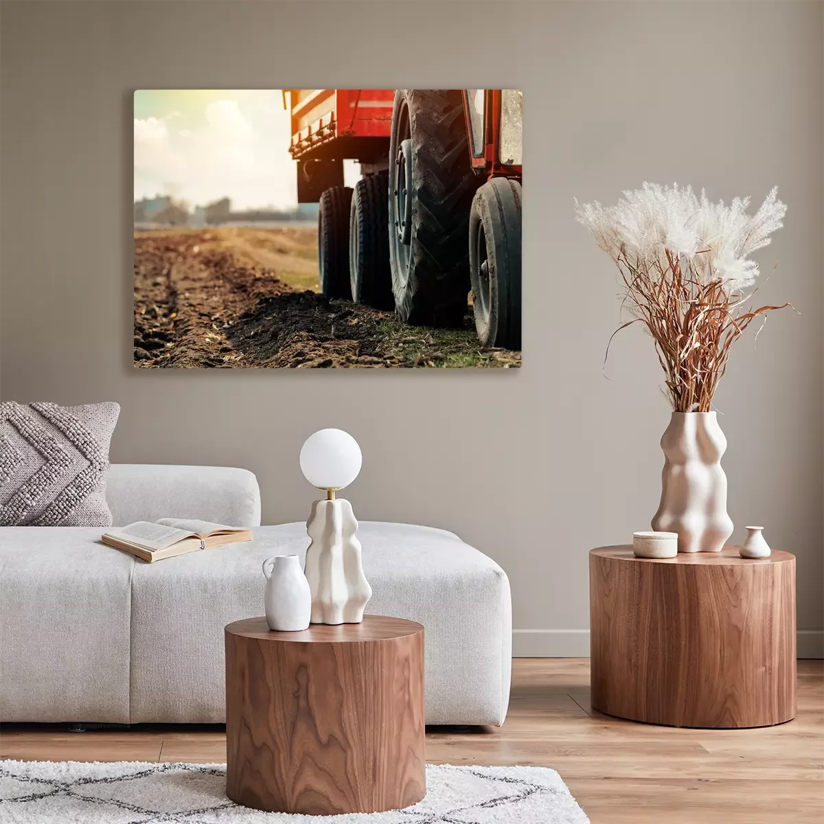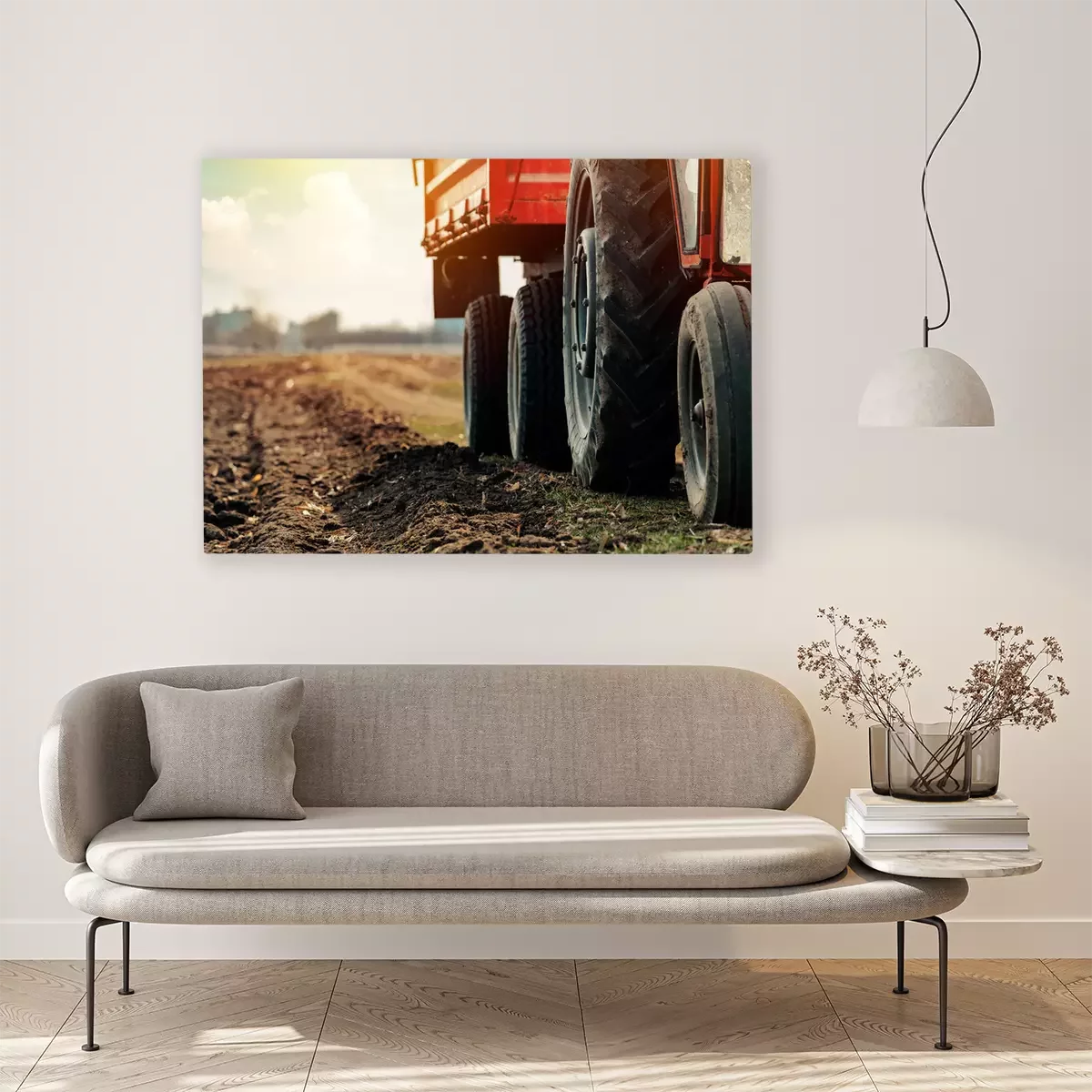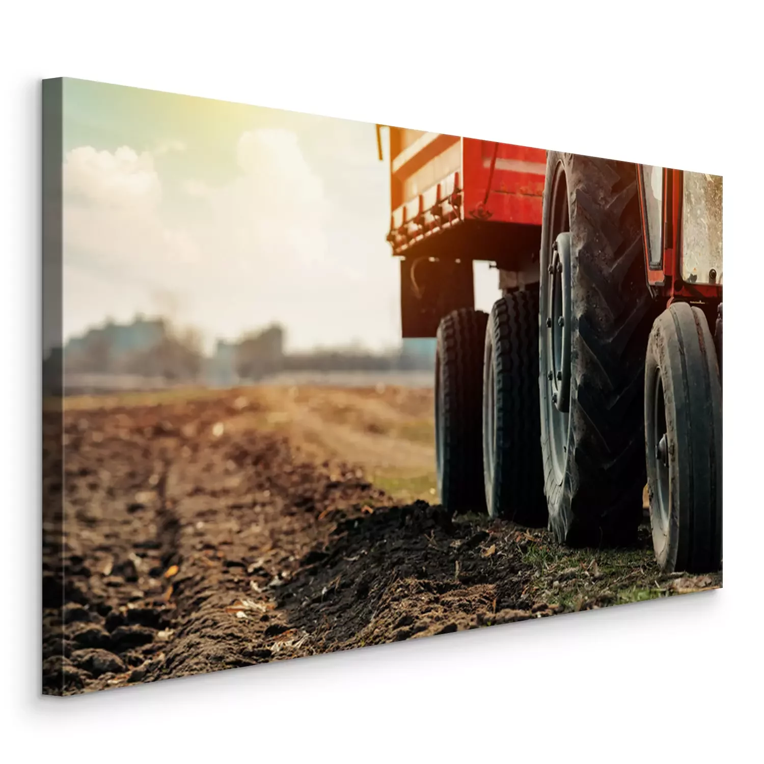 Tableau  Old red agricultural tractor with trailer on dirt countryside road