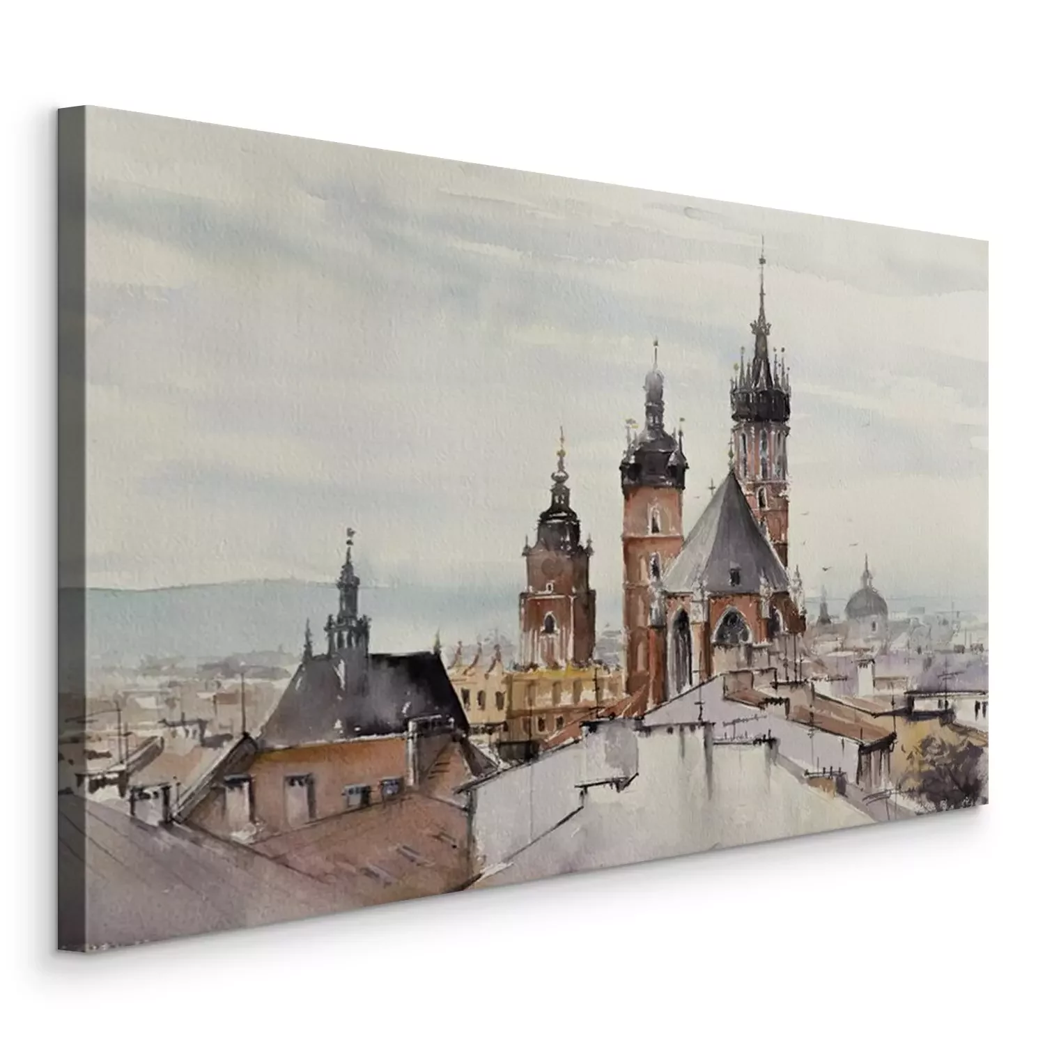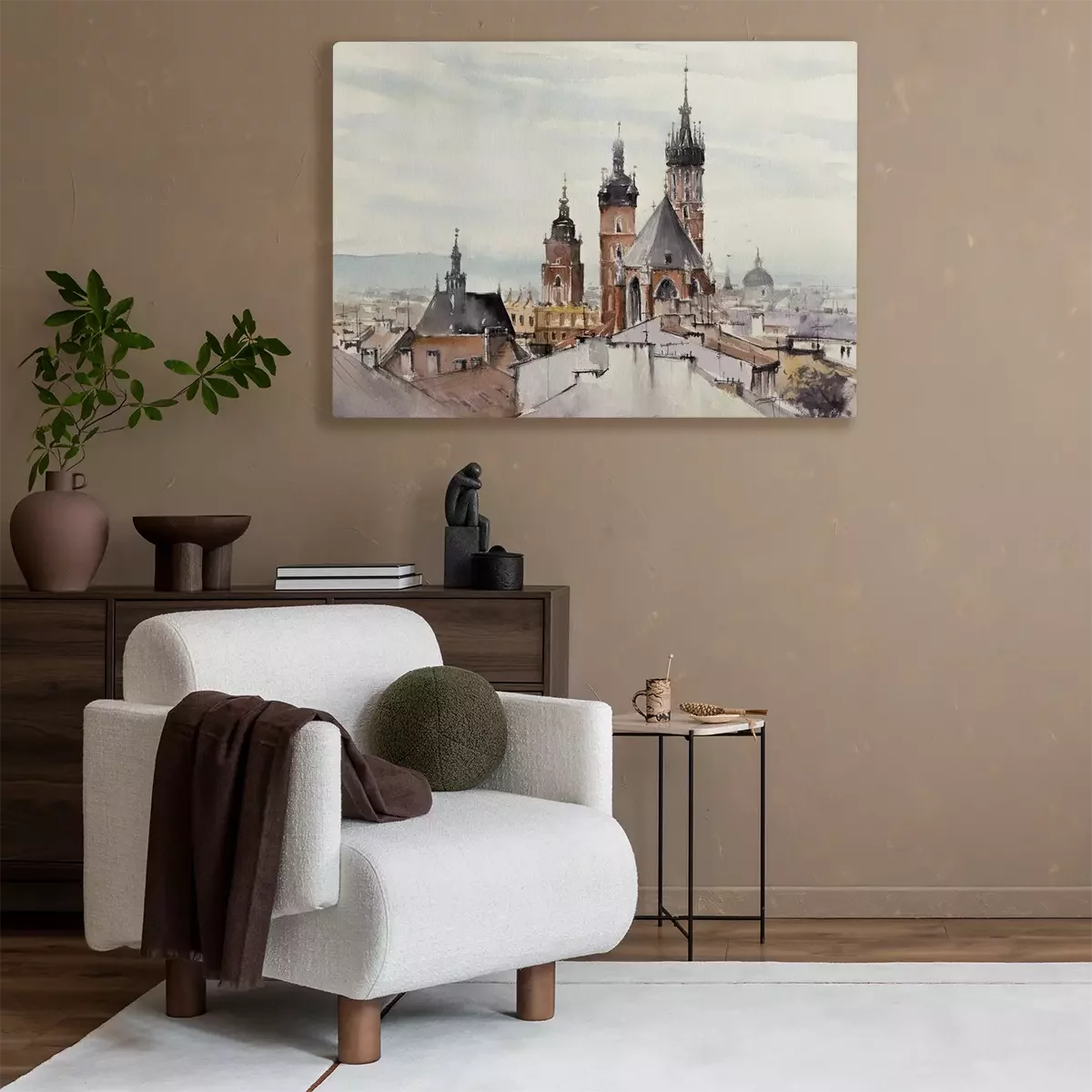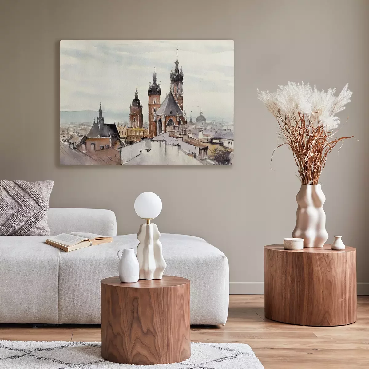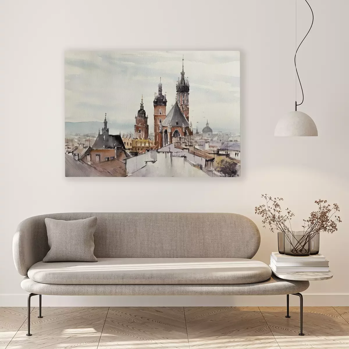 Tableau  Old town, Kracow, Poland with Miariacki Church in background.Picture created with watercolors.