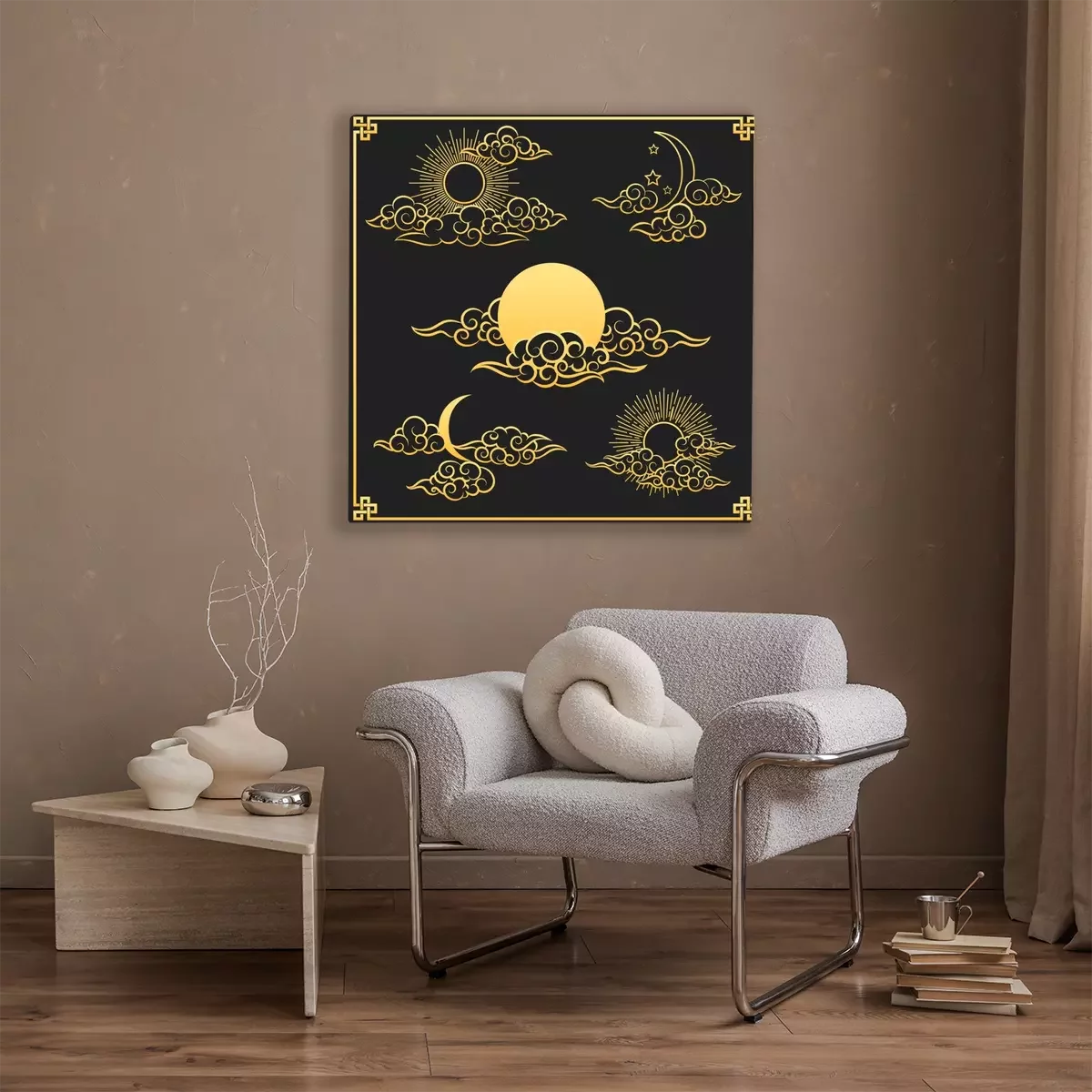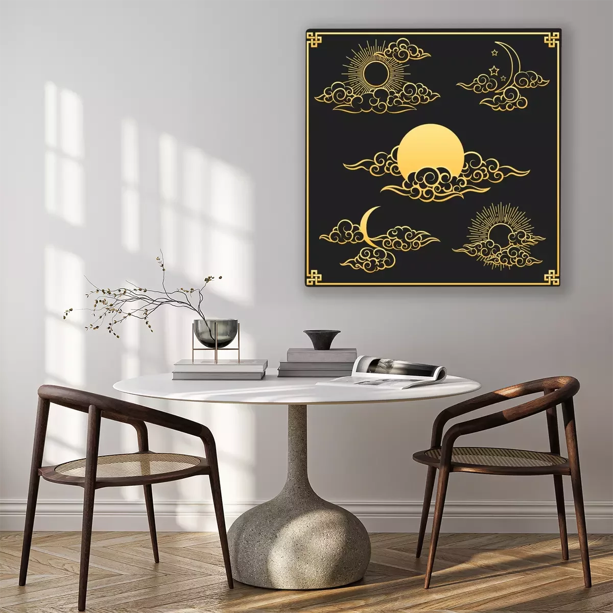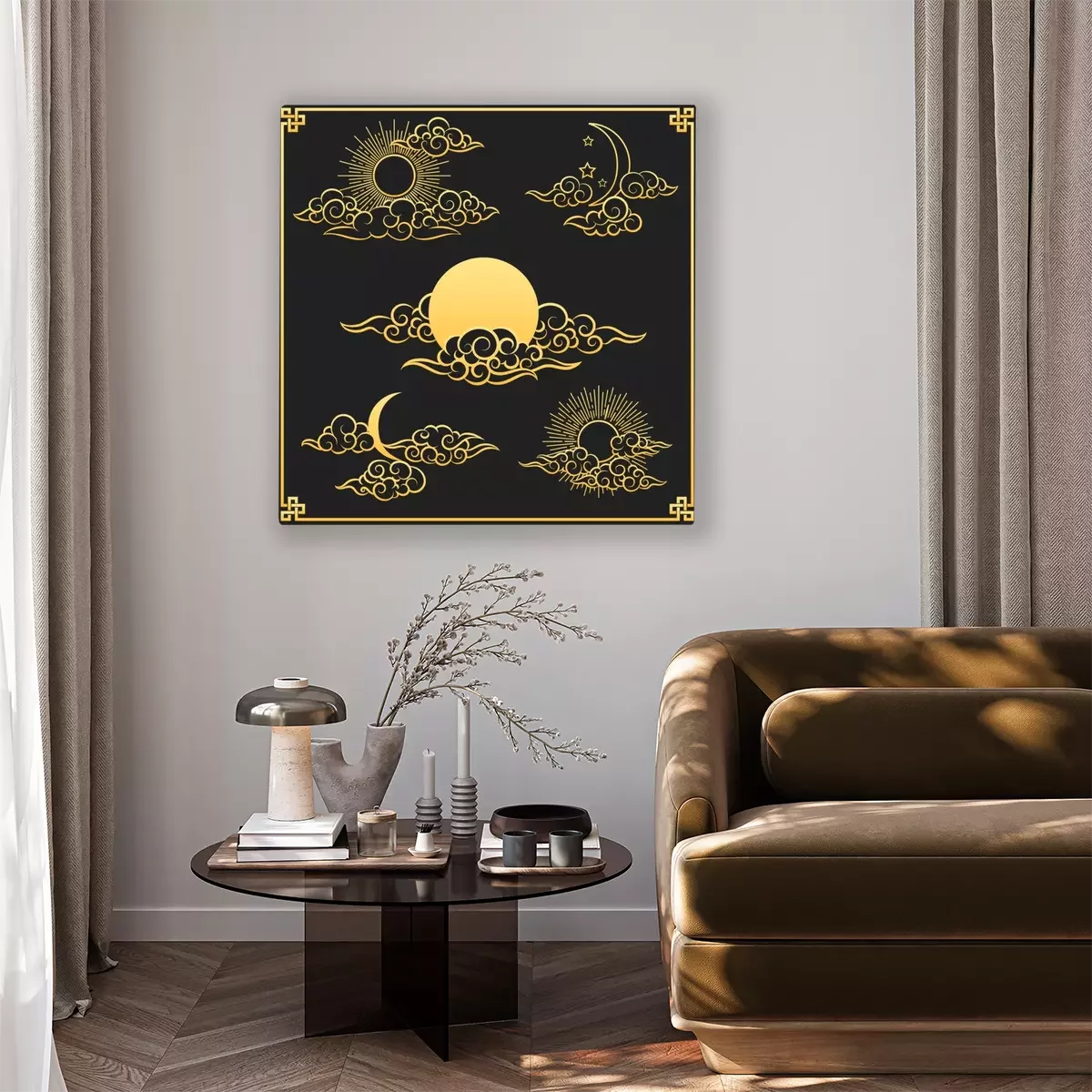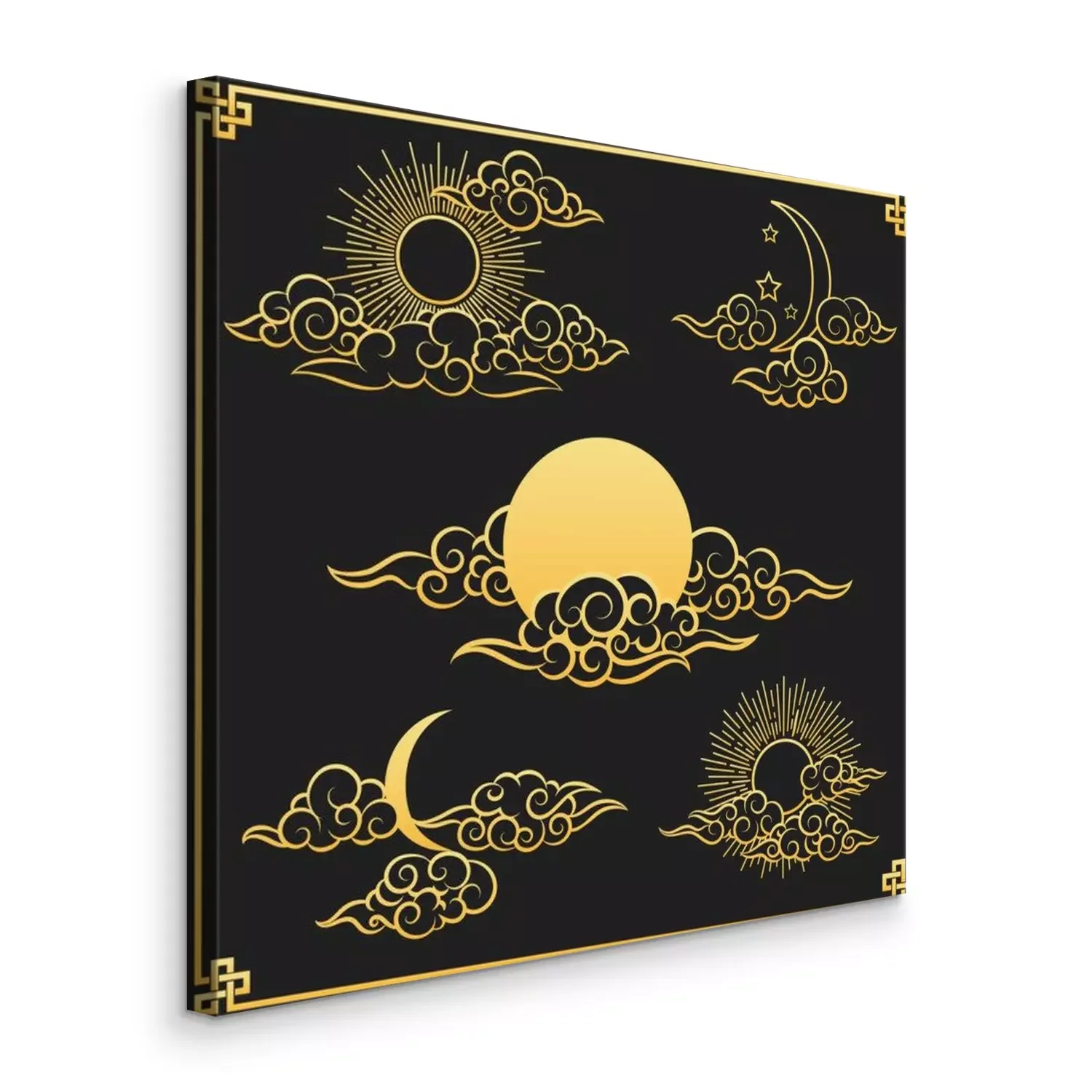 Tableau : Oriental clouds, sun and moon. Gold sun and moon with clouds in old decorative traditional asian or chinese style vector illustration