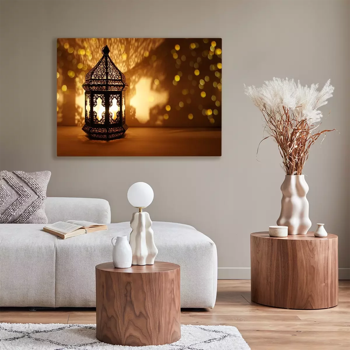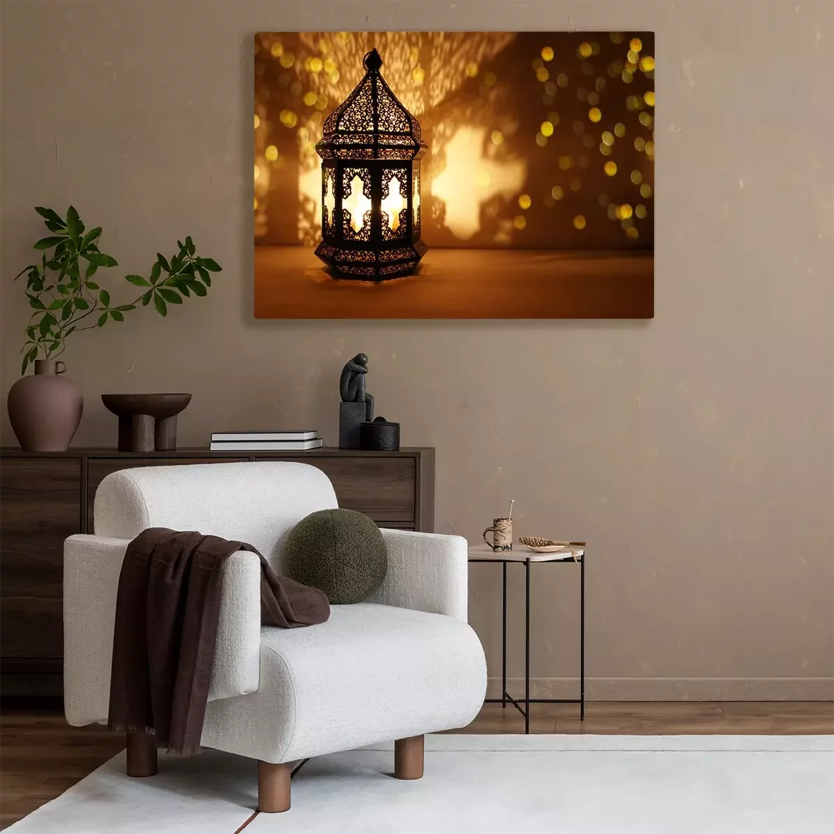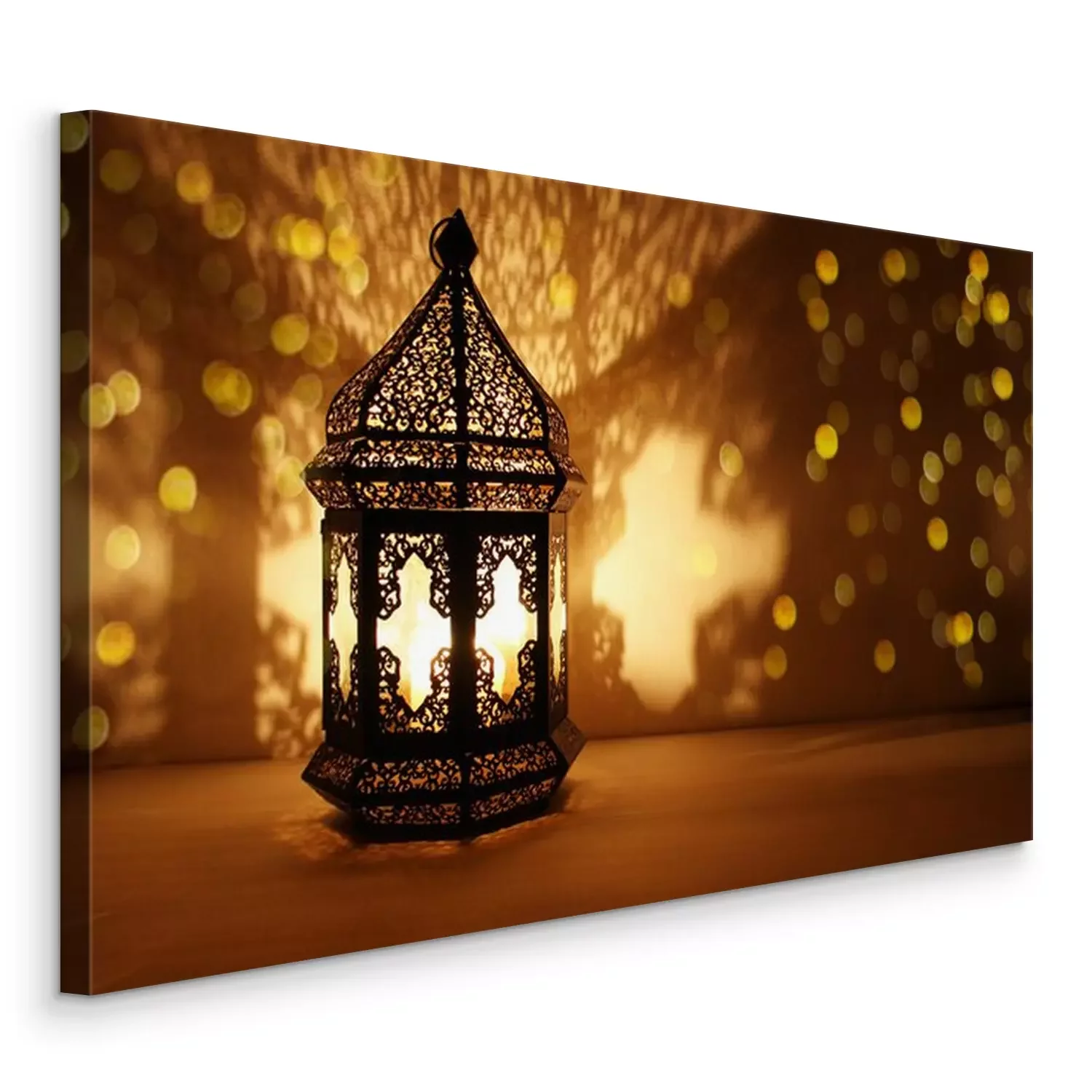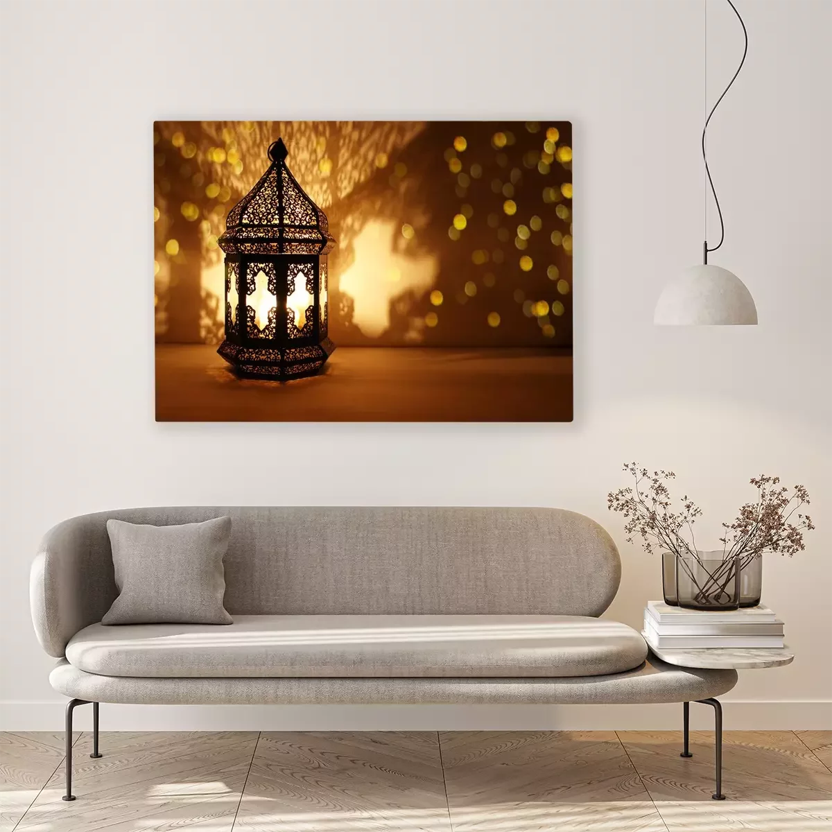 Tableau  Ornamental Arabic lantern with burning candle glowing at night and glittering golden bokeh lights. Festive greeting card, invitation for Muslim holy month Ramadan Kareem. Dark background.