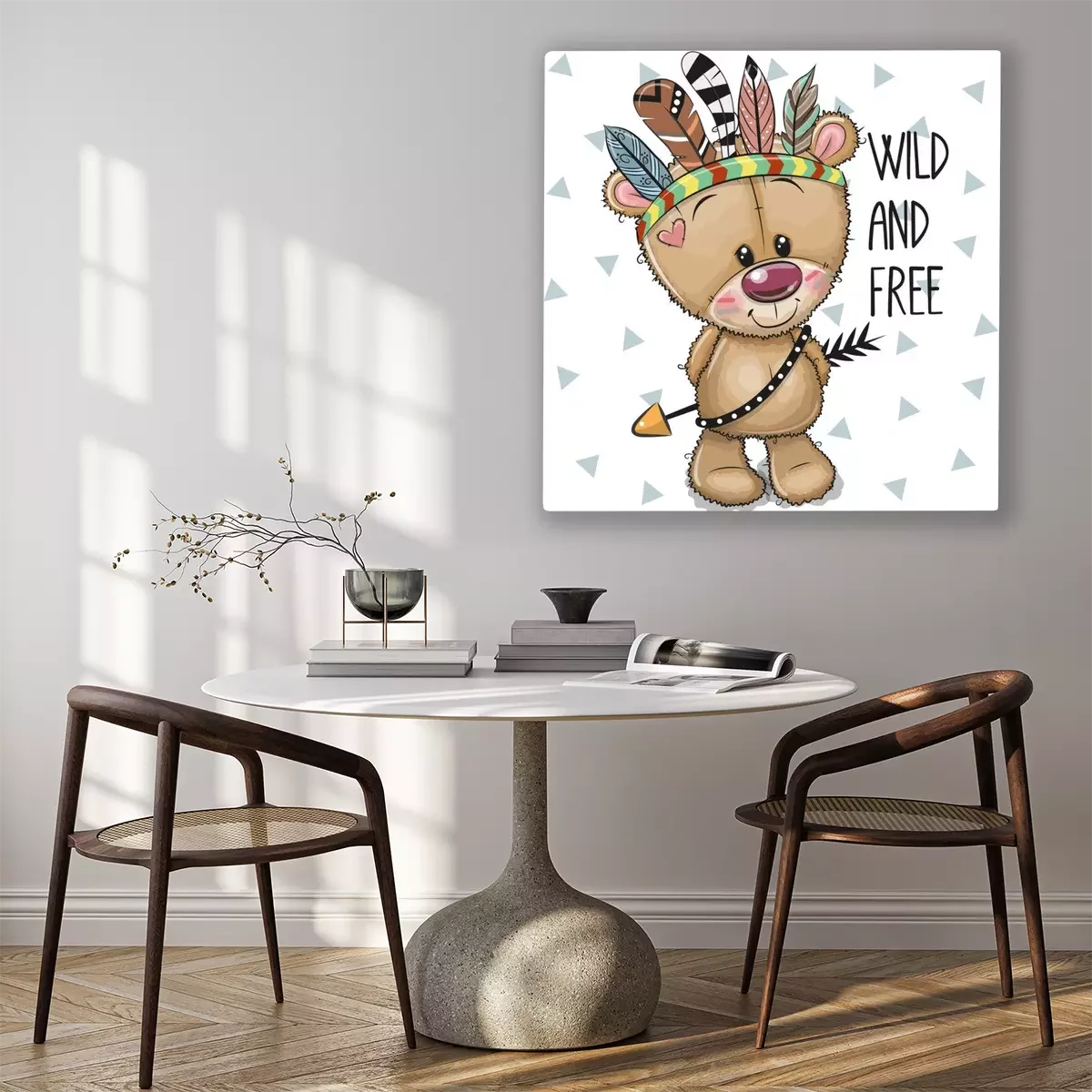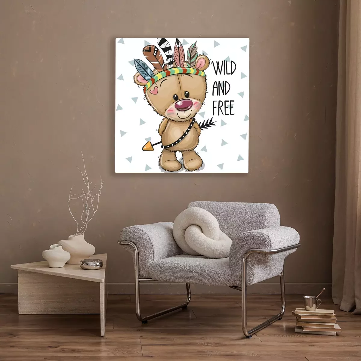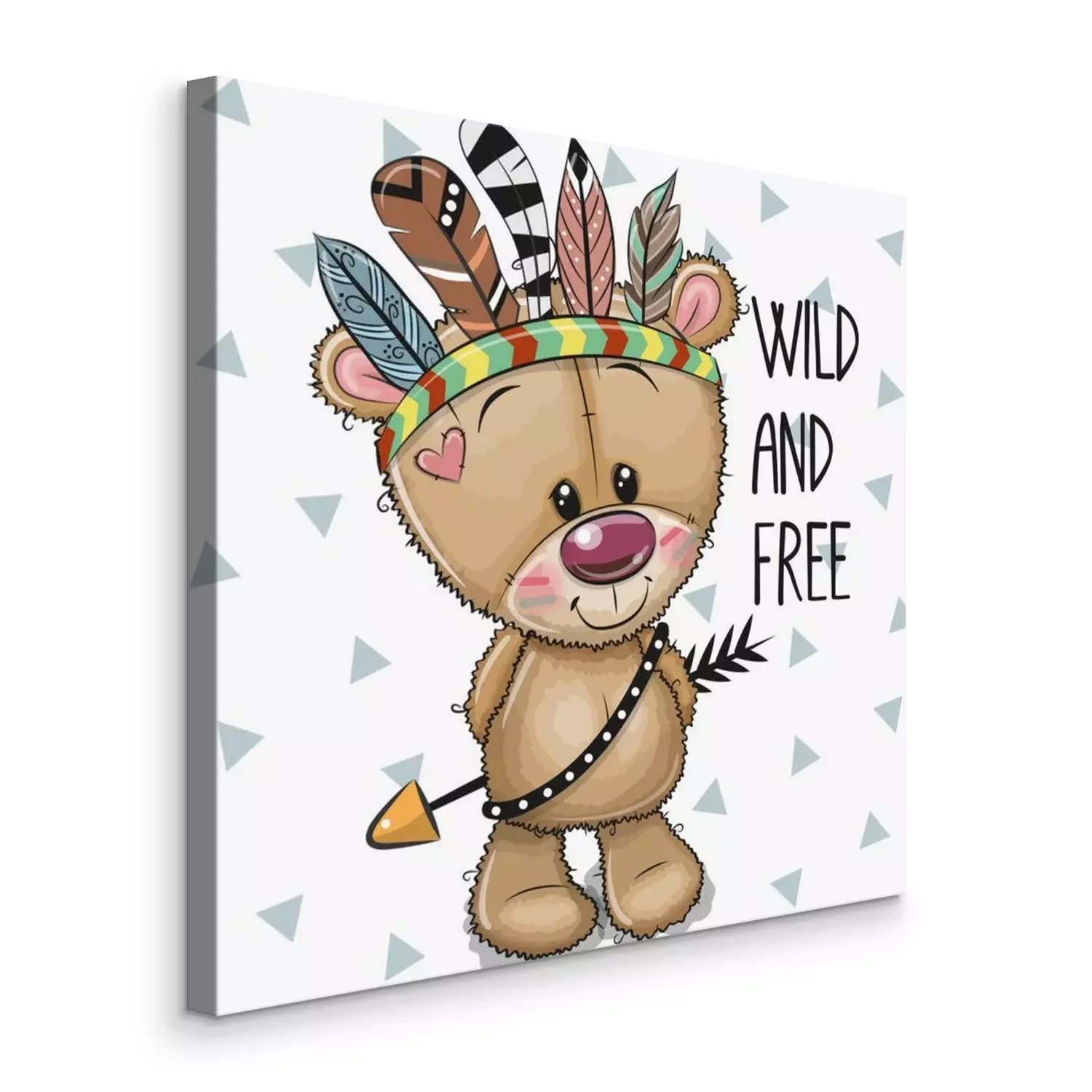Tableau : Ours en peluche dans un bandeau avec des plumes colorées