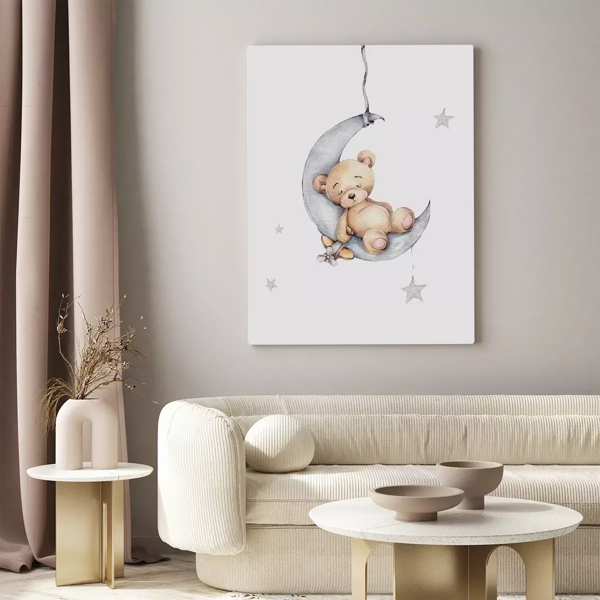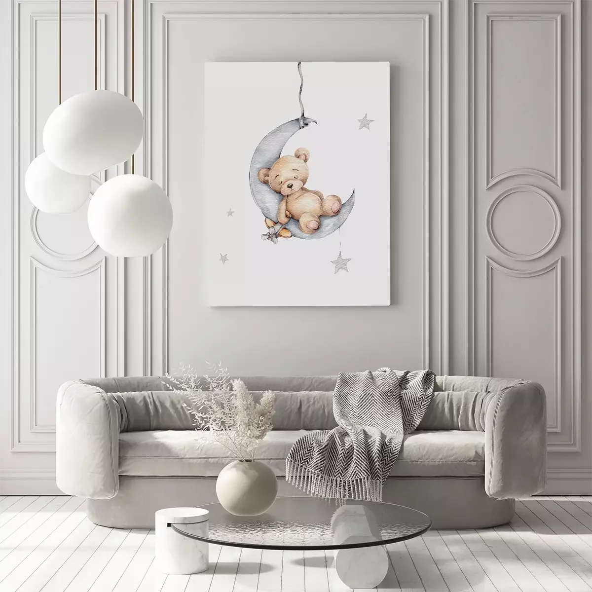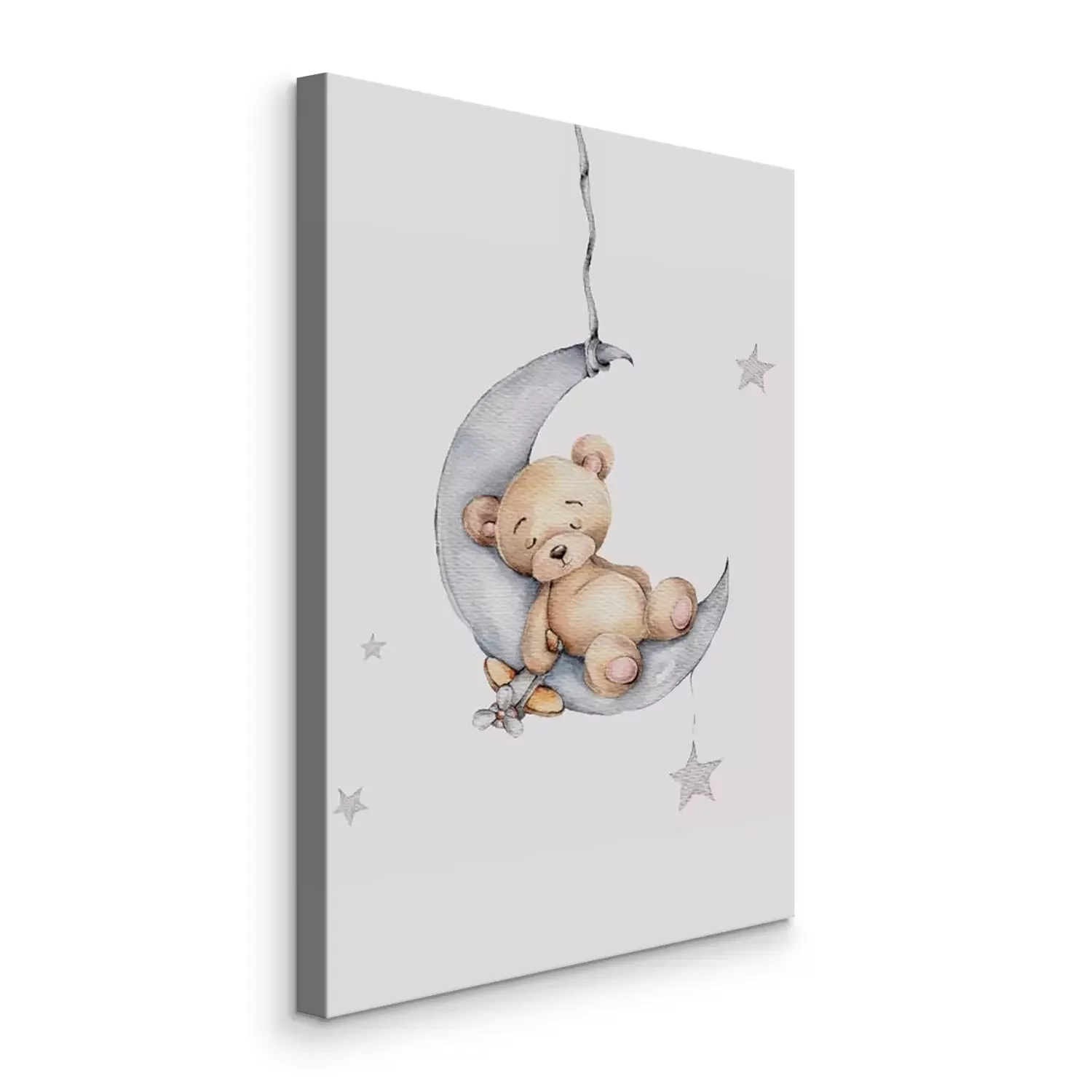 Ours en peluche dans un paysage de lune grise avec des étoiles