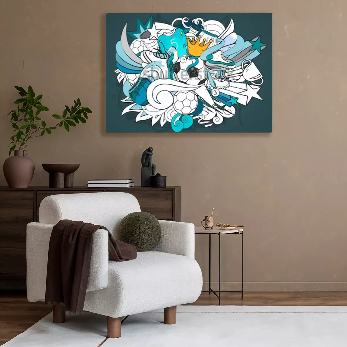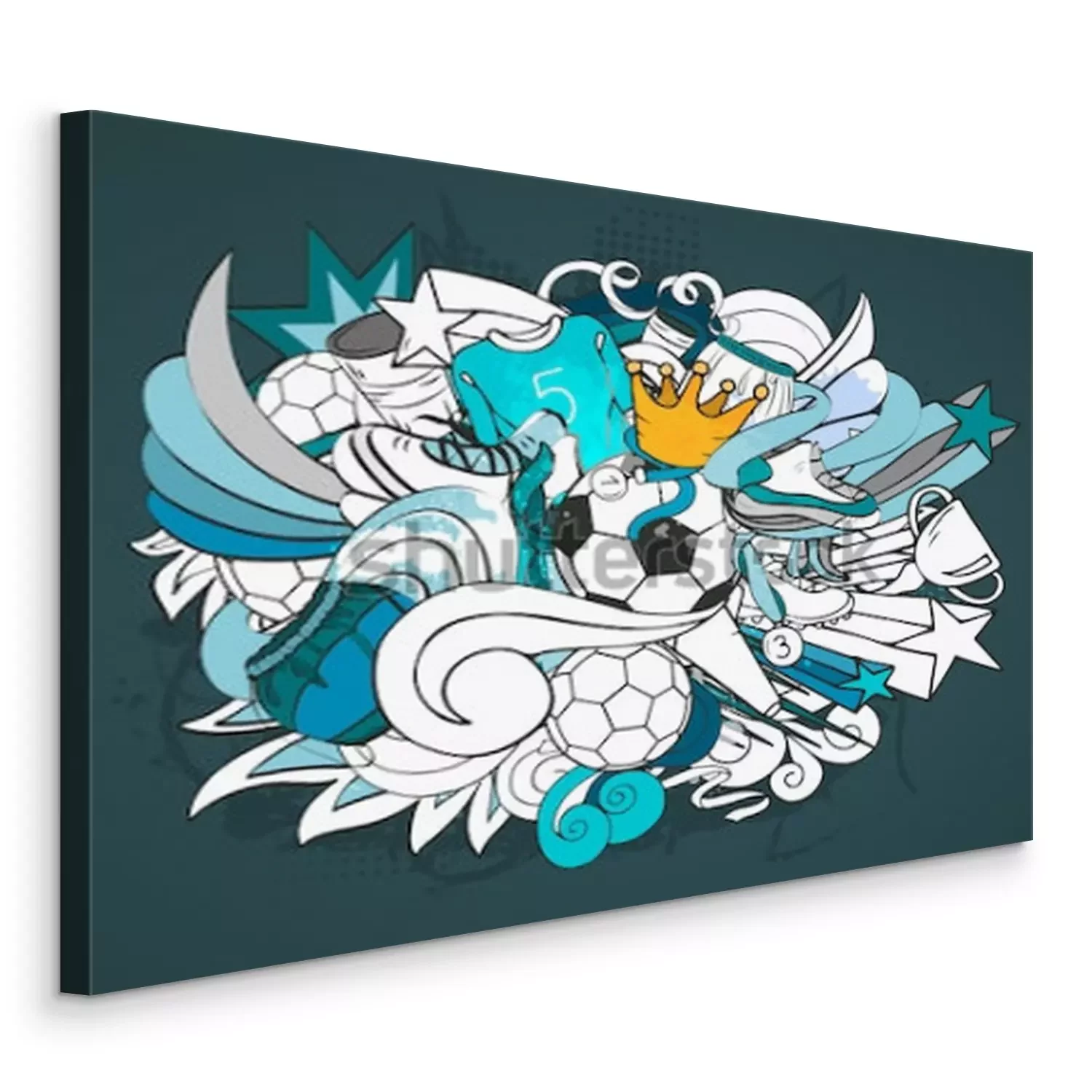 Tableau  Outline vector football banner with ball, soccer objects and decoration elements in white and blue colors on navy background