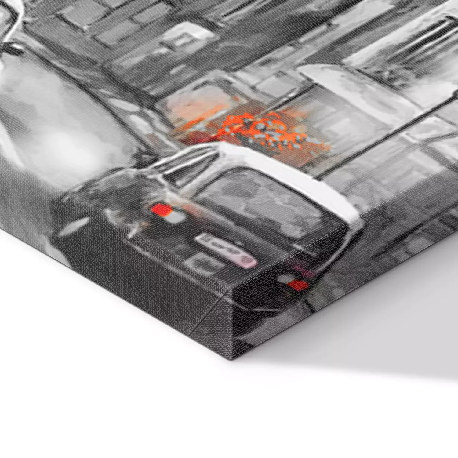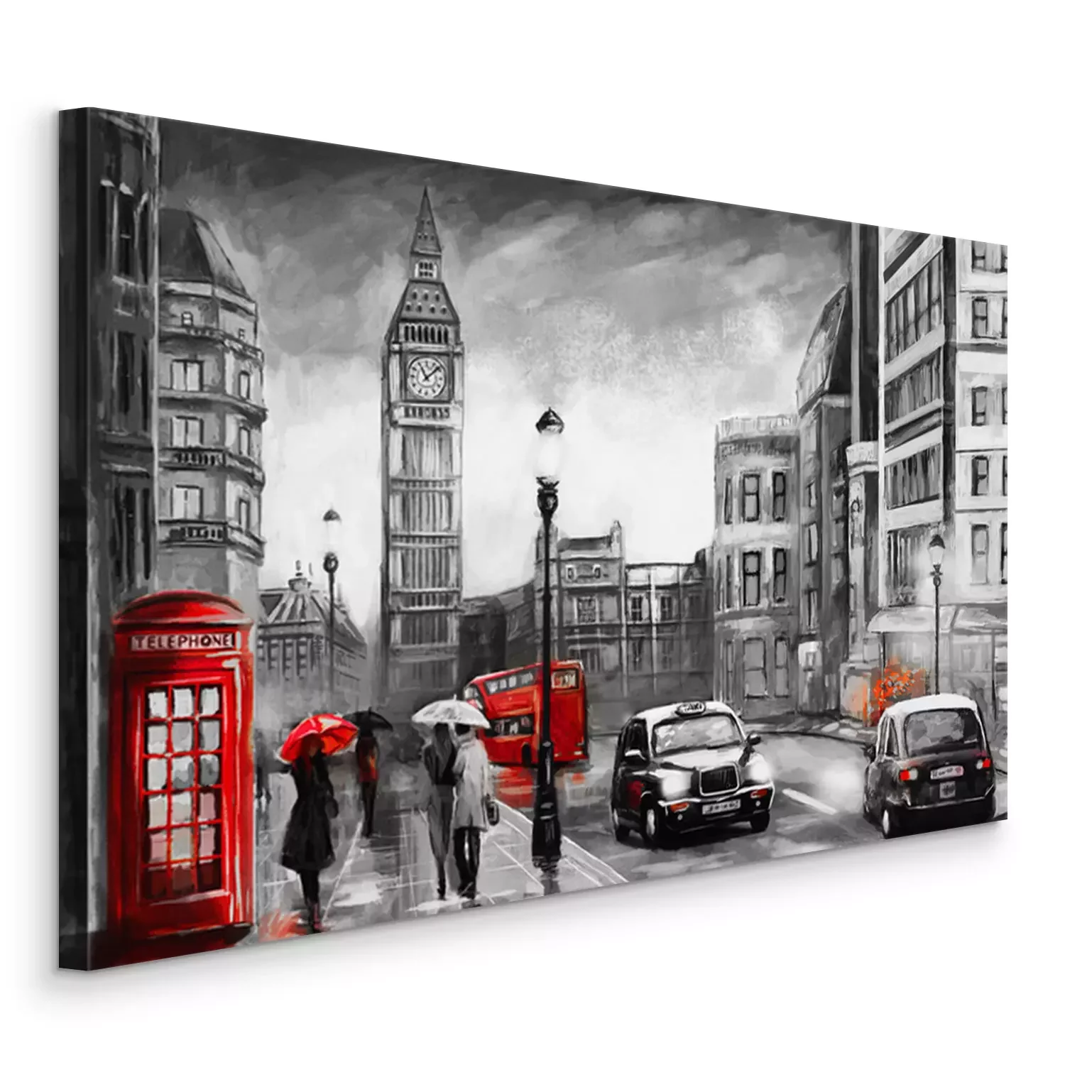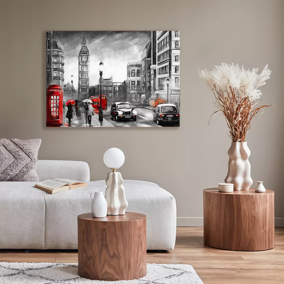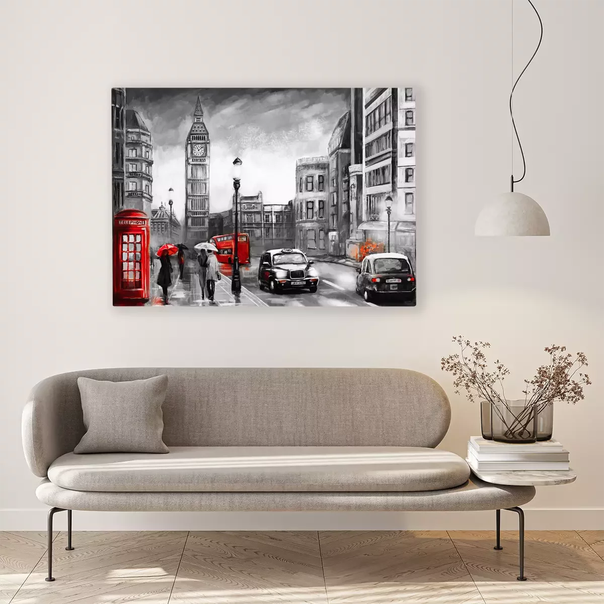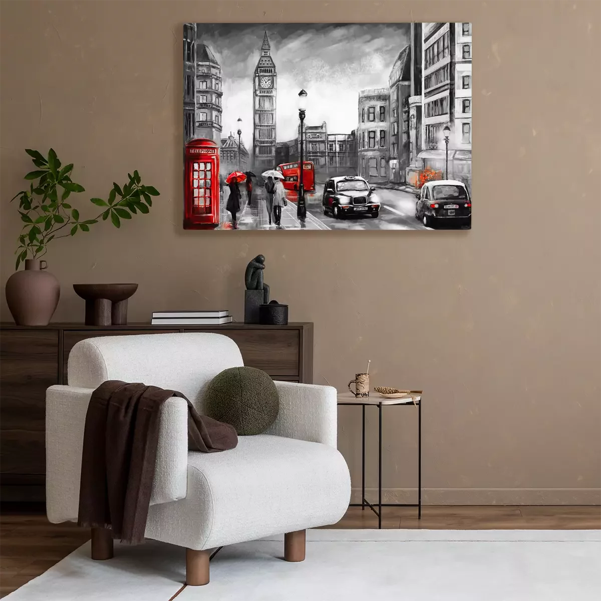 Peinture à l'huile sur toile, vue sur rue de Londres. Ouvrages d'art. Big ben. Couple et parapluie rouge, bus et route, téléphone. Voiture noire - taxi. Angleterre