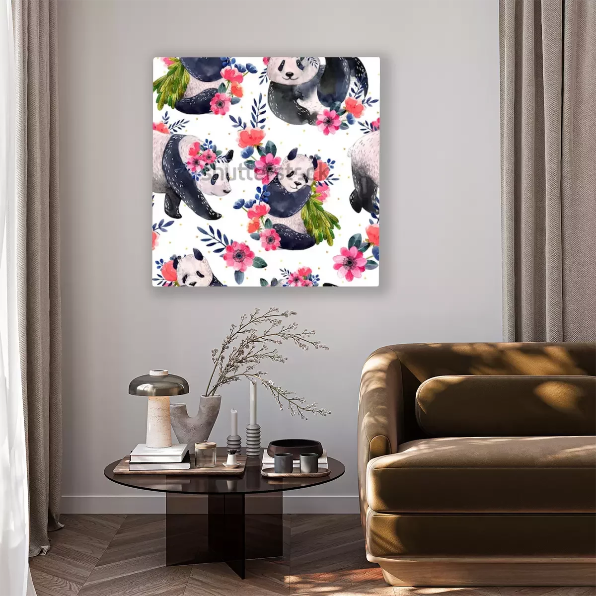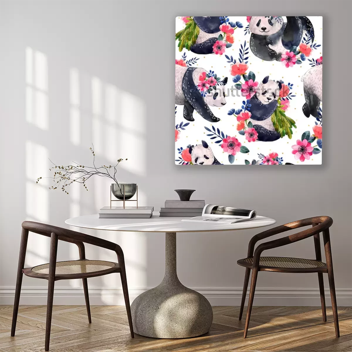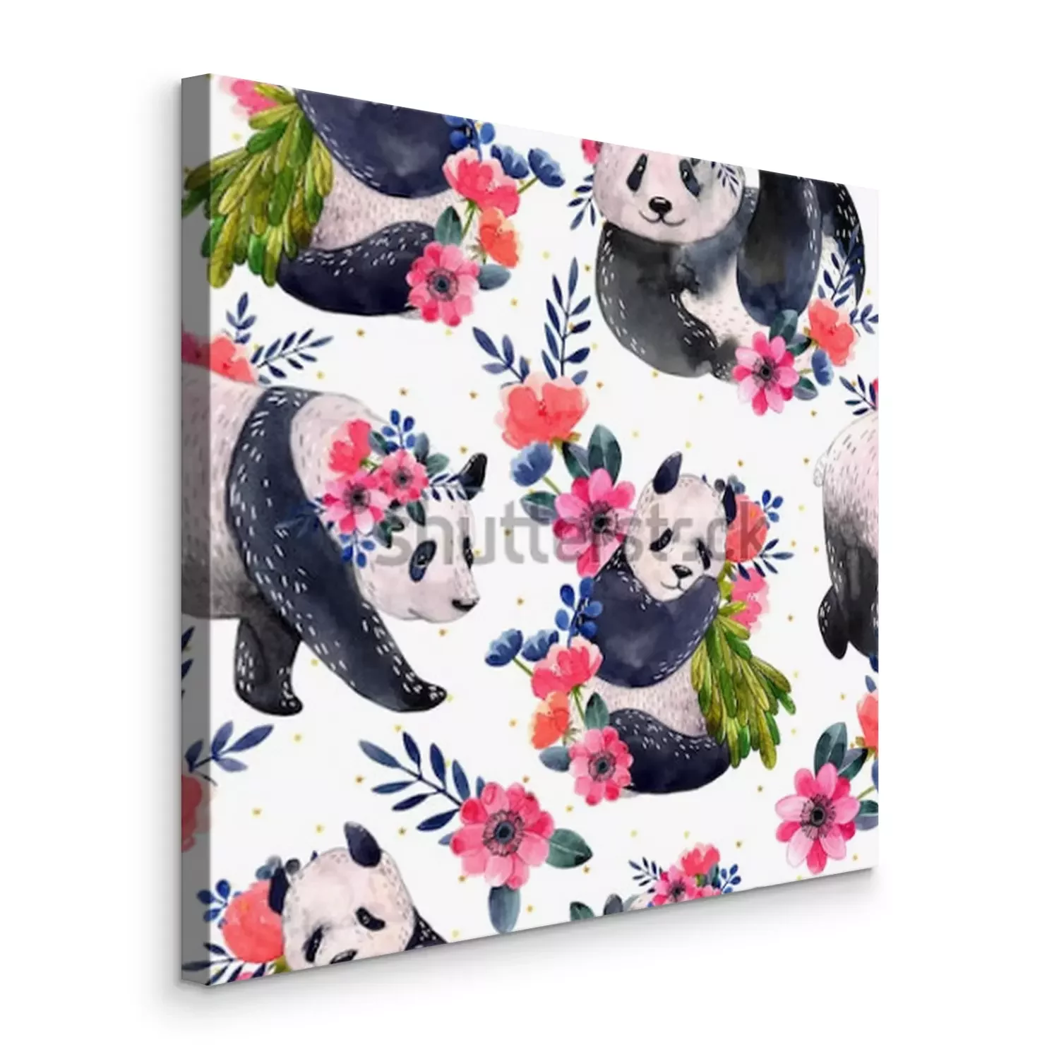 Tableau : Pandas dans différentes poses décorées de fleurs