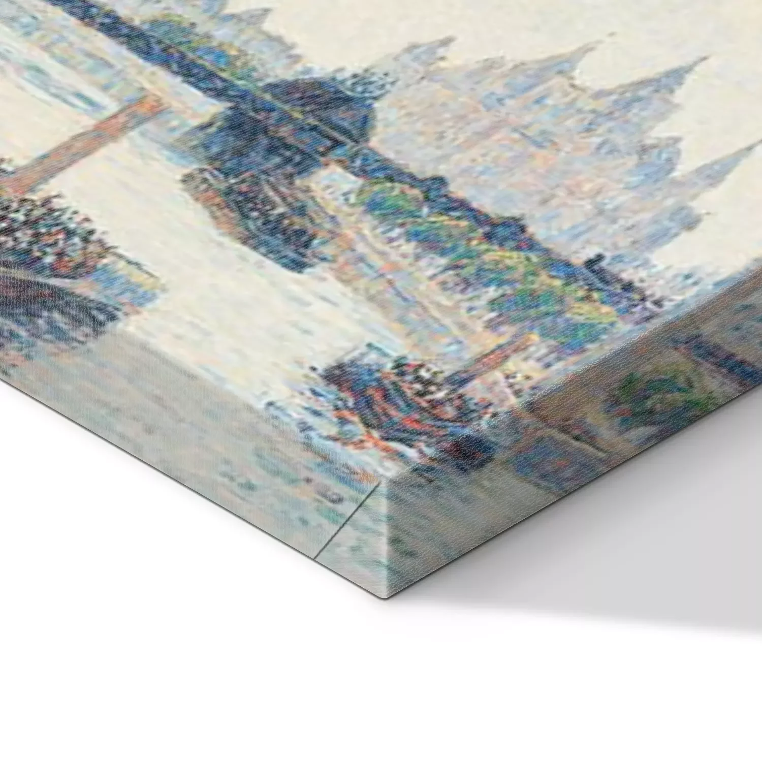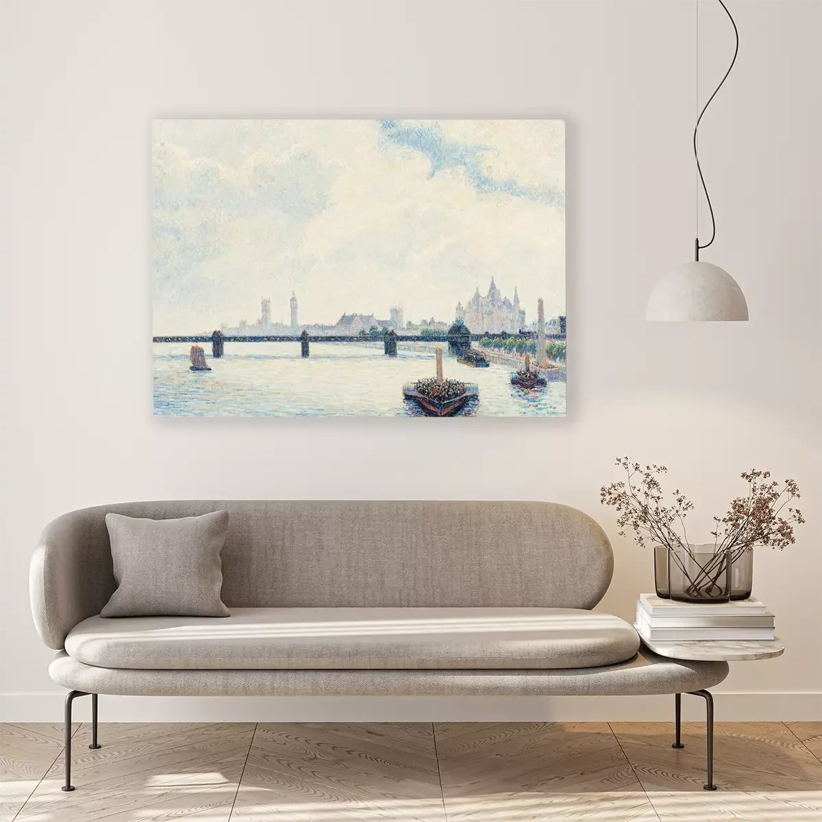Panorama de la ville avec des bateaux dans la brume ensoleillée