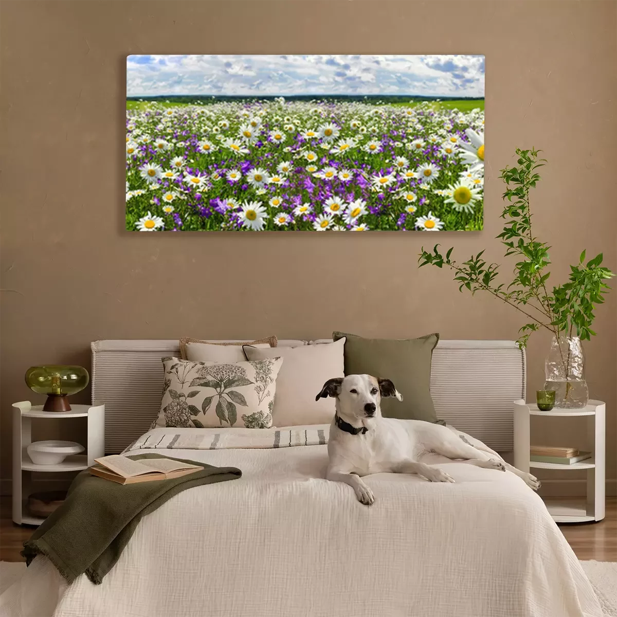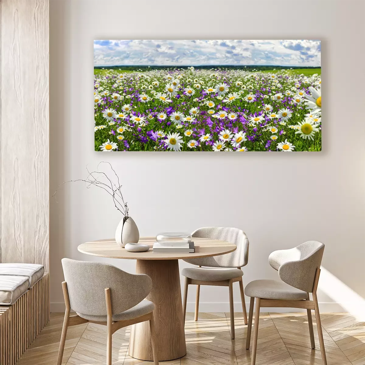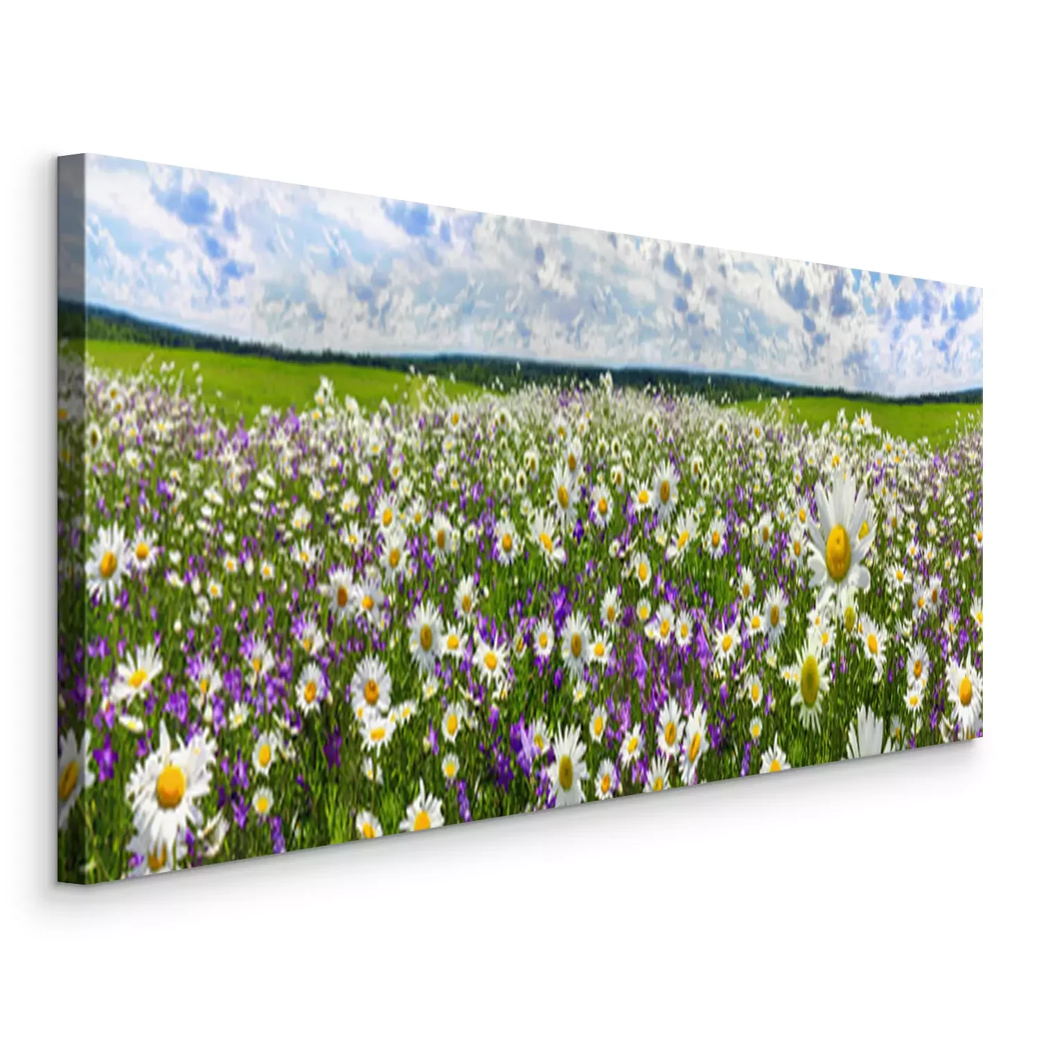 Tableau : panorama de paysage de printemps avec des fleurs en fleurs sur Prairie